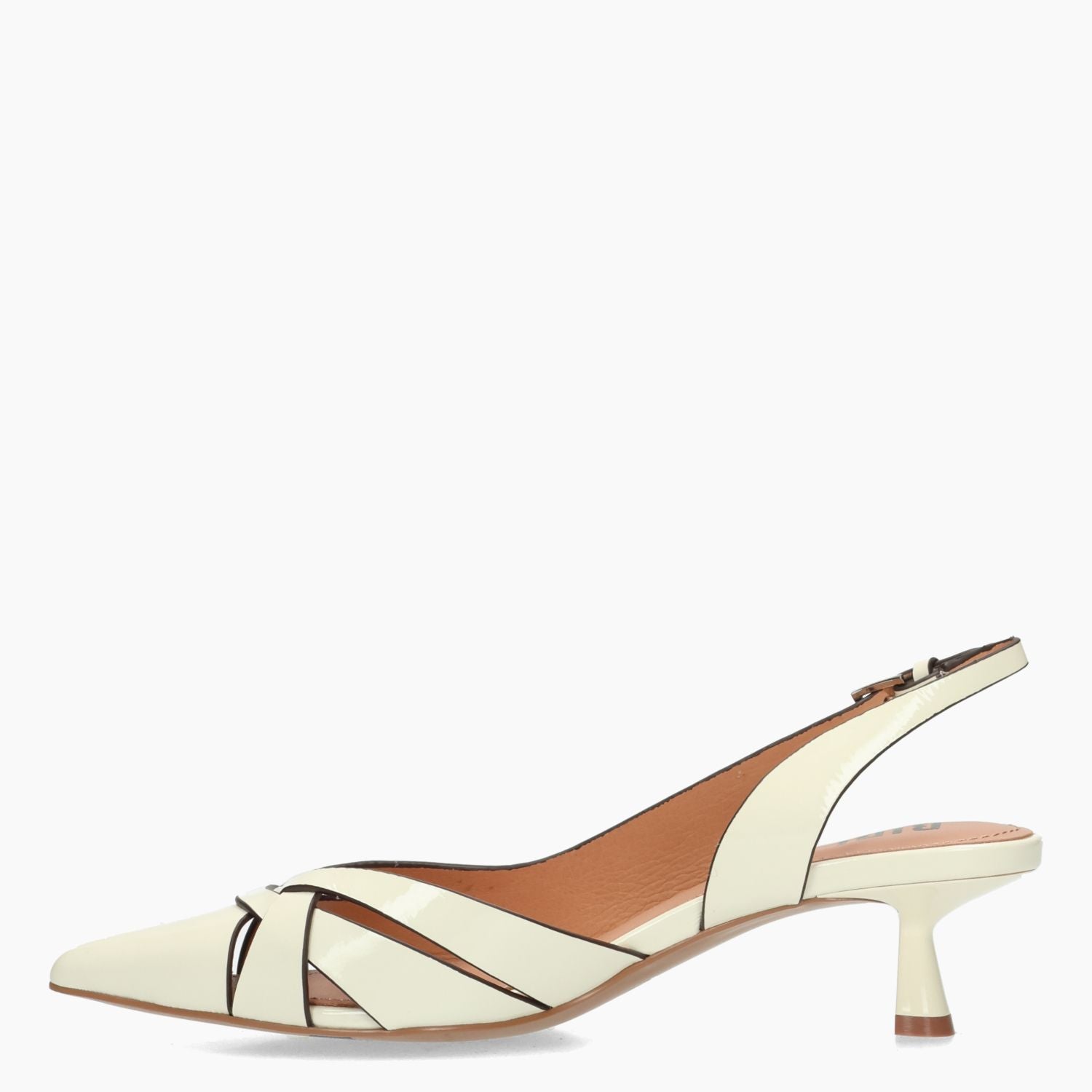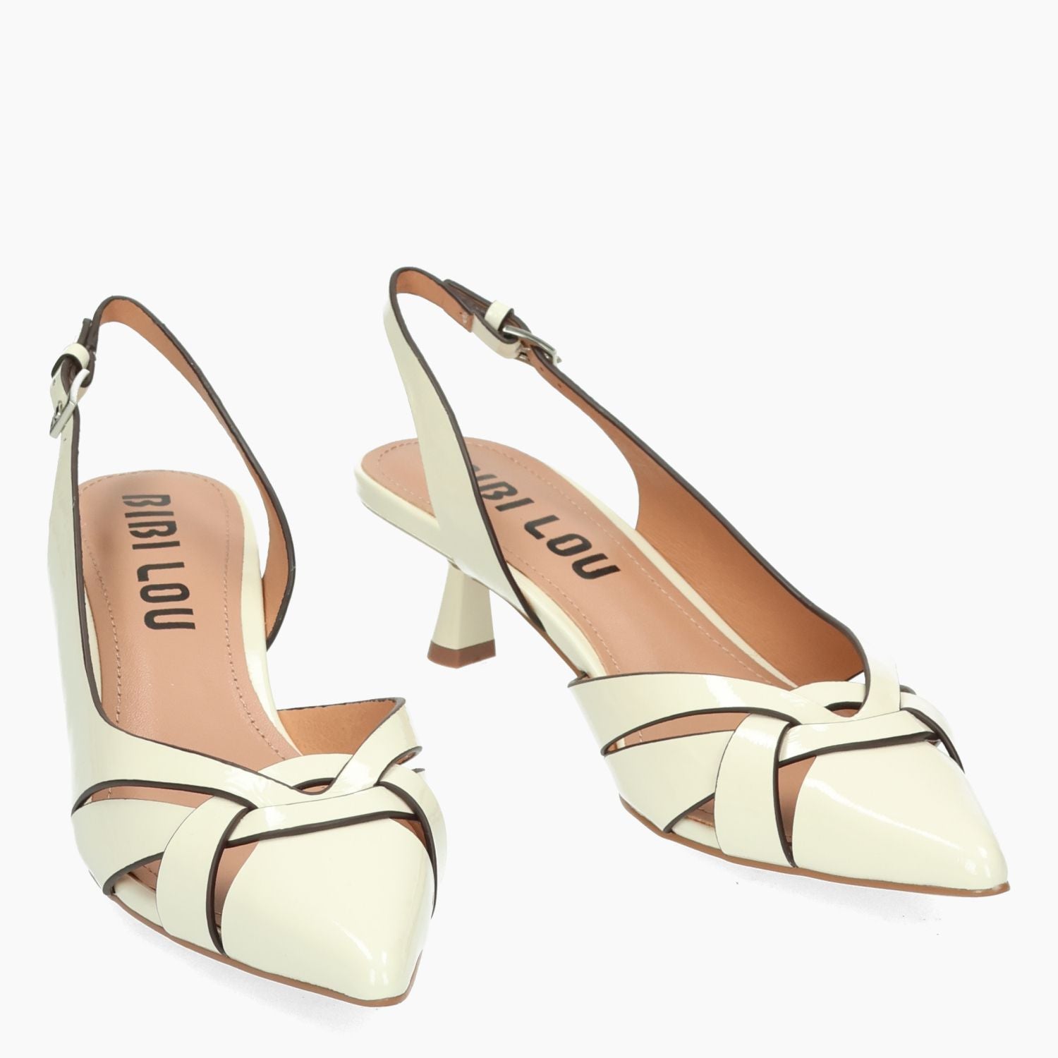 Chanel in pelle verniciata avorio con cinturino regolabile. Interno in pelle. Suola in gomma con tacco di 4 cm. Collezione Bibi Lou donna primavera/estate.