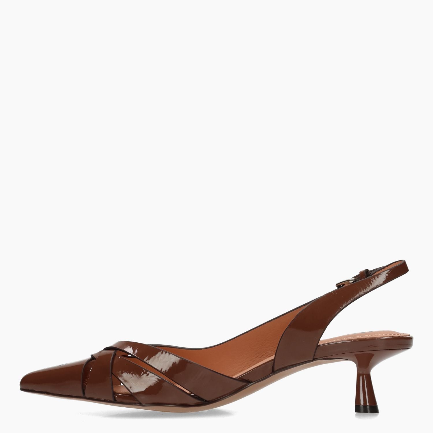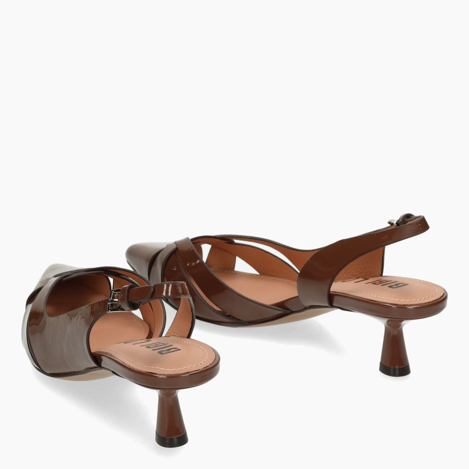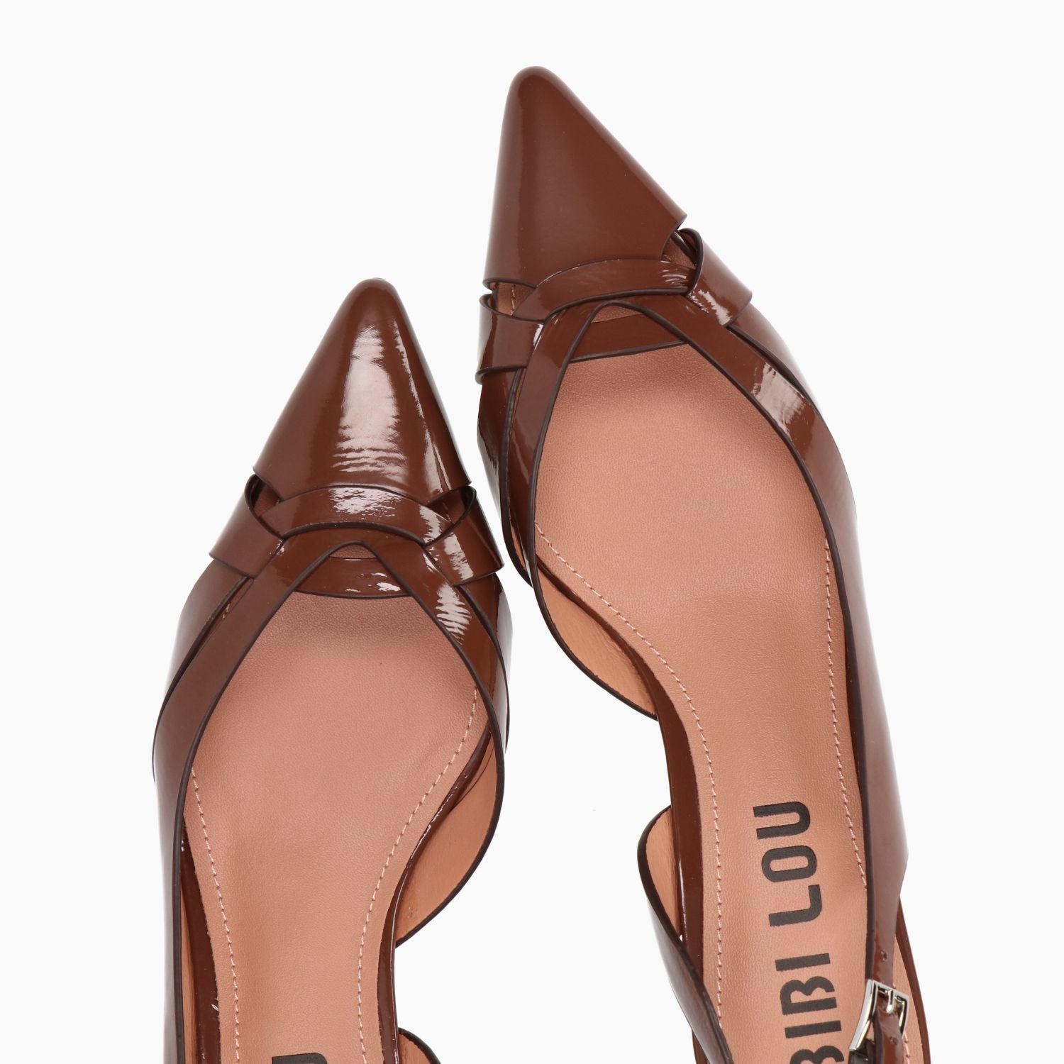Chanel in pelle verniciata marrone con cinturino regolabile. Interno in pelle. Suola in gomma con tacco di 4 cm. Collezione Bibi Lou donna primavera/estate.