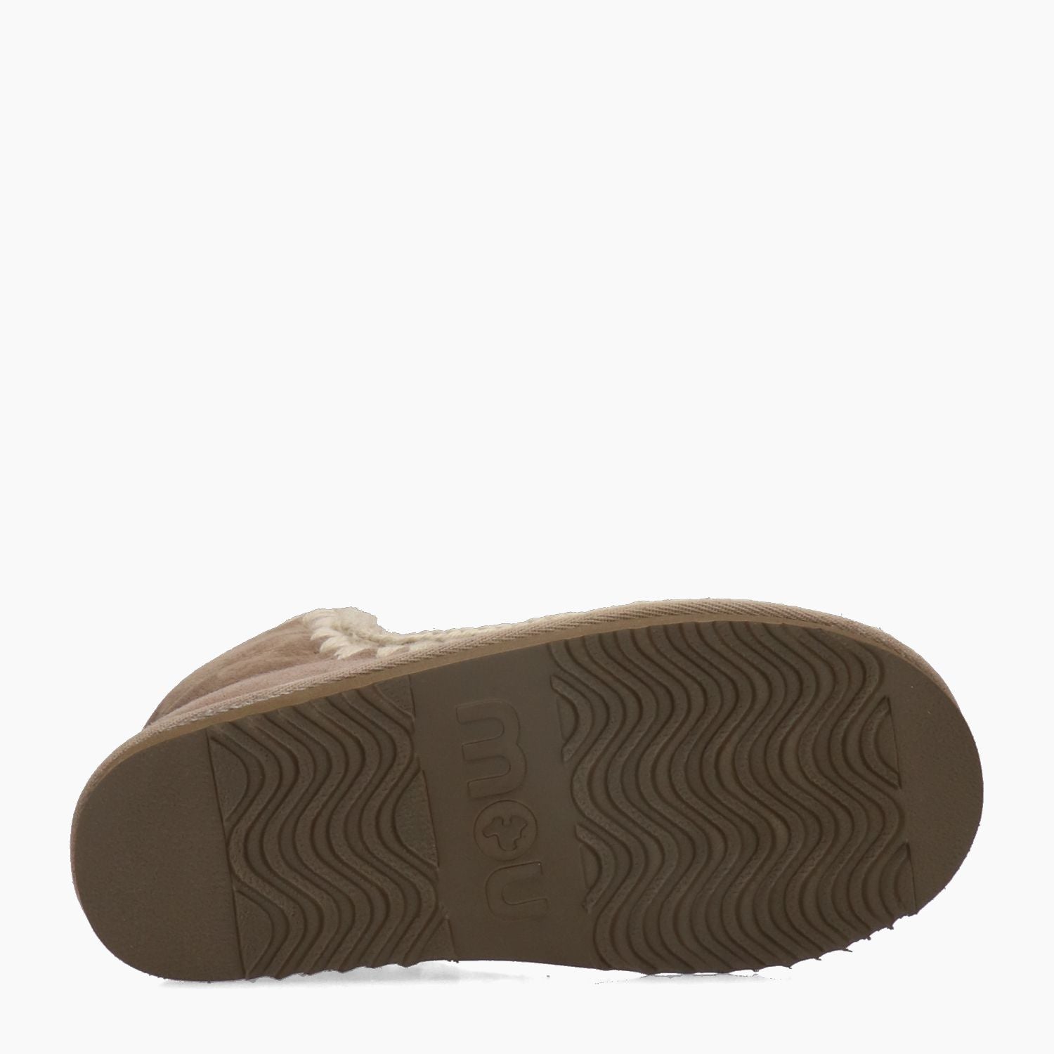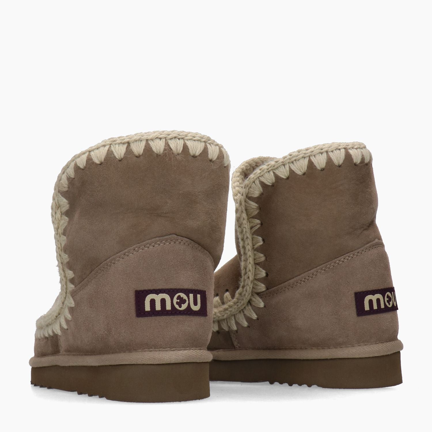 Mou Eskimo 18 con tomaia in pelle scamosciata in colore beige. Cuciture a contrasto in lana beige melange. Punta tonda. Logo in tessuto nel tallone. Interno in vero pelo. Suola in gomma. Collezione Mou donna Autunno/Inverno.