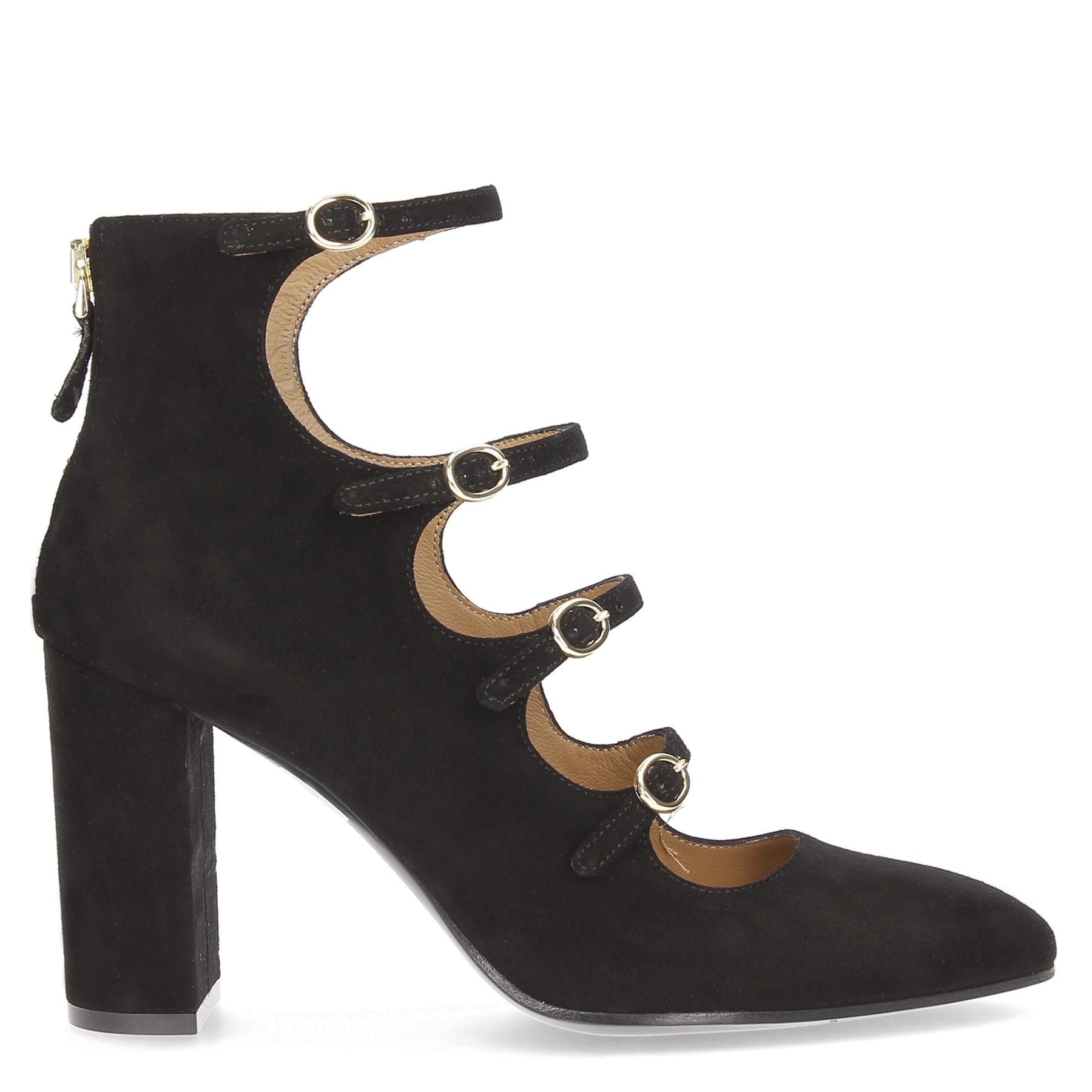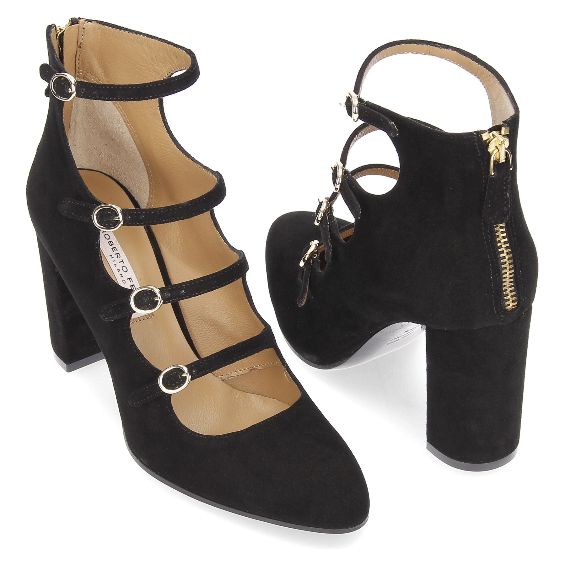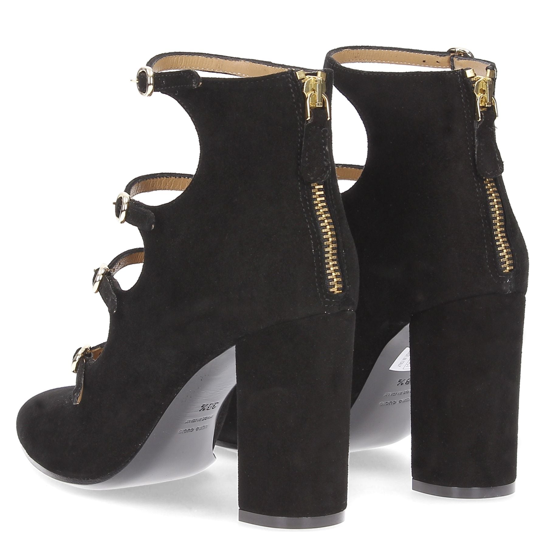 Stivaletti in camoscio nero con quattro fibbie regolabili, zip posteriore, tacco 80 fondo cuoio.