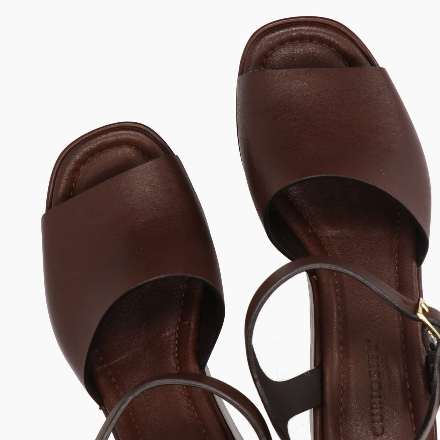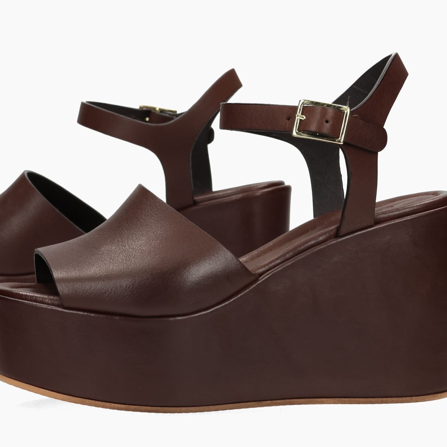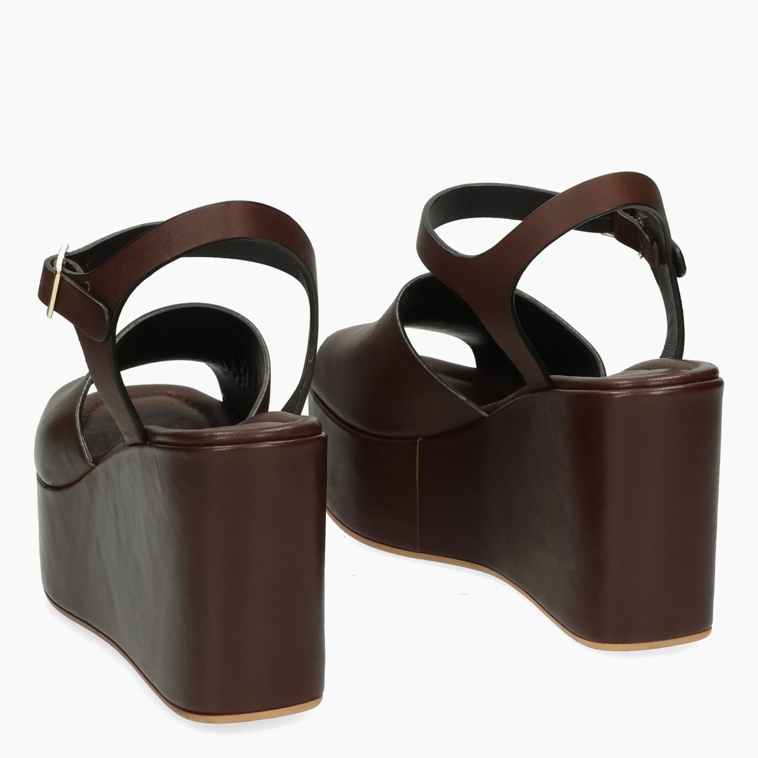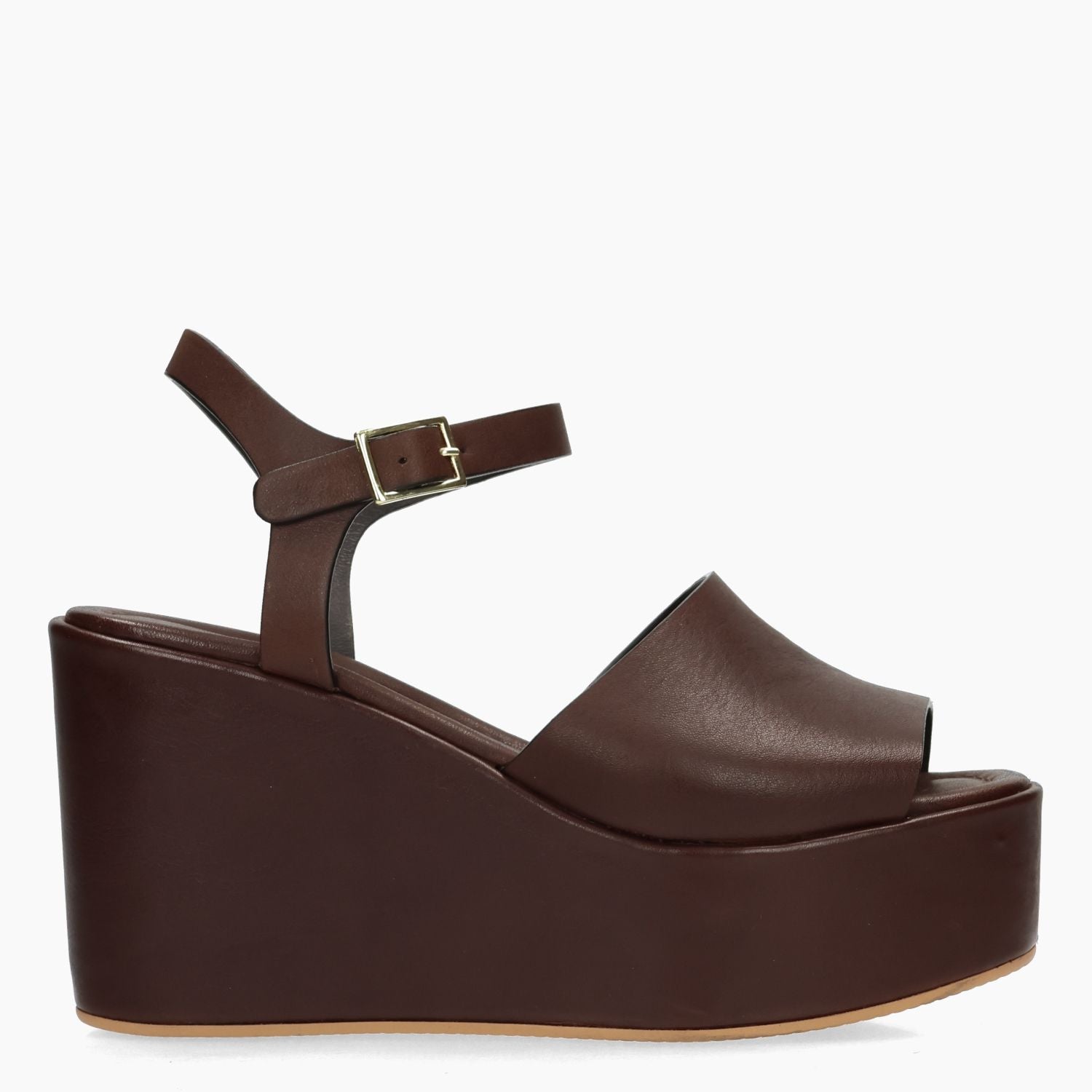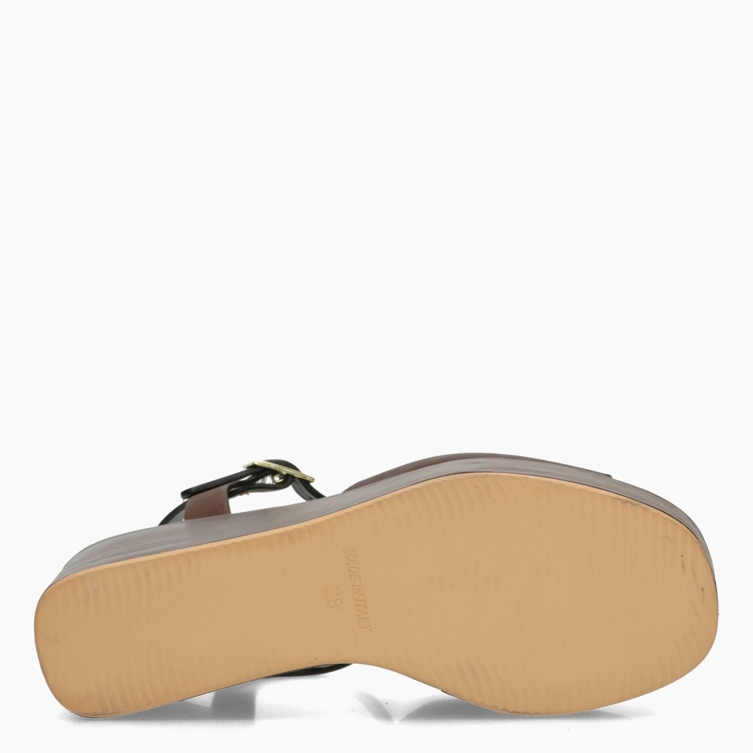 Sandalo in pelle in colore testa di moro. Chiusura con cinturino regolabile e fibbia dorata. Interno in pelle. Suola in gomma. Zeppa di 10 cm con plateau di 4,5 cm Collezione Curiosite' donna Primavera/Estate.