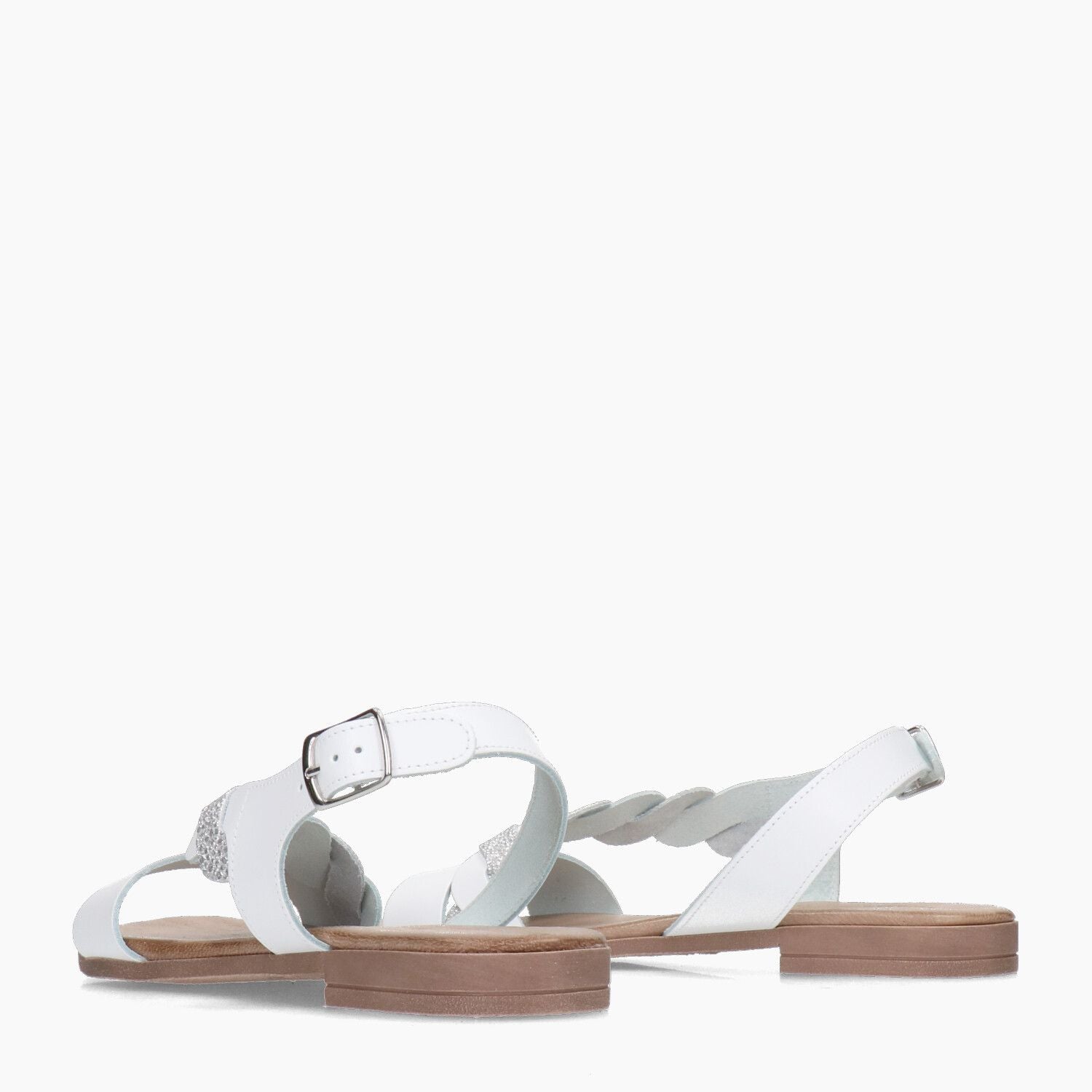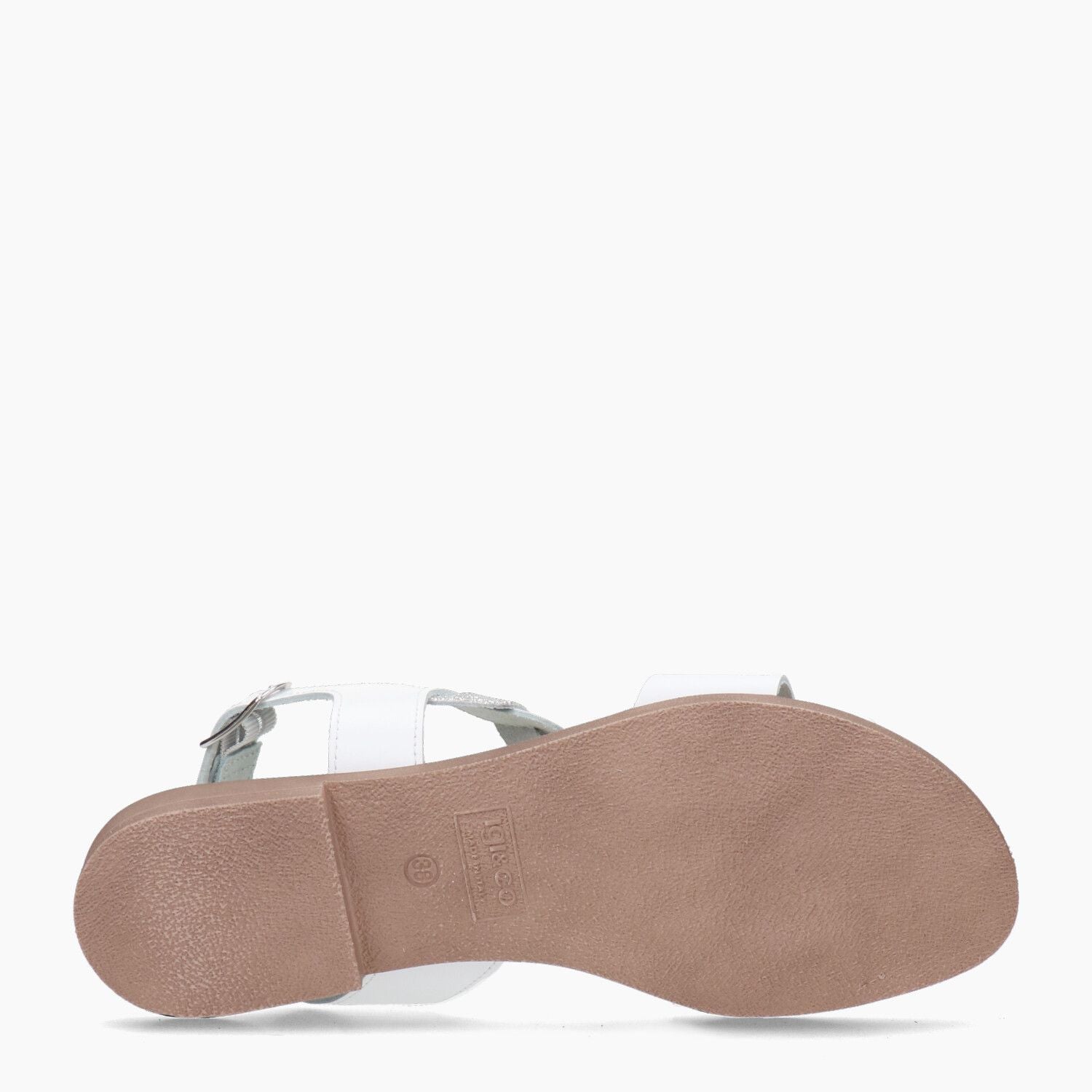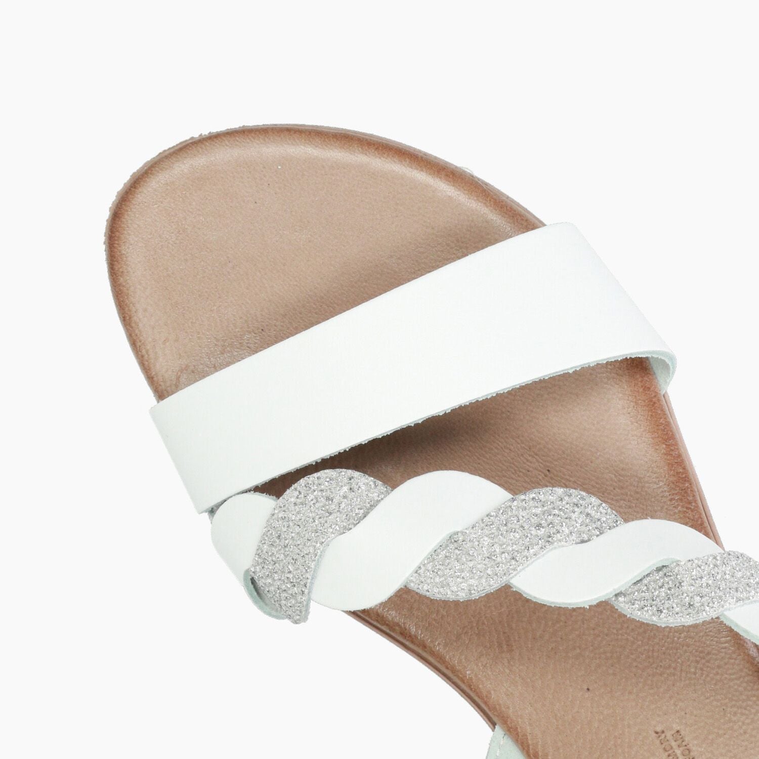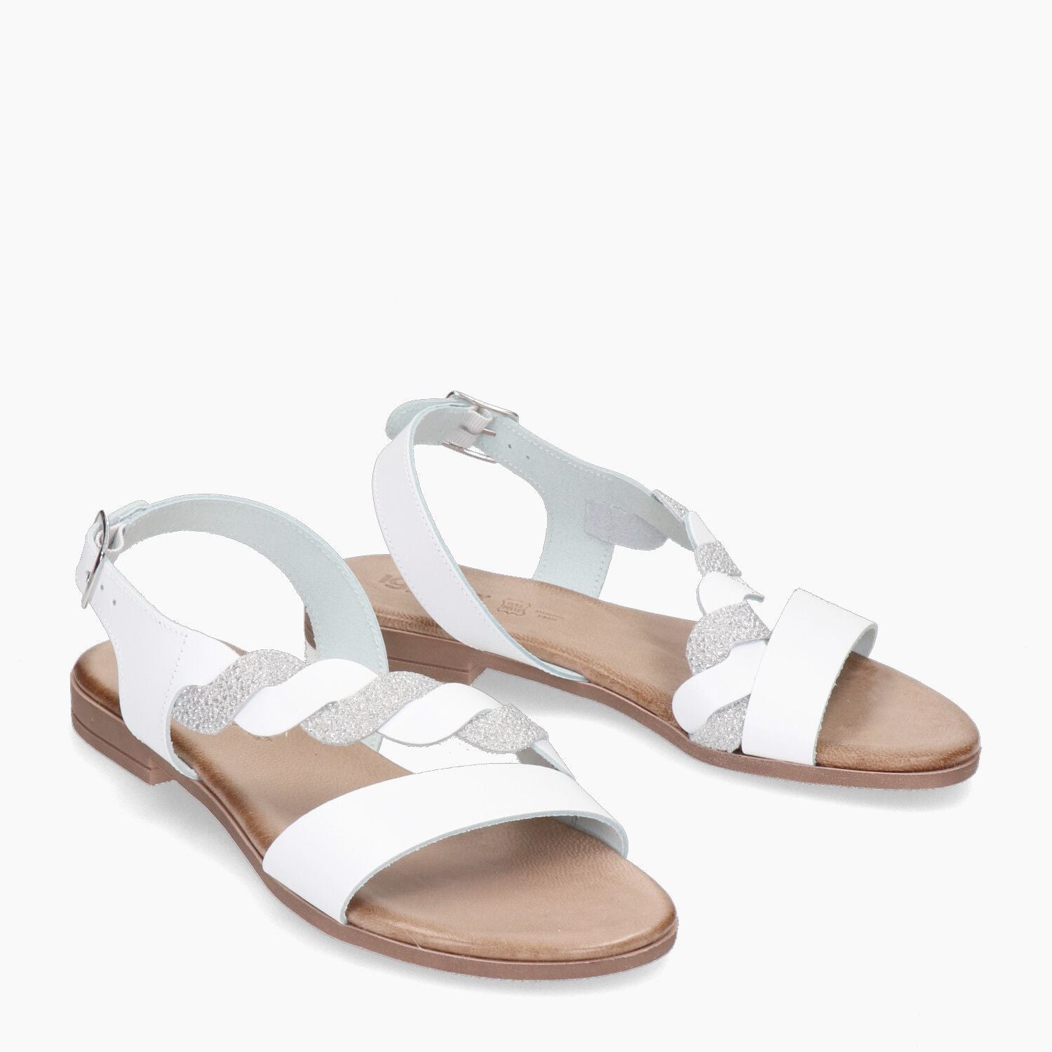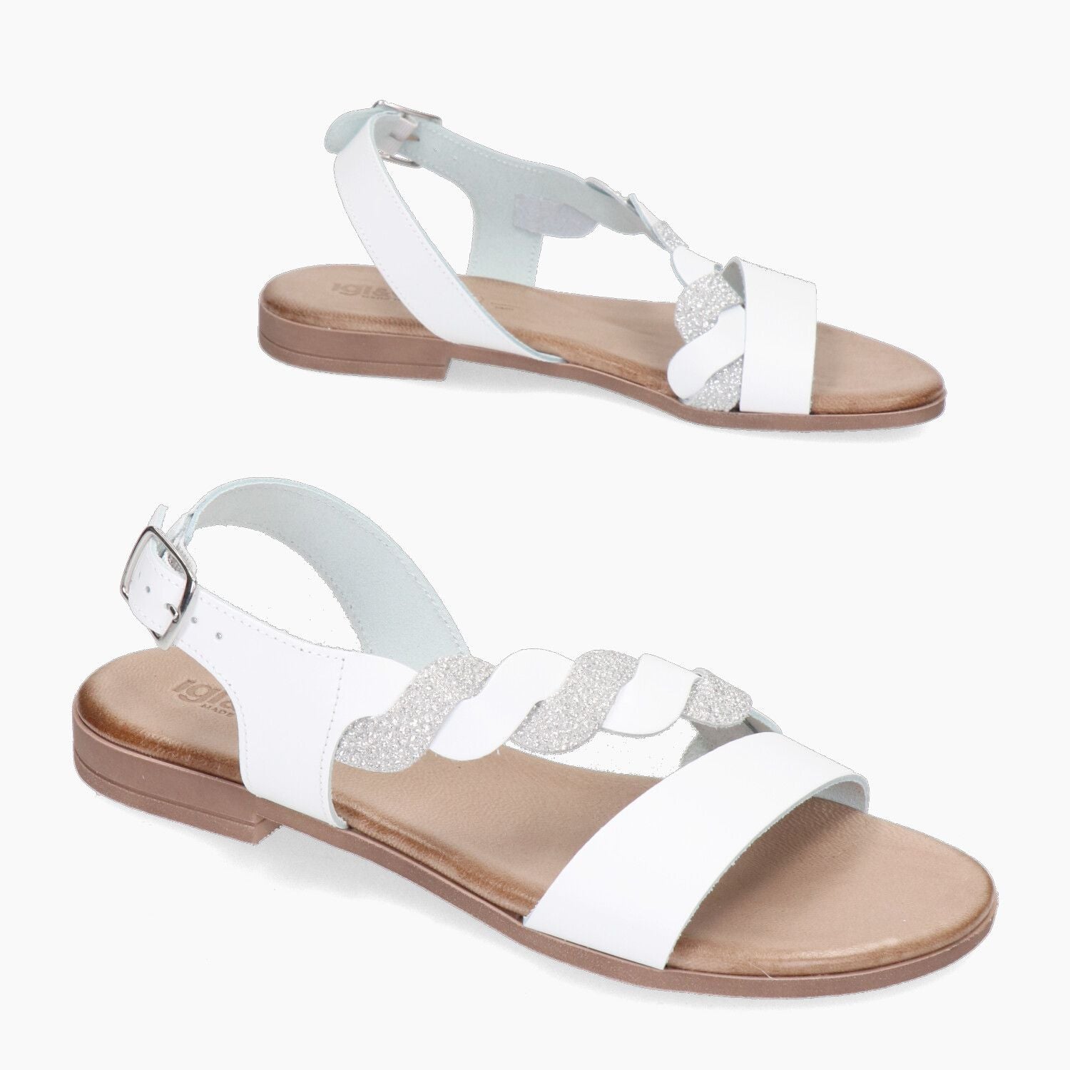 Sandali in pelle bianca e glitter argento, fondo gomma.