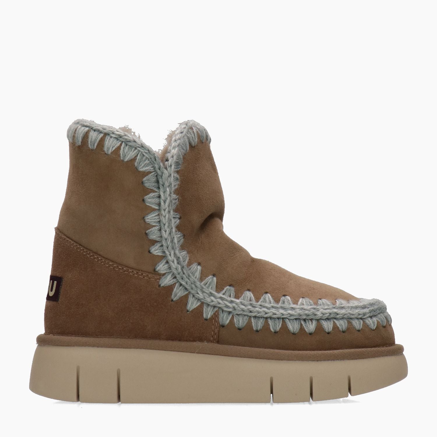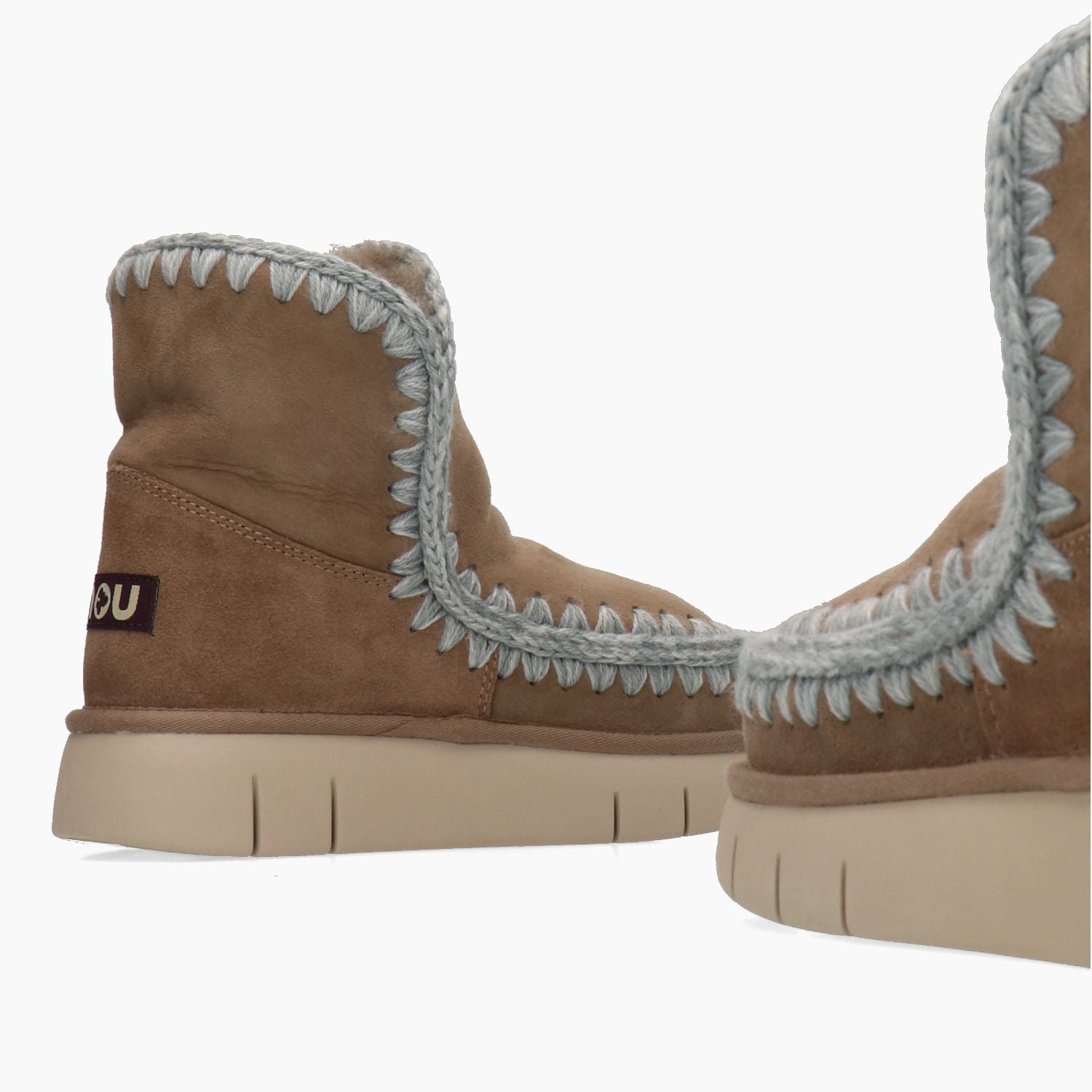 Mou Eskimo 18 modello Bounce con tomaia in pelle scamosciata in colore tortora. Cuciture a contrasto in lana grigia melange. Punta tonda. Logo in tessuto nel tallone. Interno in vero pelo. Suola in gomma. Collezione Mou donna Autunno/Inverno.