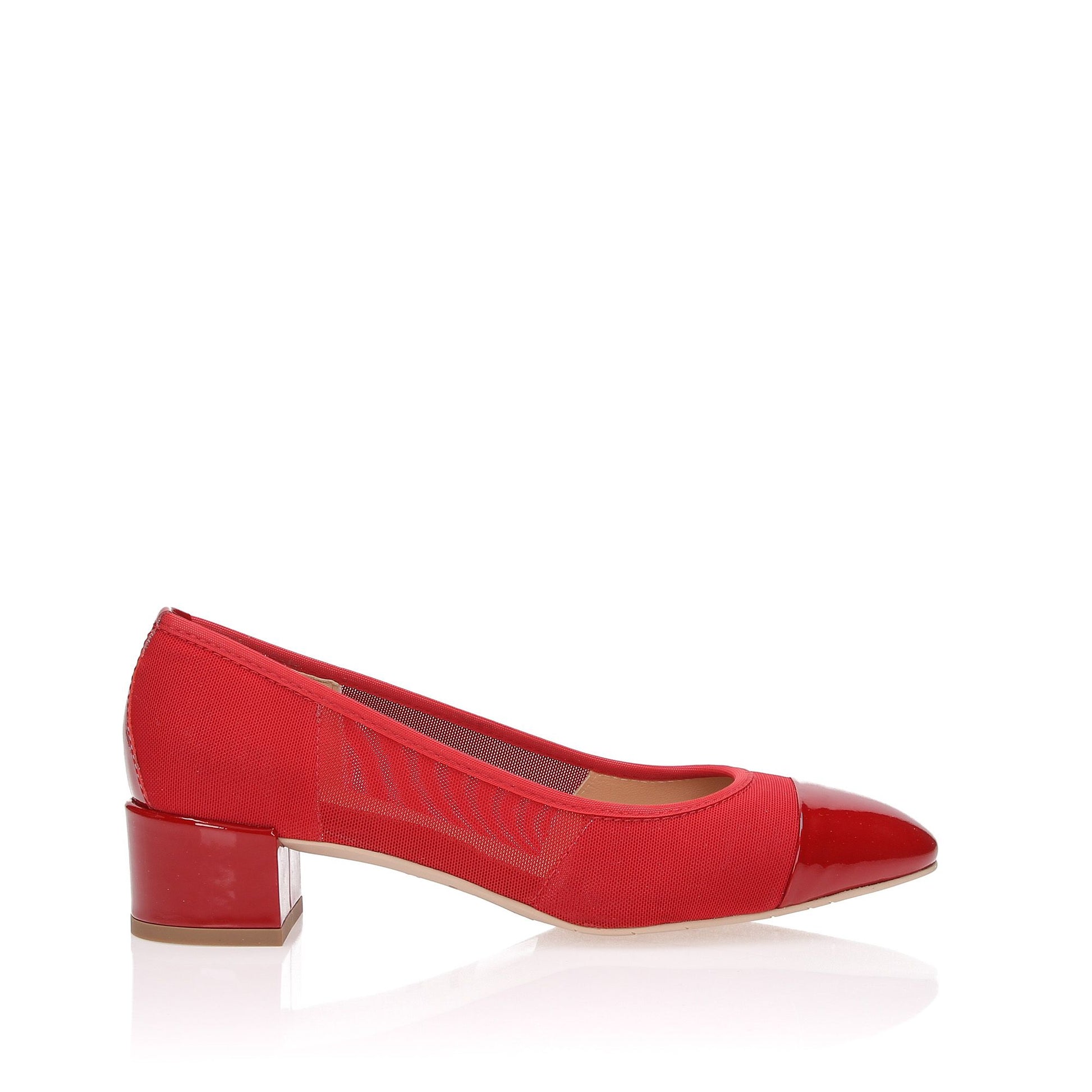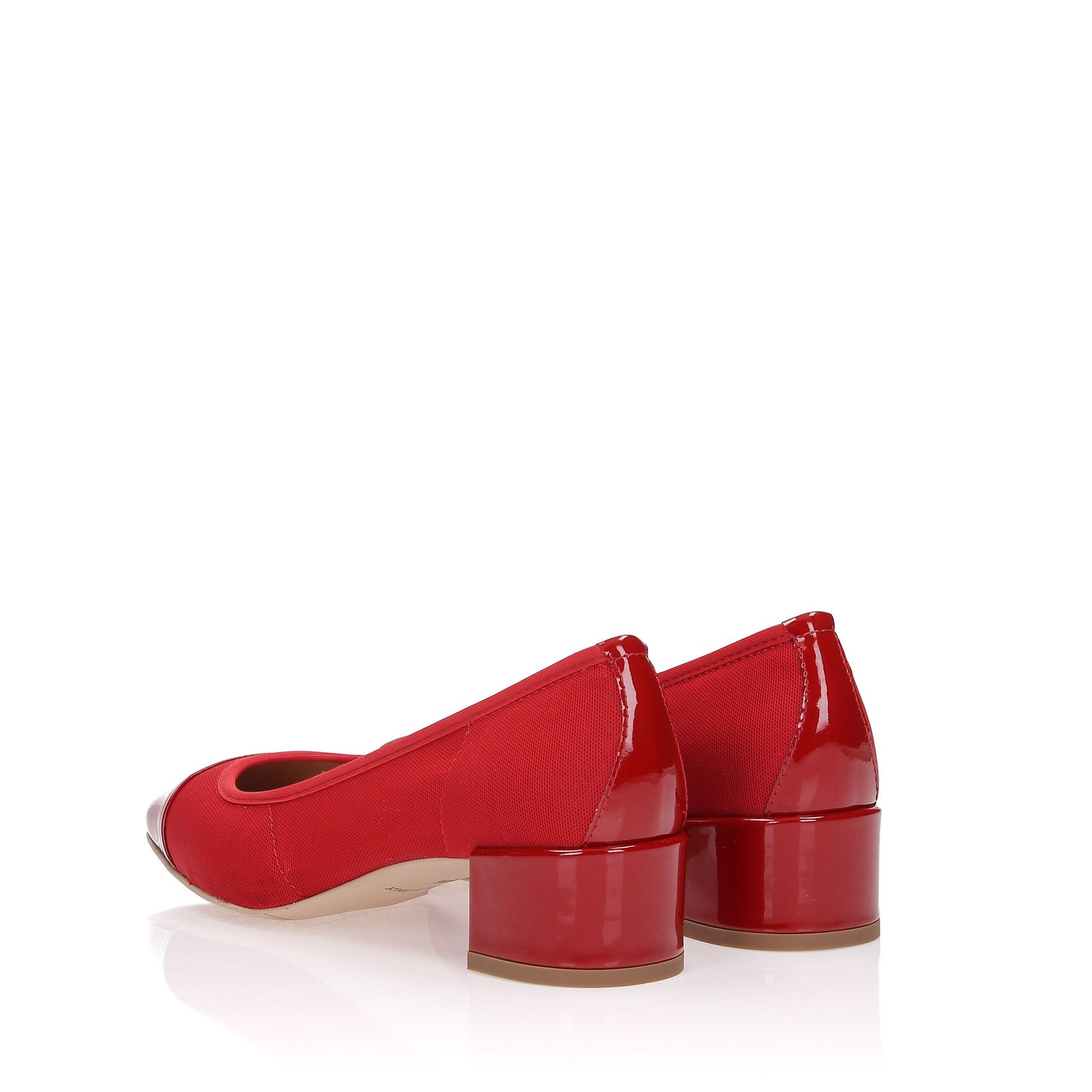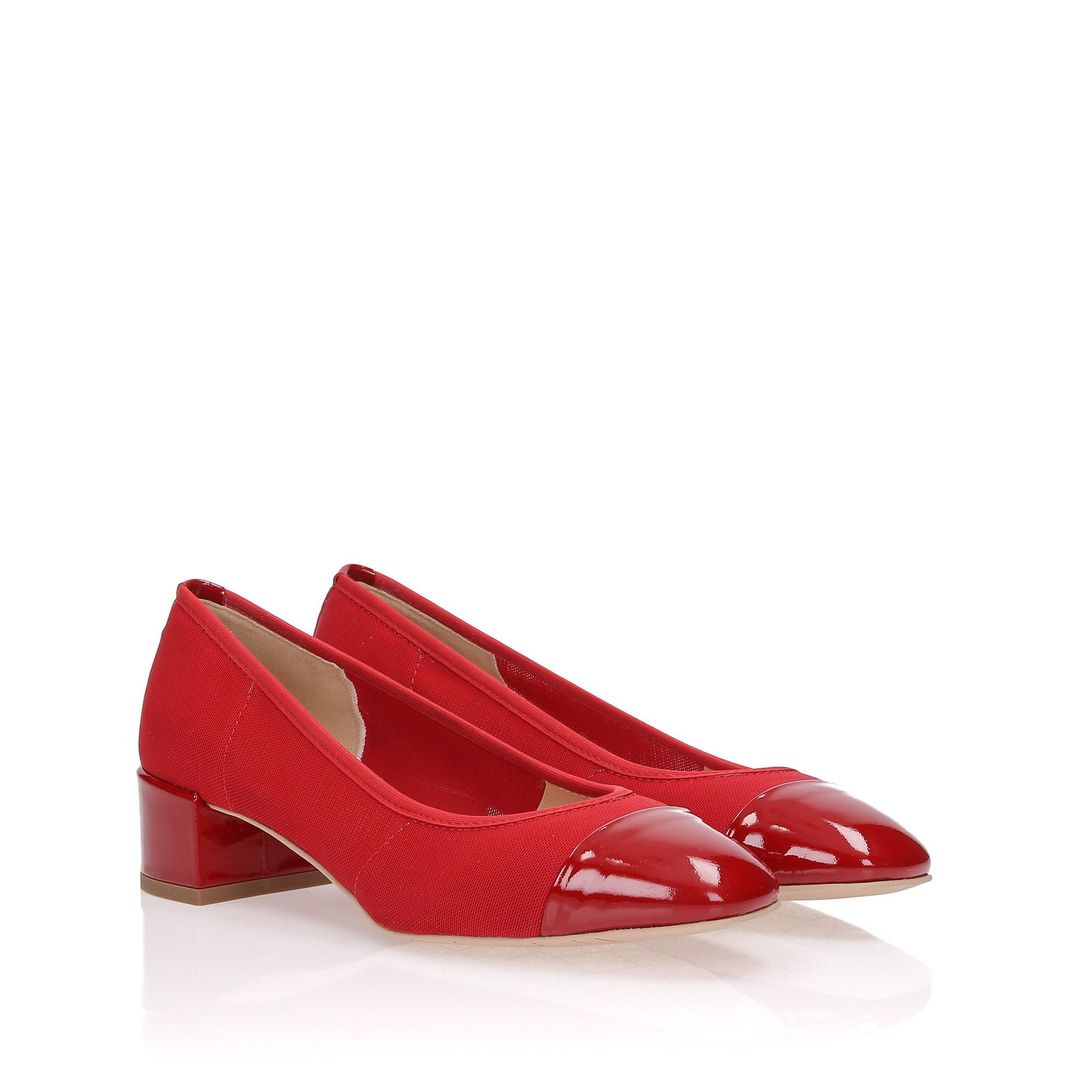 Decollete in rete rossa con puntale in vernice rossa, tacco 40 fondo cuoio.