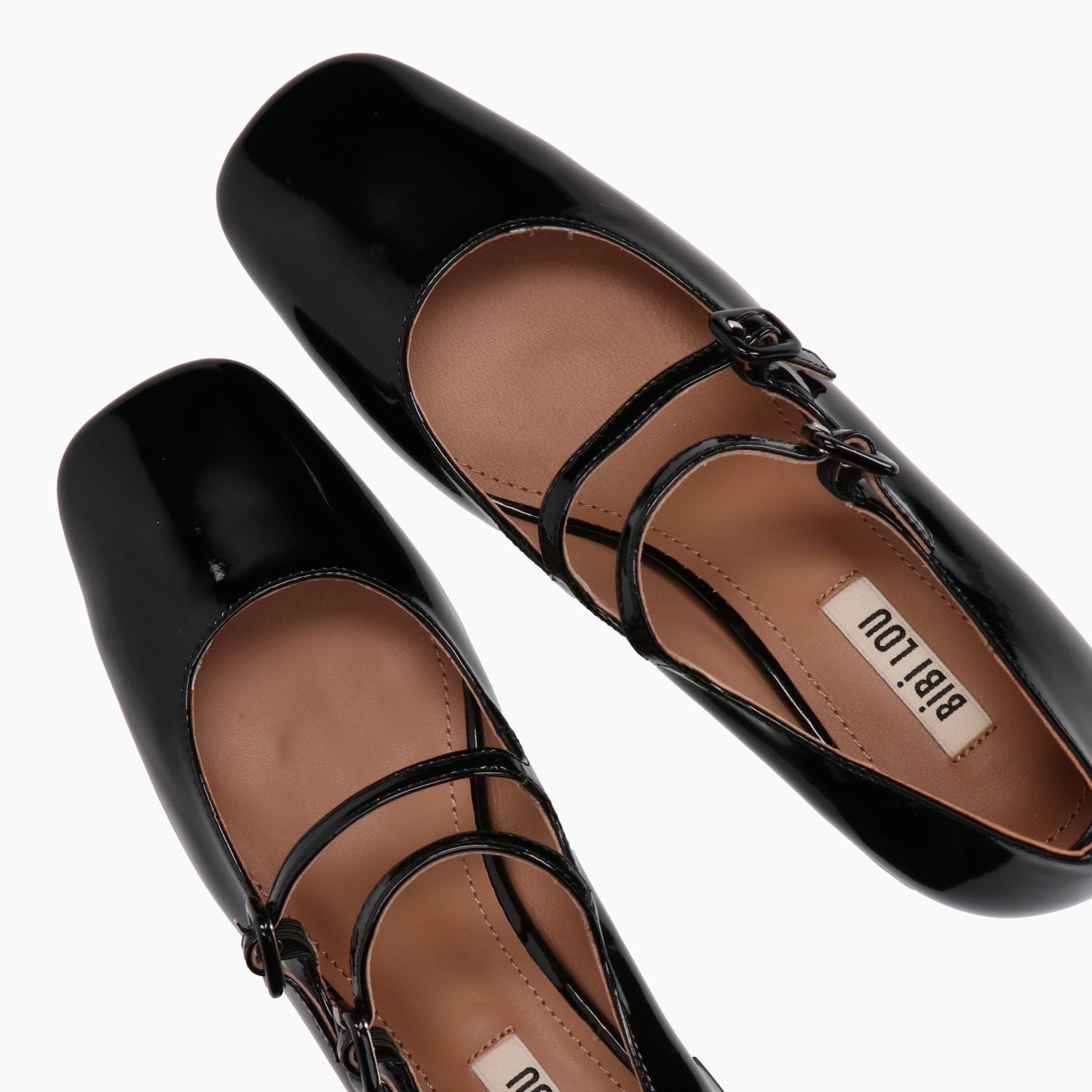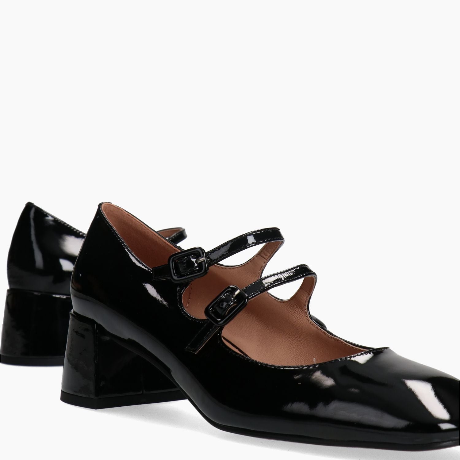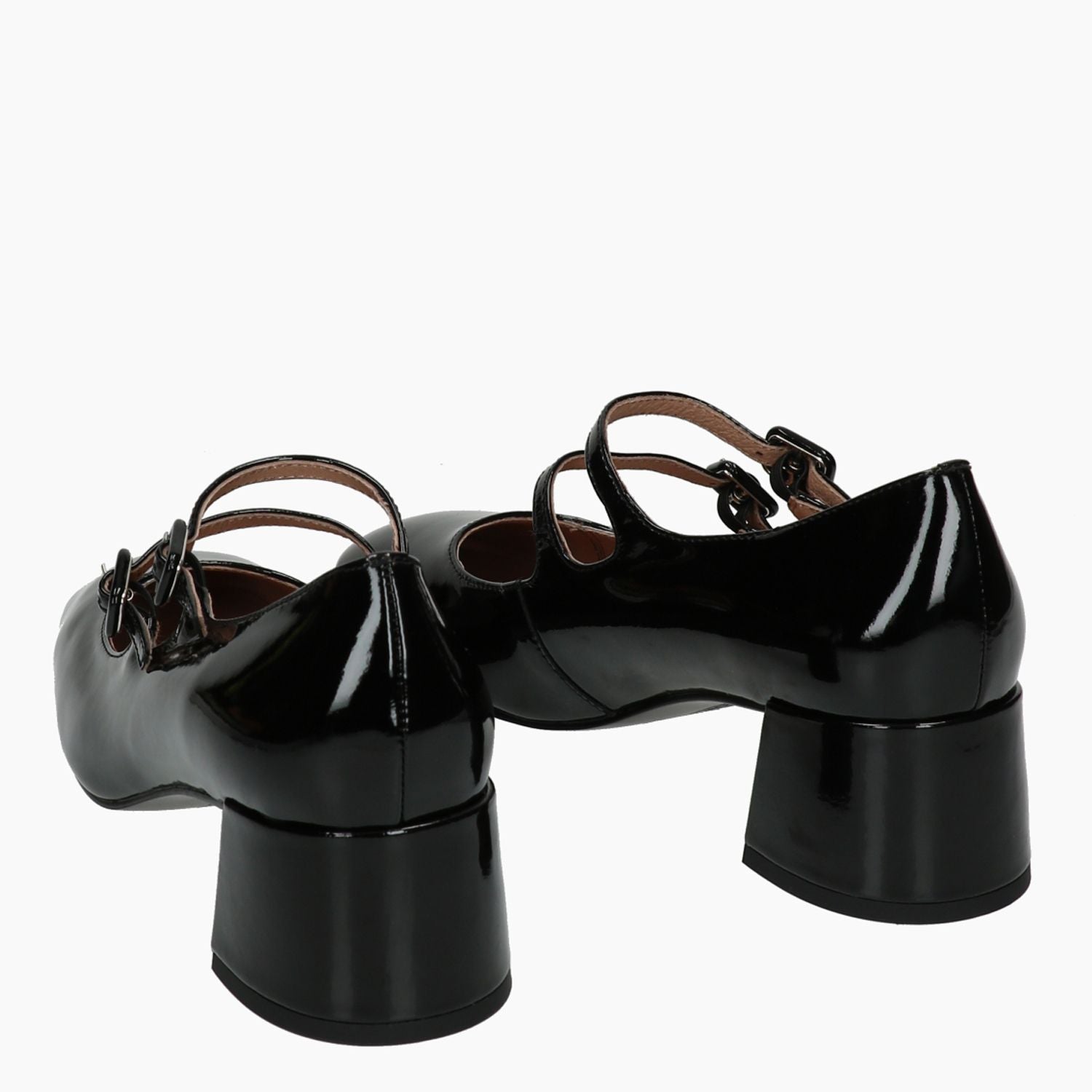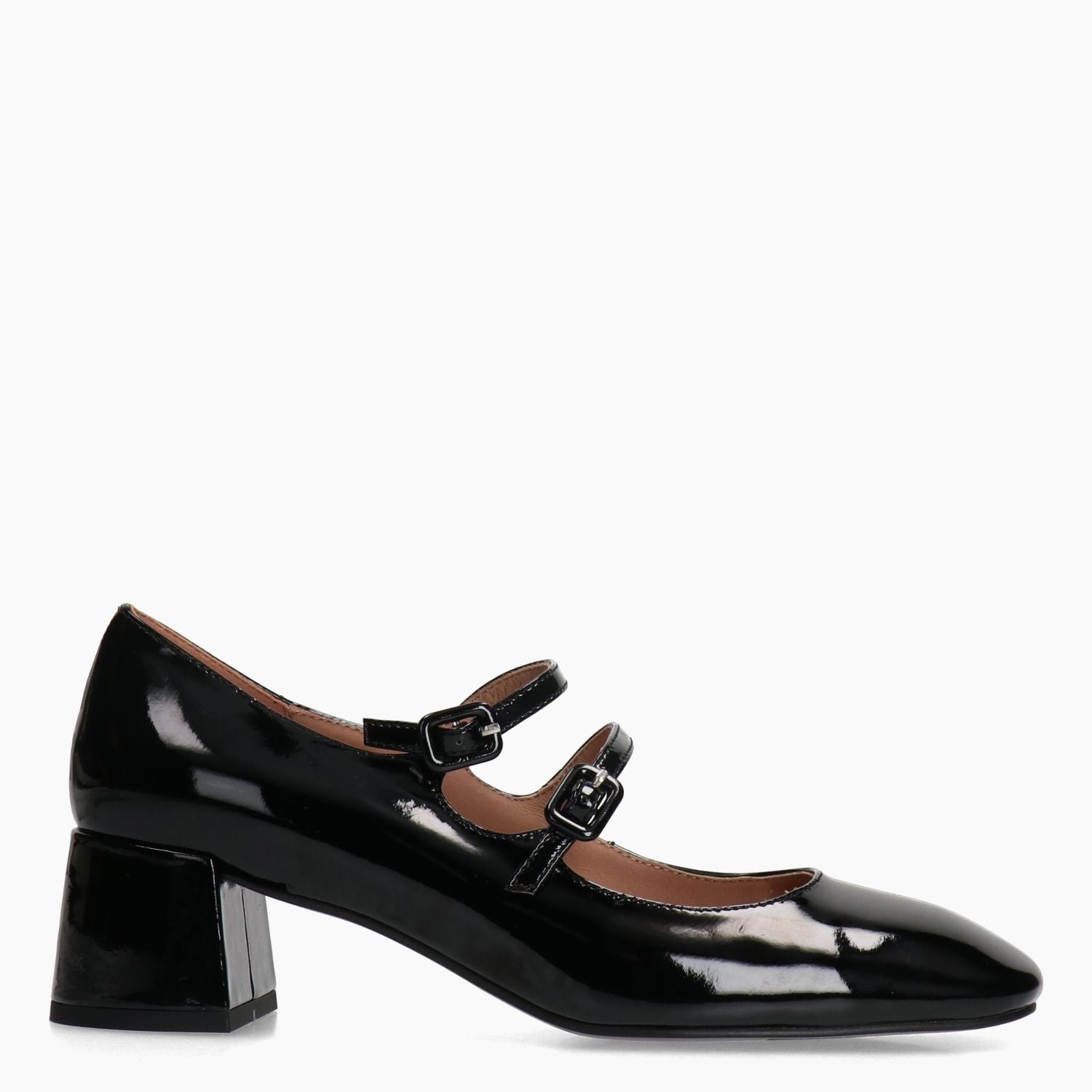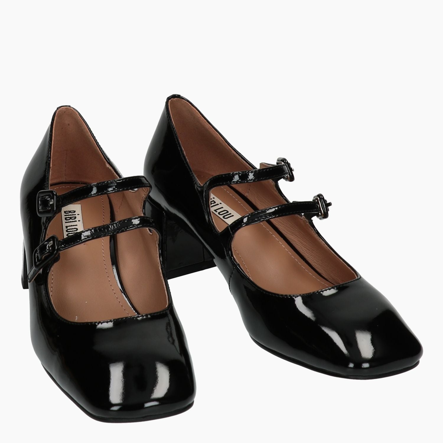 Mary Jane con tomaia in pelle verniciata nera con doppio cinturino regolabile. Punta quadrata. Interno in pelle. Suola in gomma. Tacco di 4,5 cm. Collezione Bibi Lou donna autunno/inverno.
