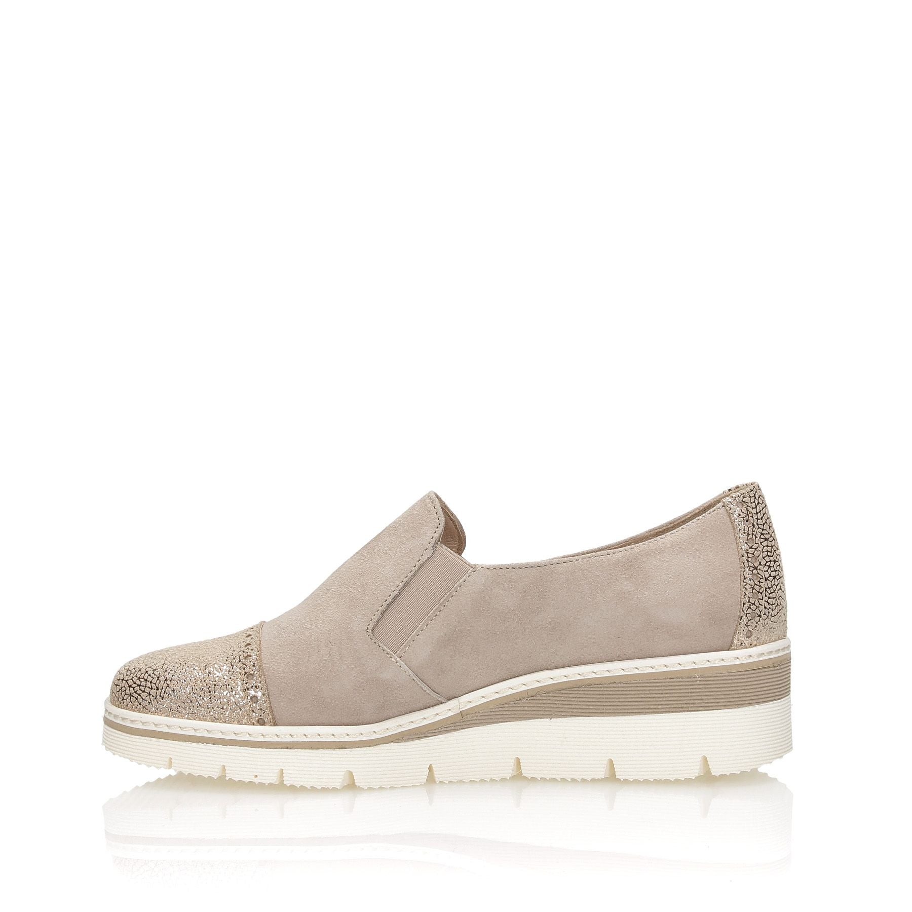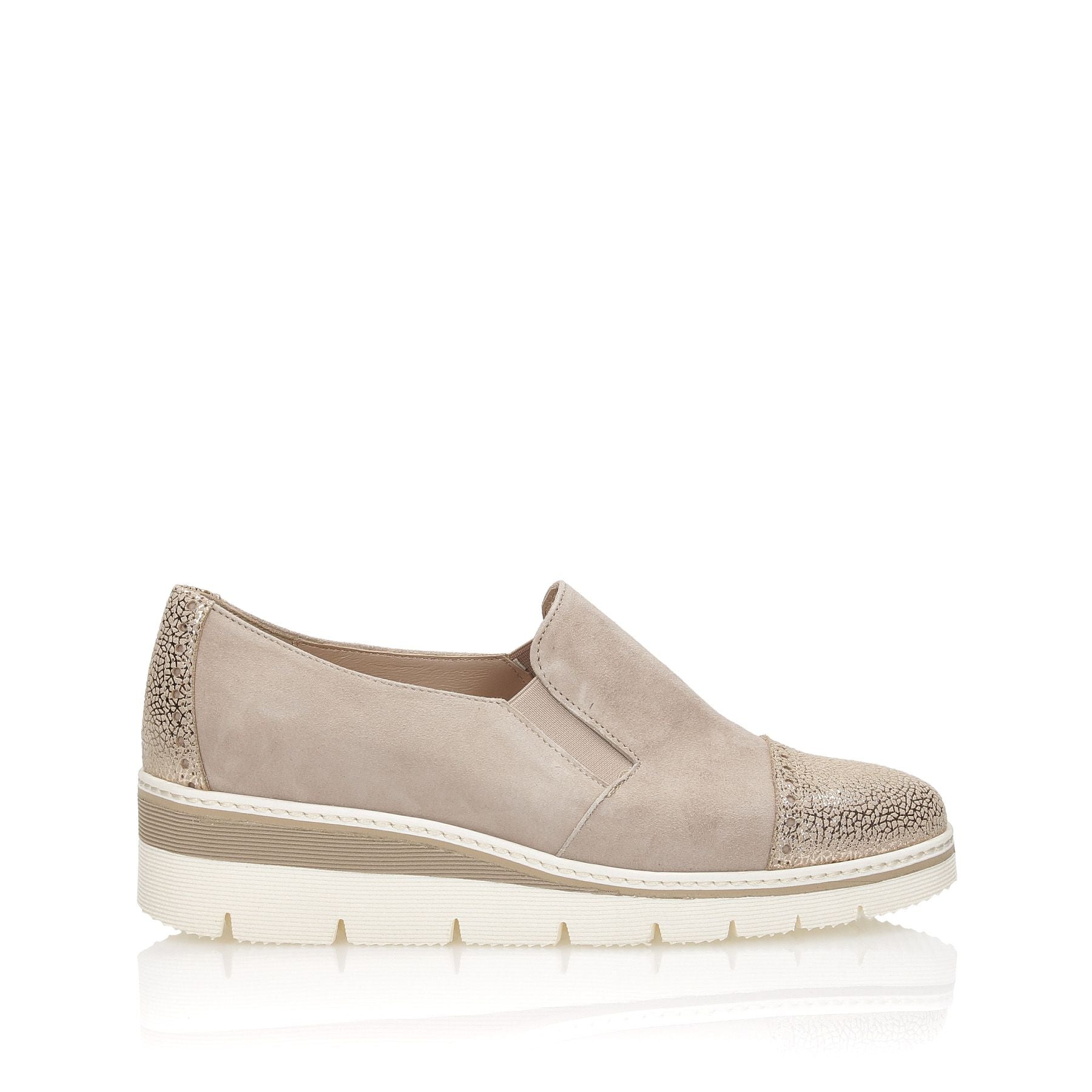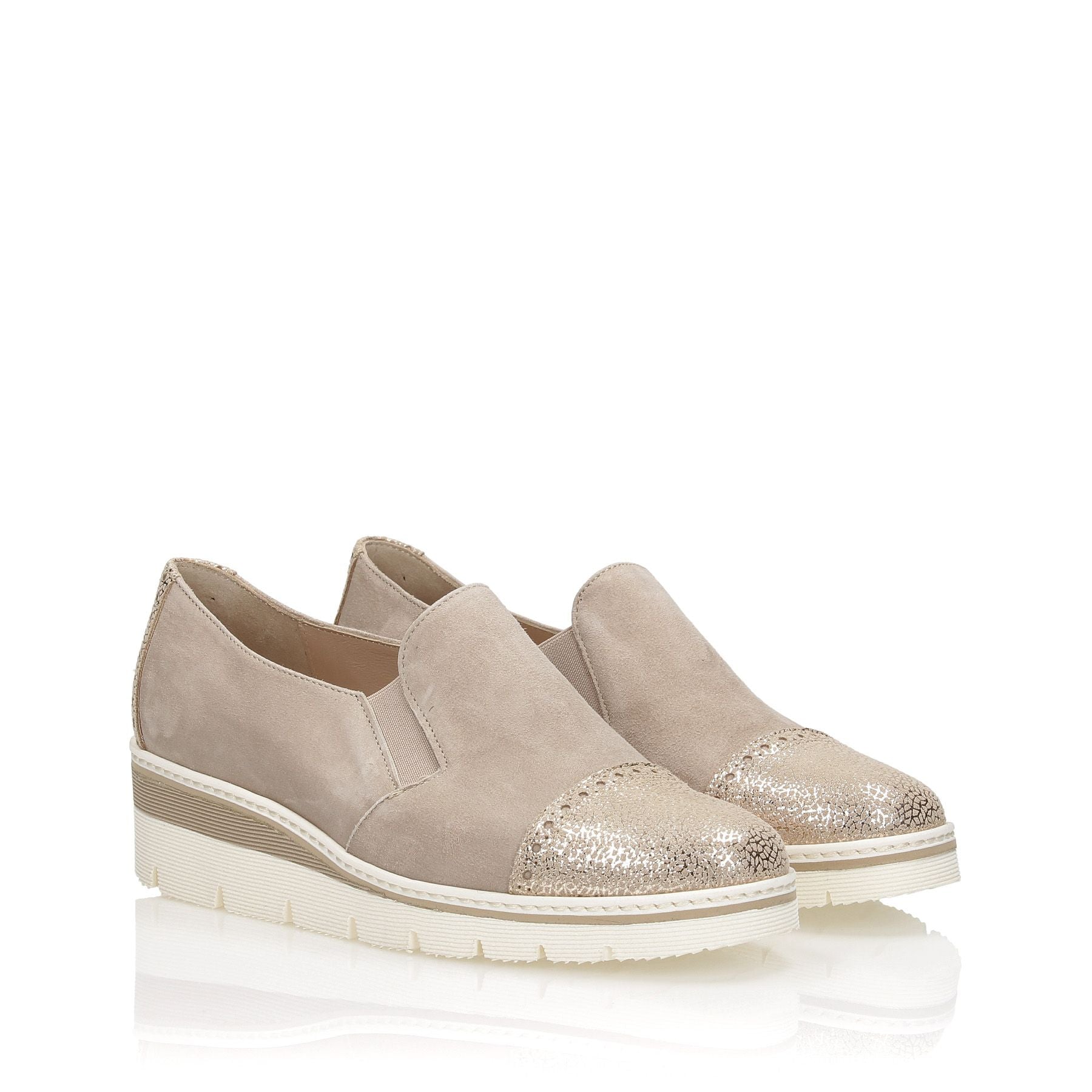 Pantofole in camoscio sabbia con pountale in pelle llaminata oro, zeppa 40 fondo gomma.