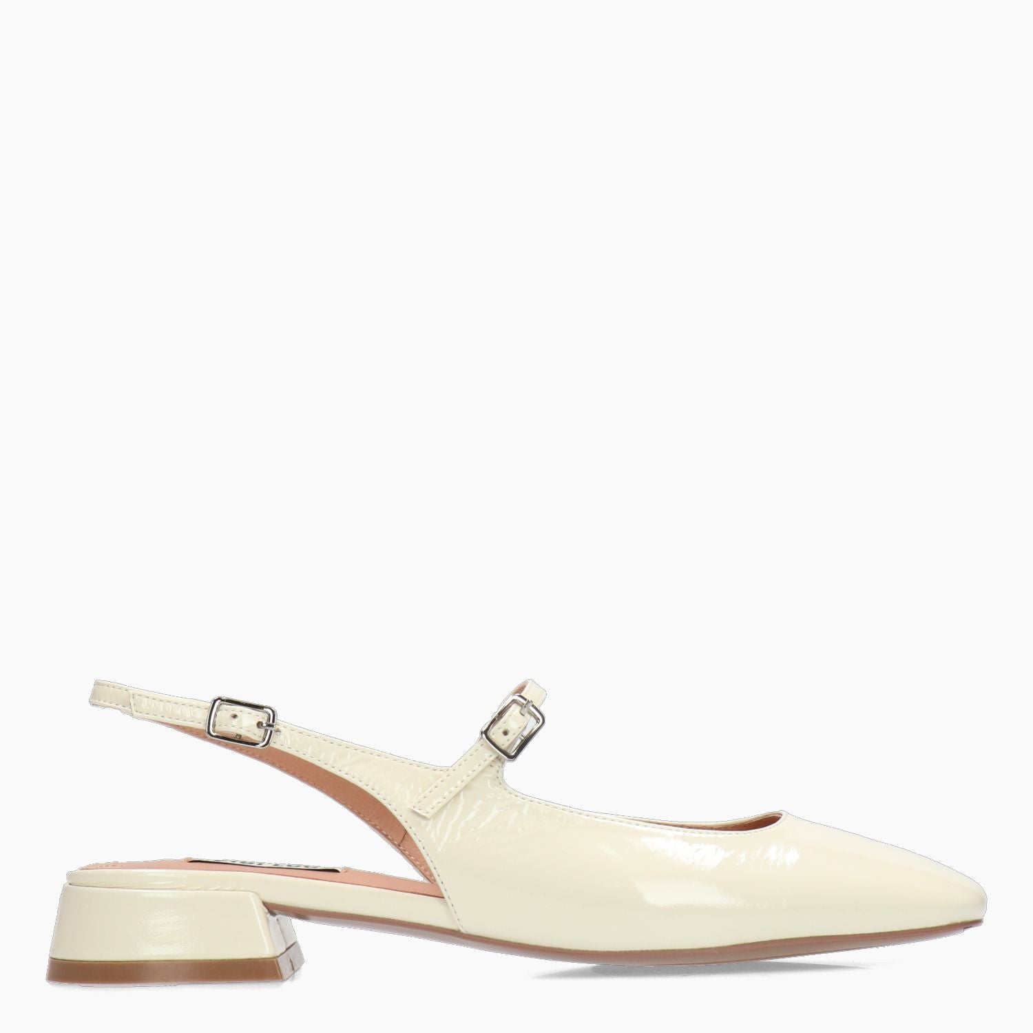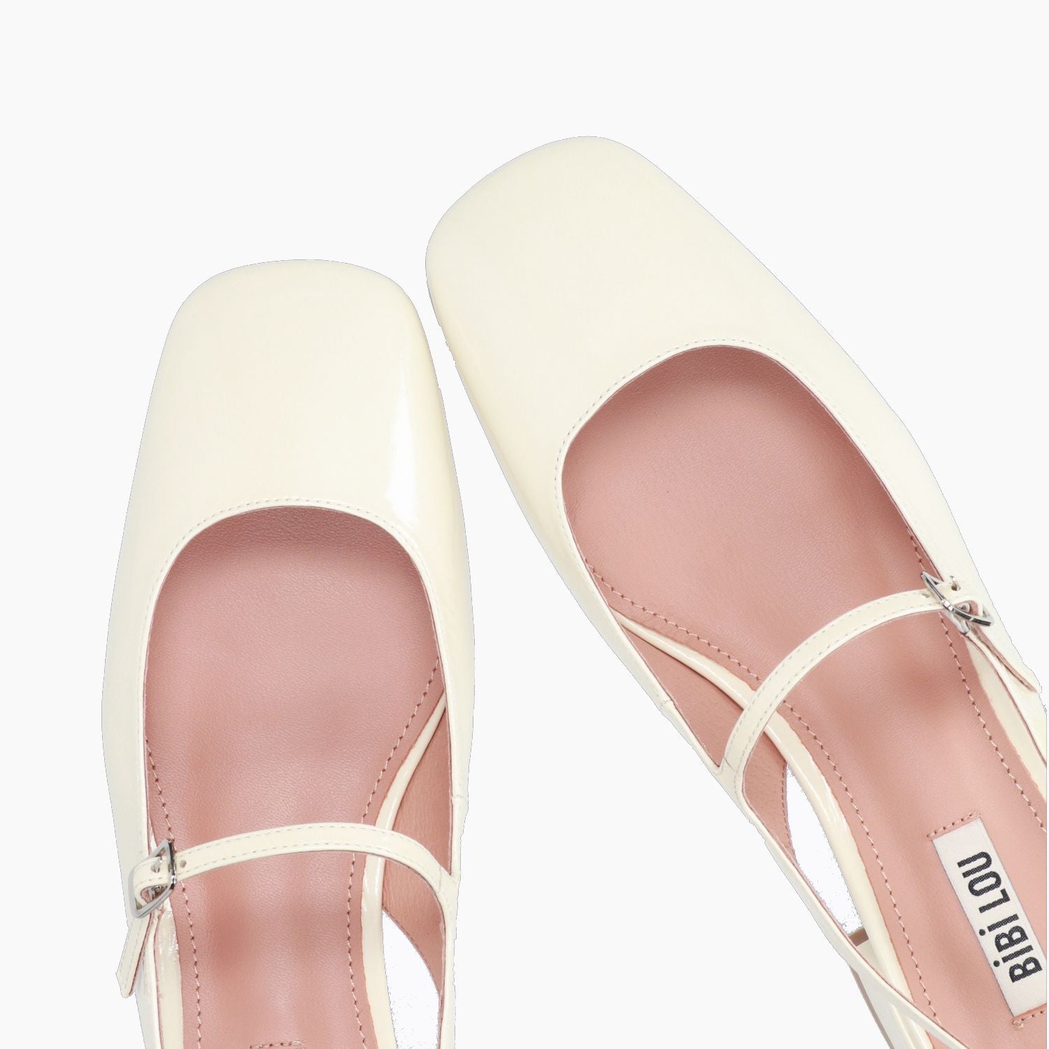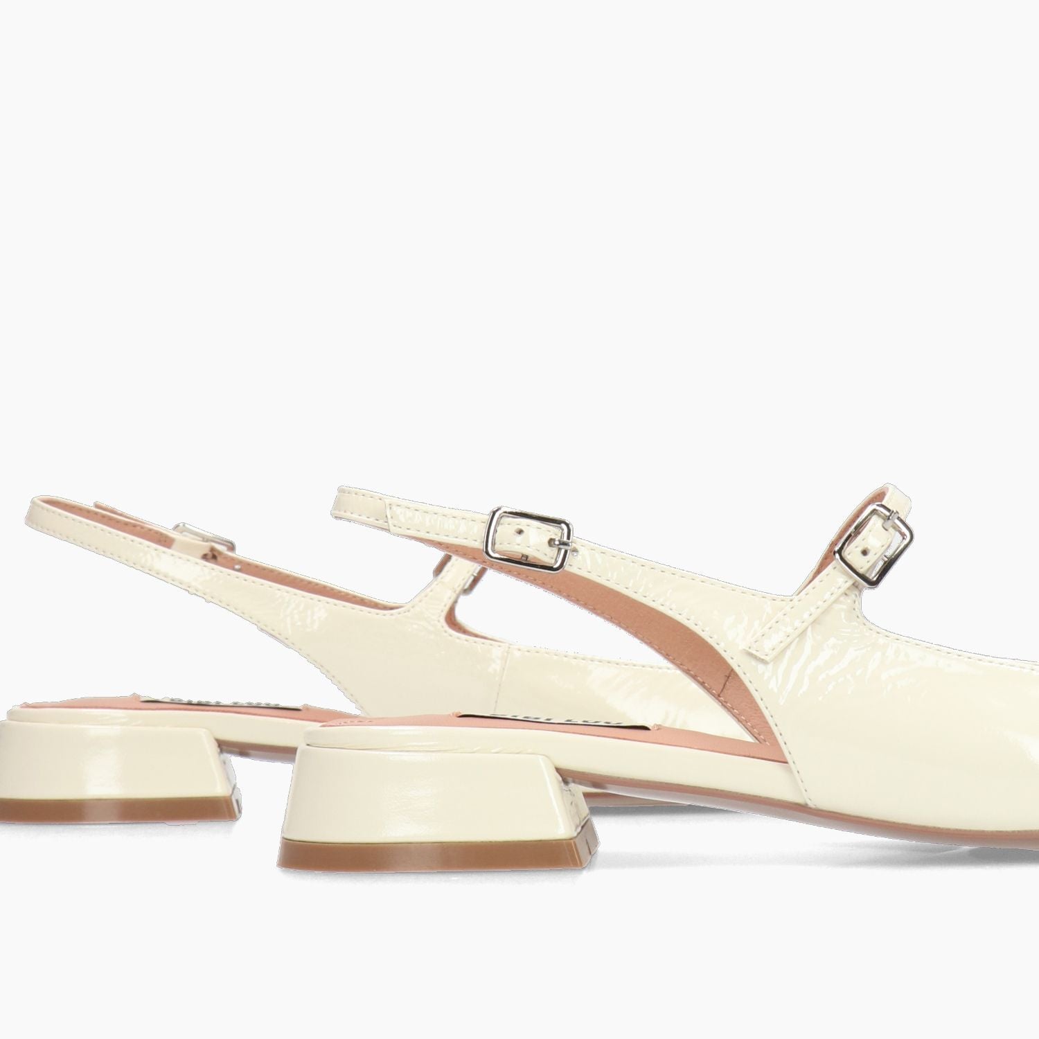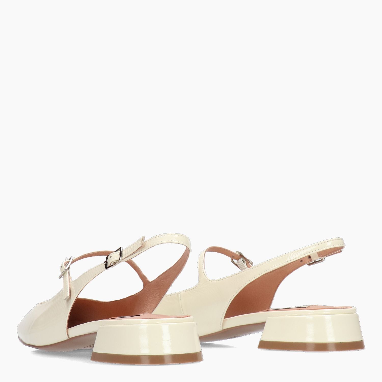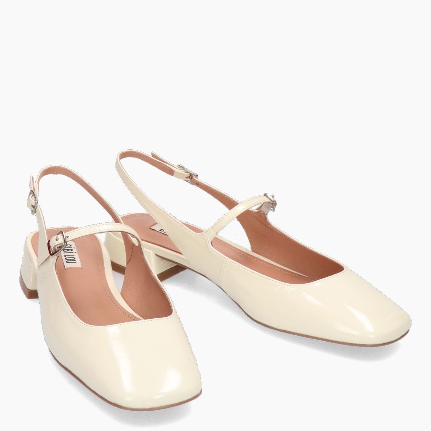 Chanel in vernice avorio con doppio cinturino regolabile. Interno in pelle. Suola in gomma con tacco di 2,5 cm. Collezione Bibi Lou donna primavera/estate.