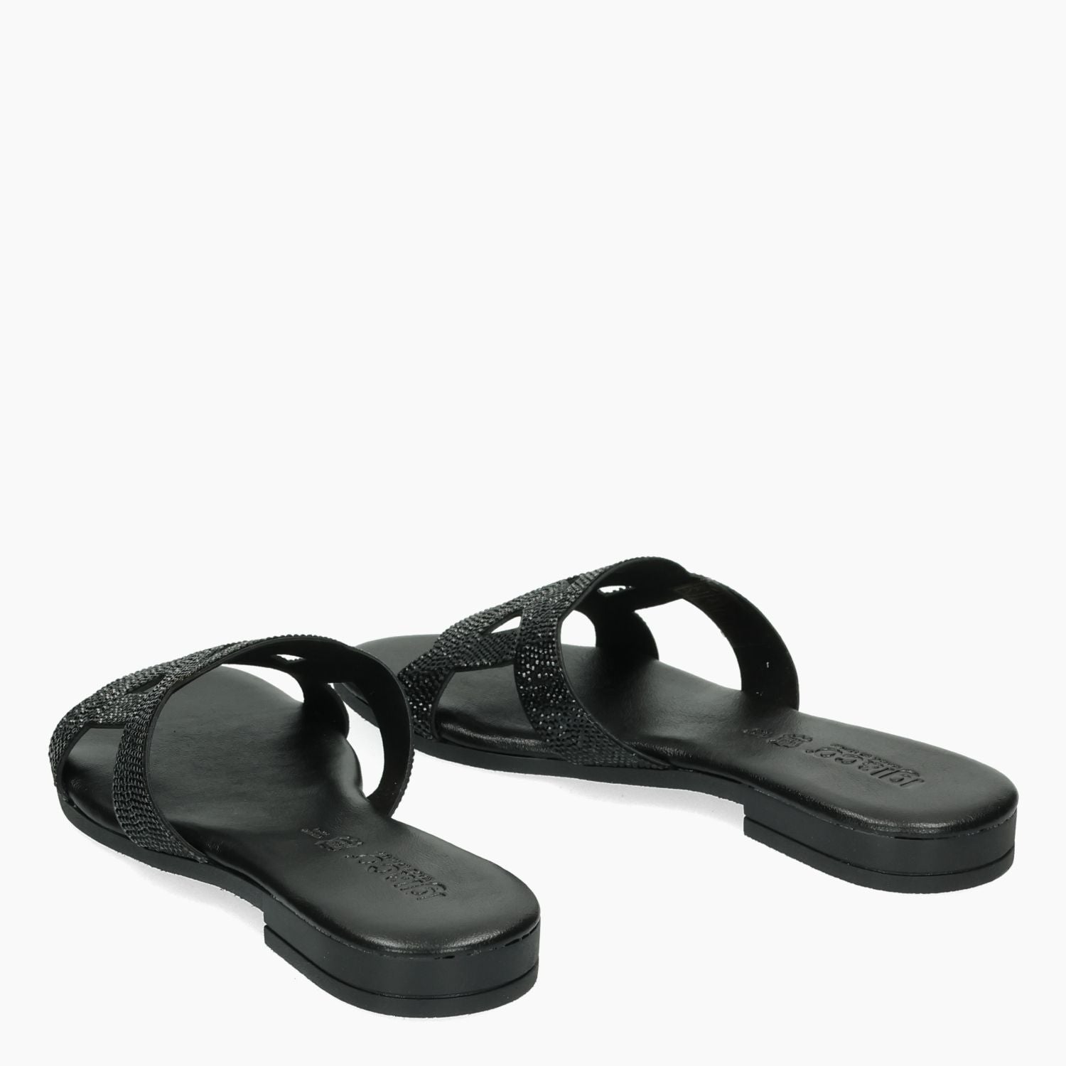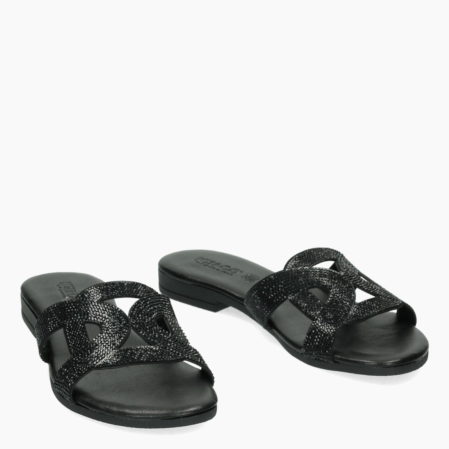 Ciabatta con tomaia full strass neri. Interno in pelle e tessuto con sottopiede imbottito. Suola in gomma con tacco di 2 cm. Collezione Igi&Co donna Primavera/Estate.