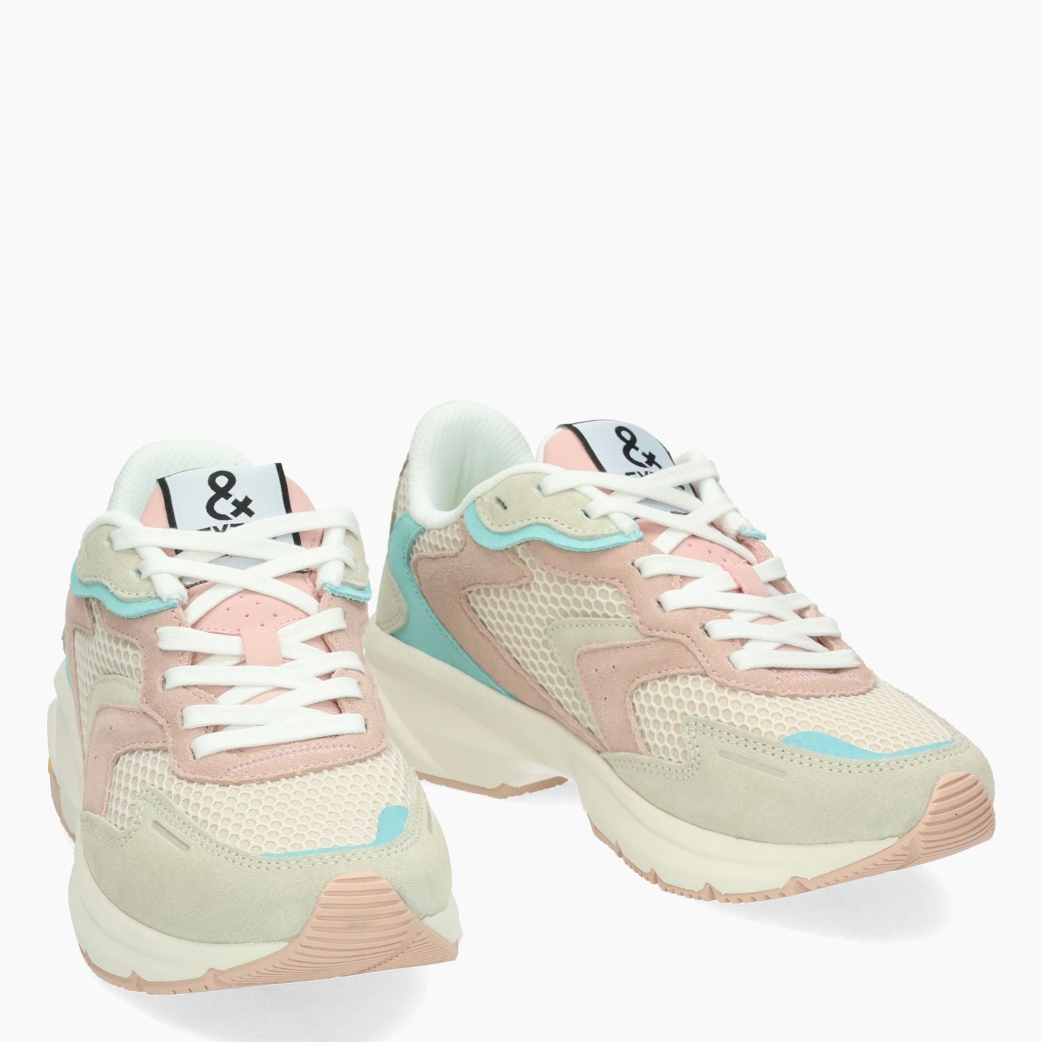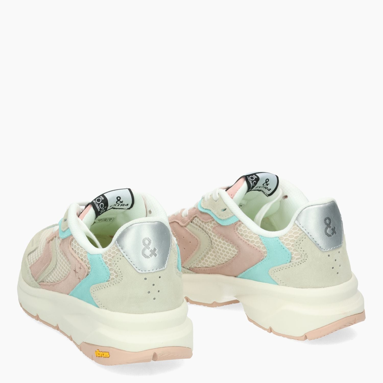 Sneaker in tessuto beige con riporti in camoscio rosa e verde acqua. Interno in tessuto. Suola in gomma Vibram. Sottopiede estraibile. Collezione Extr4 donna.