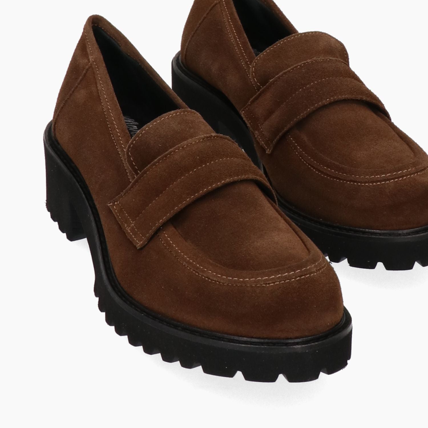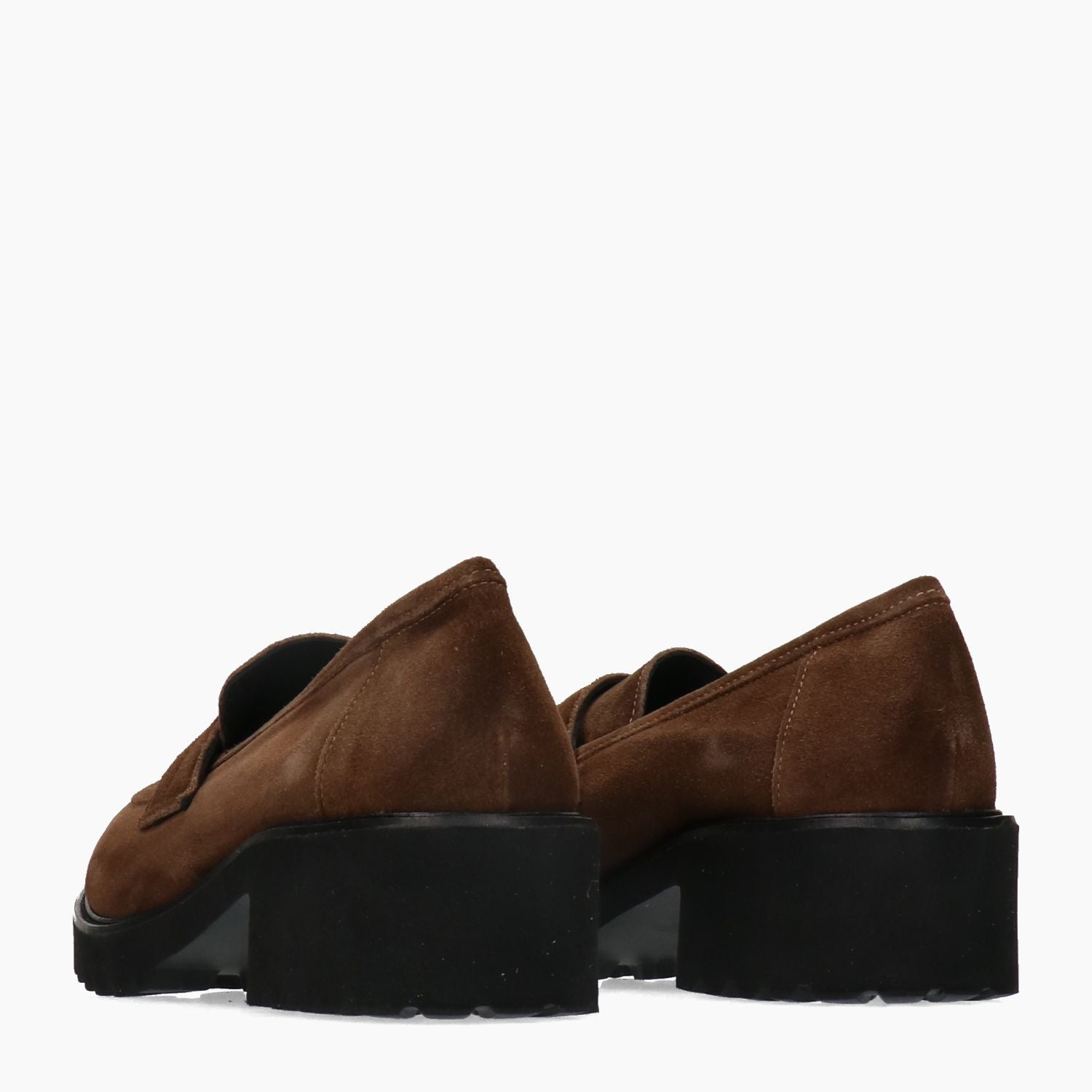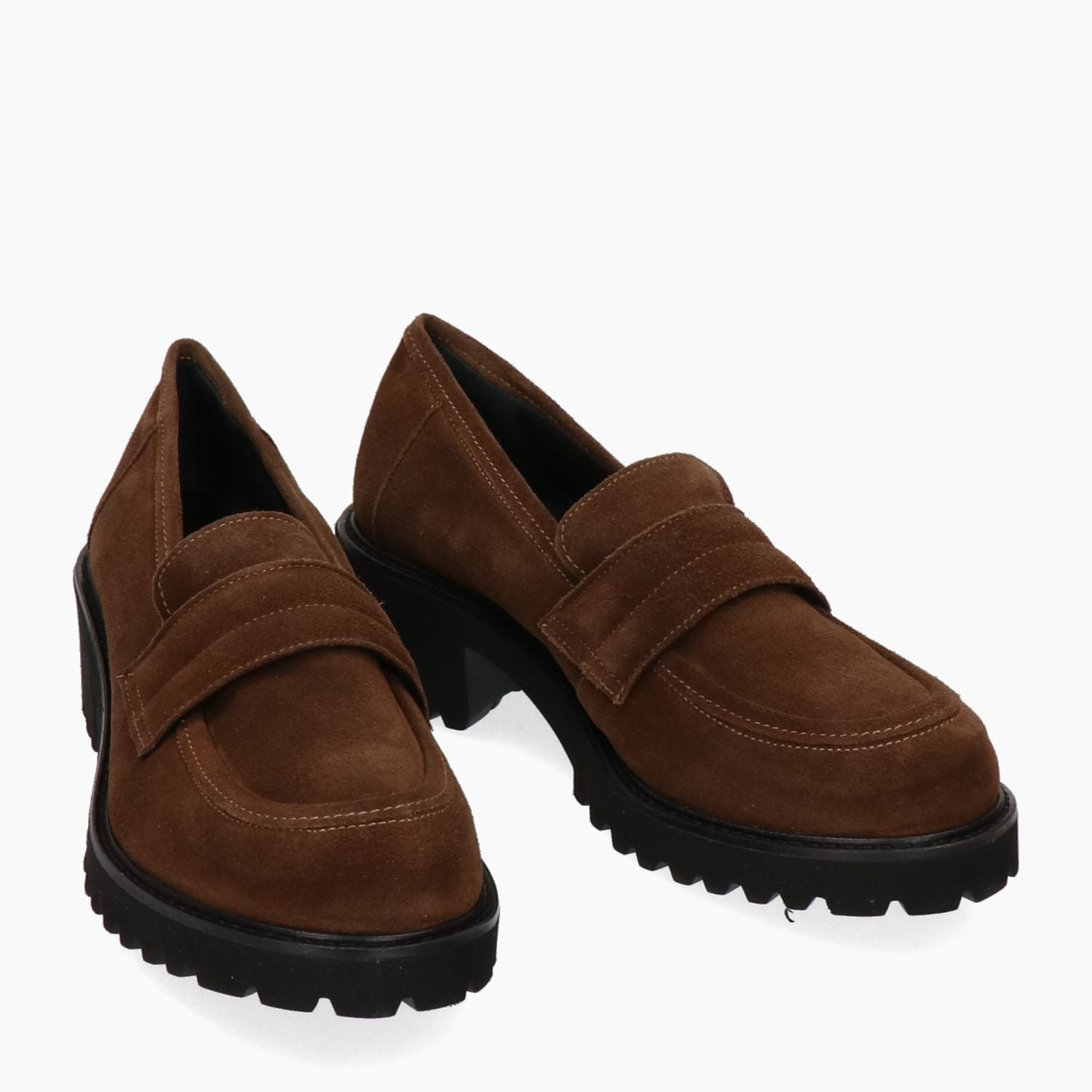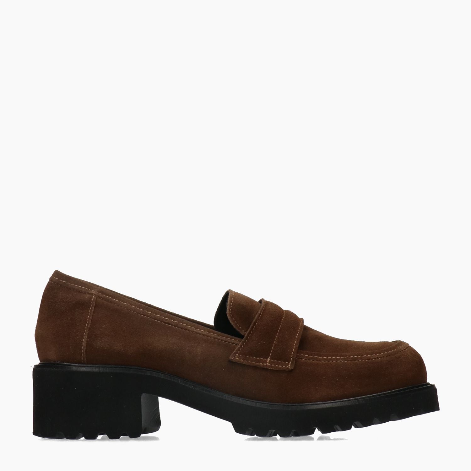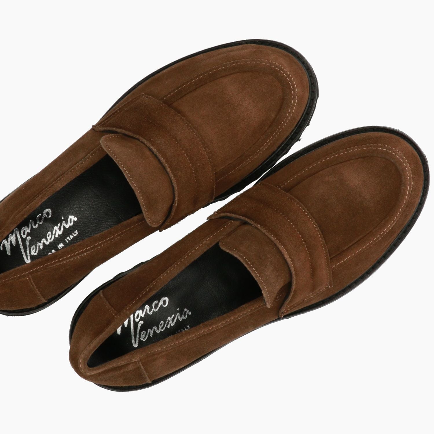 Mocassini con tomaia in pelle scamosciata in colore marrone. Punta tonda. Interno in pelle. Suola in gomma dentata. Tacco di 5 cm. Collezione Marco Venexia donna Autunno/Inverno.