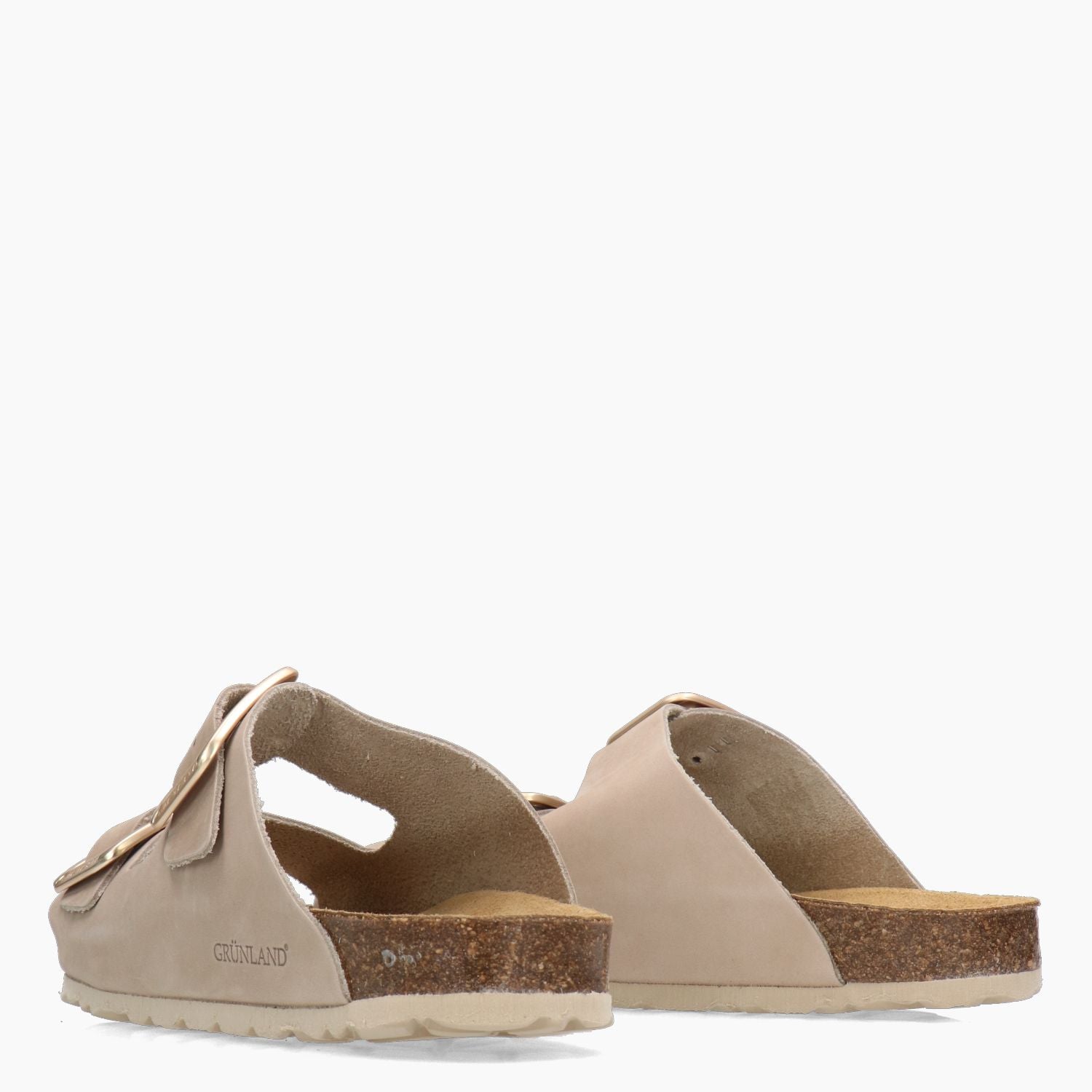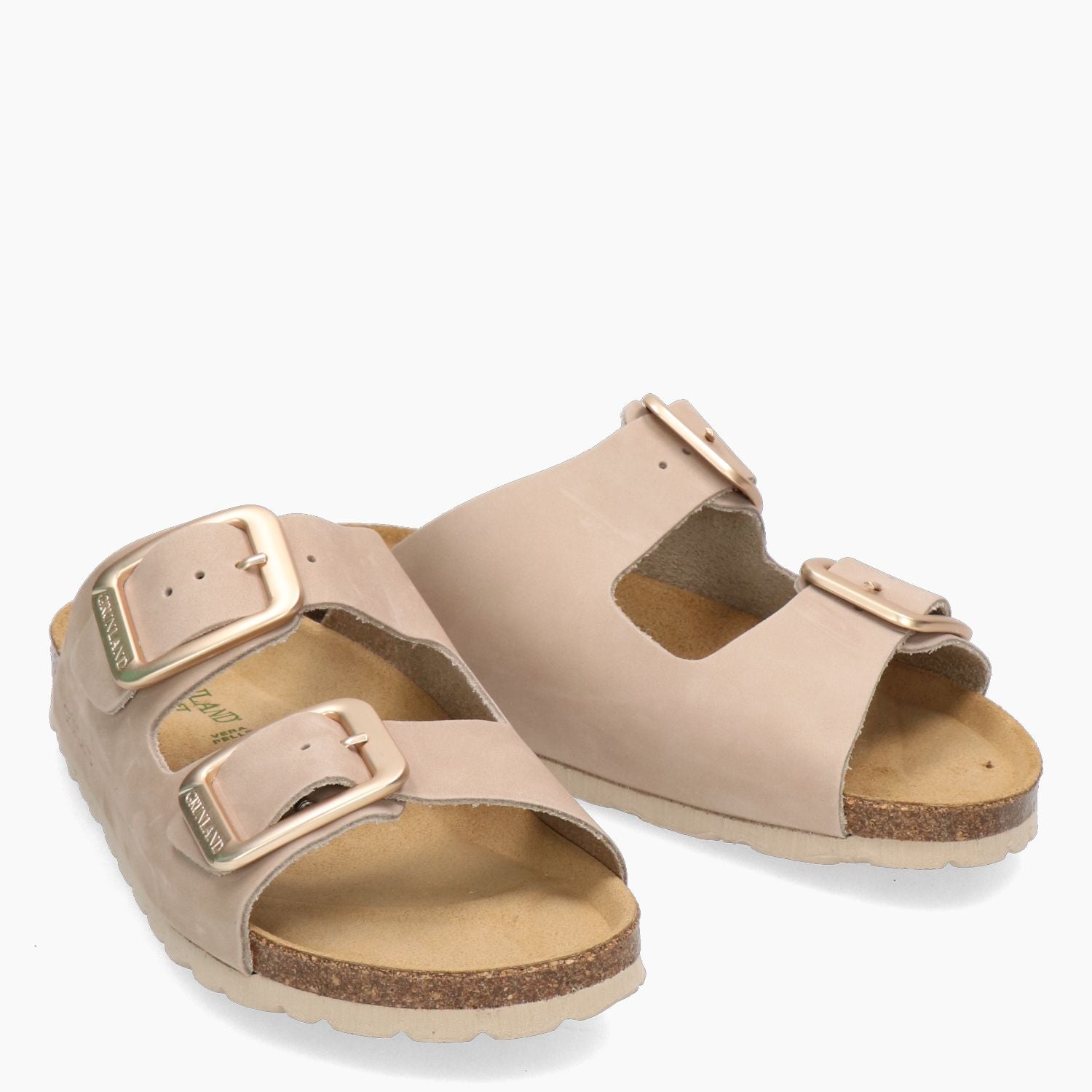 Ciabatta Grunland con tomaia in nabuk in colore beige. Chiusura con doppio fibbia in metallo dorato. Interno in pelle con sottopiede imbottito. Suola in gomma con zeppa di 2 cm. Collezione Grunland donna Primavera/Estate.