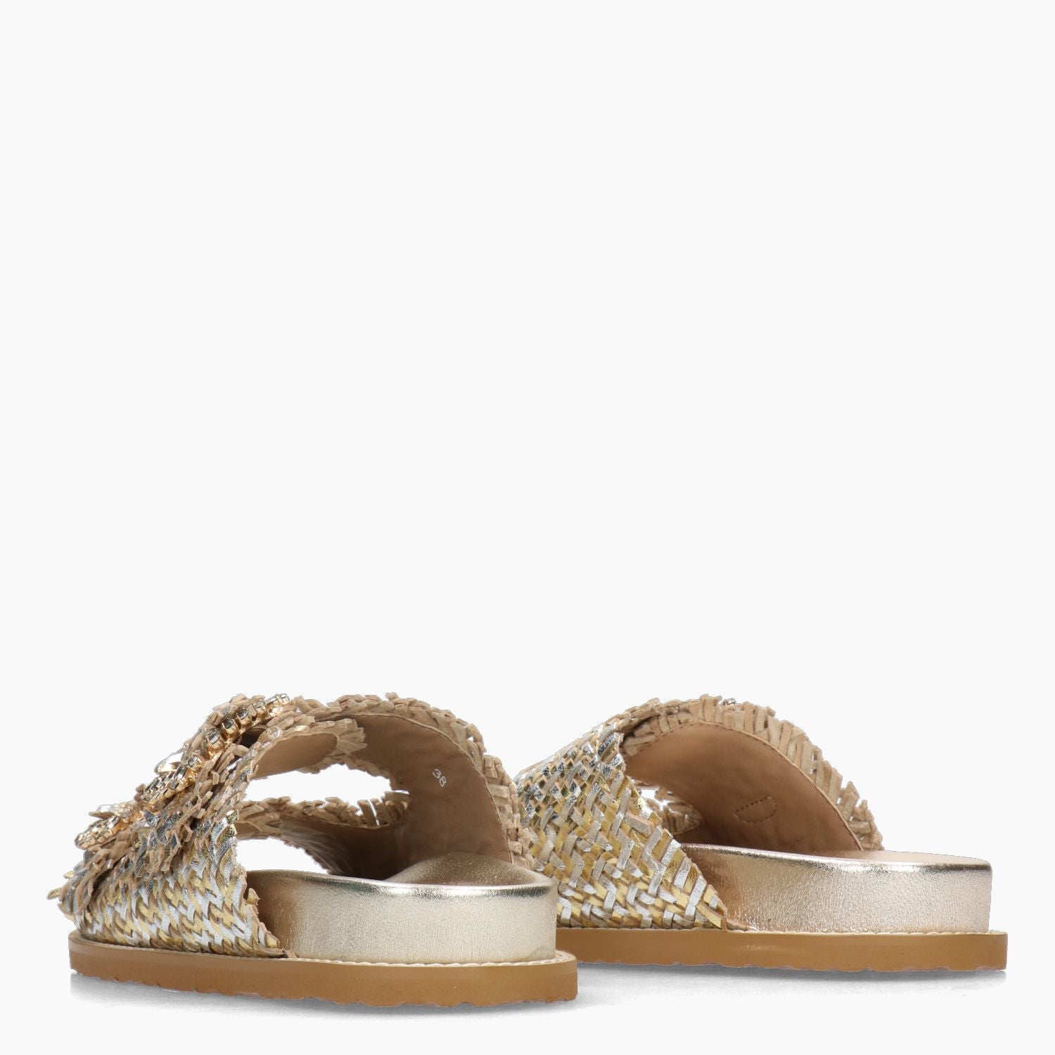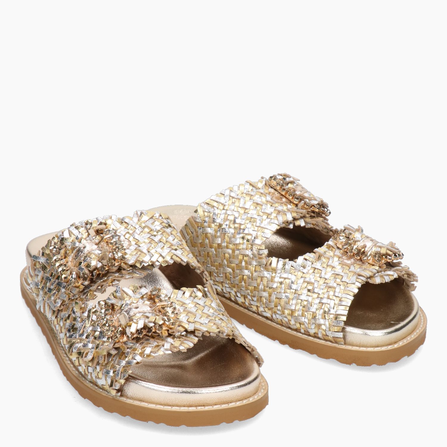 Ciabatte in pelle laminata oro ed argento. Doppia fibbia regolabile ornata di strass dorati. Interno in pelle con fussbett ricoperto in pelle in tinta. Suola in gomma di 3 cm. Collezione Coral Blue Primavera/estate.
