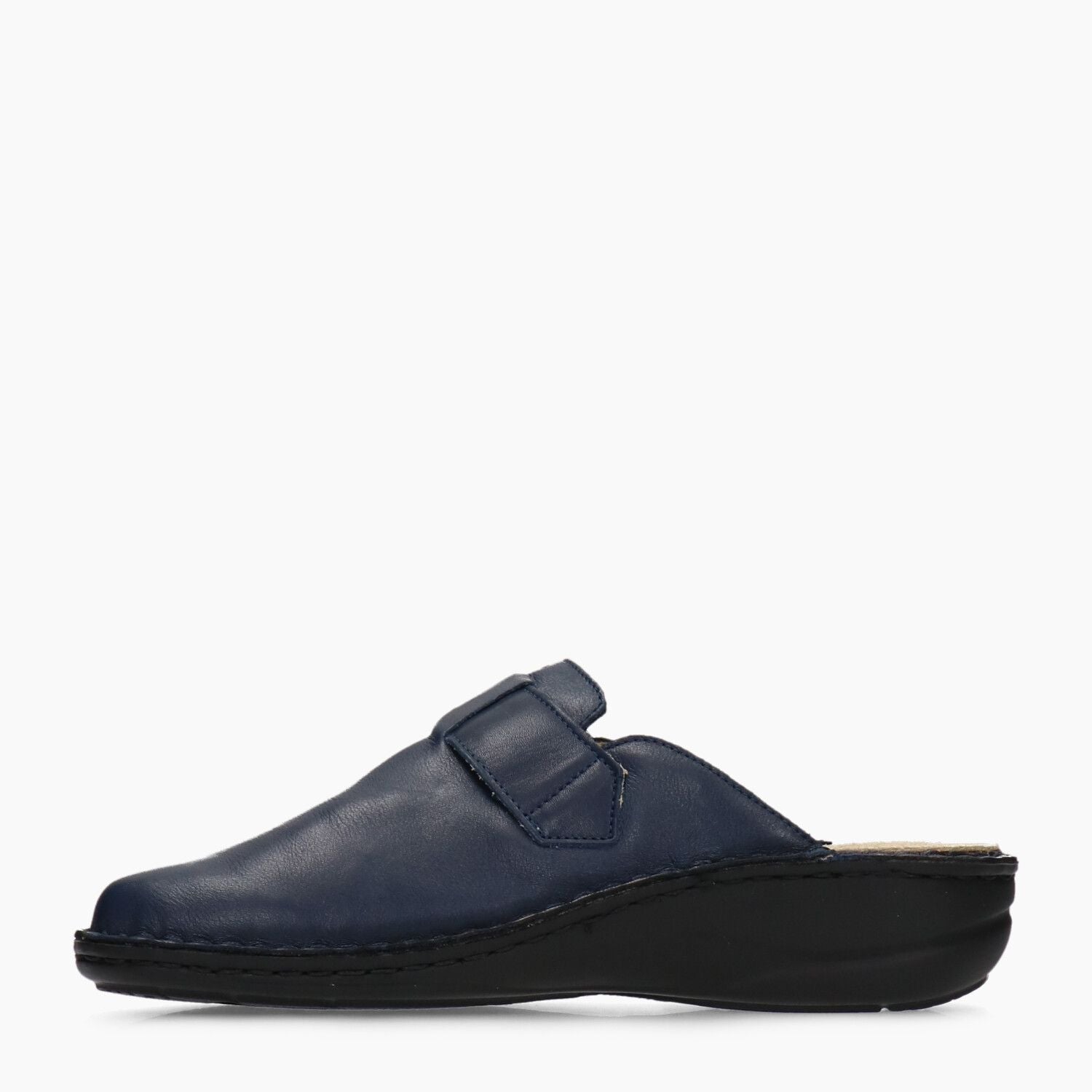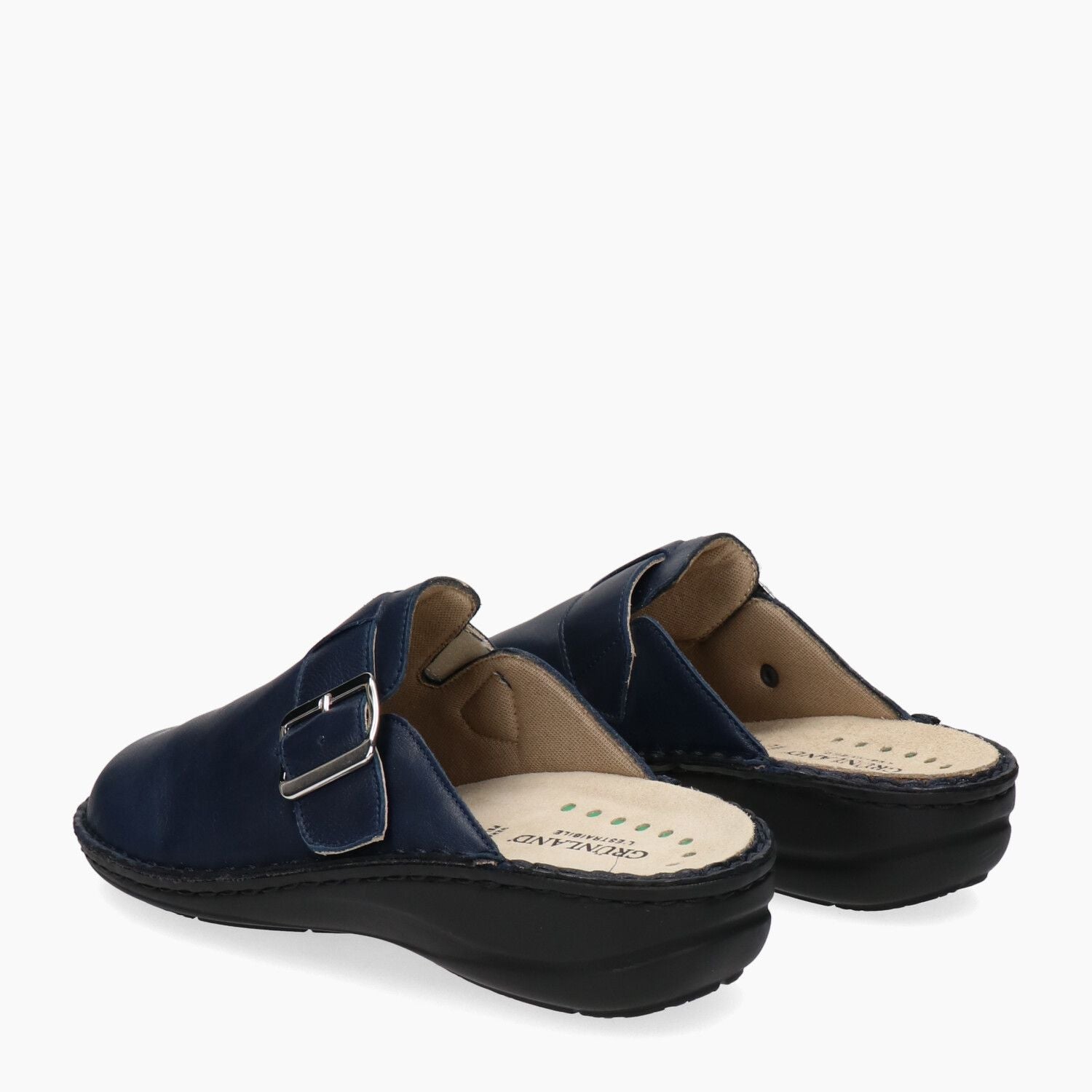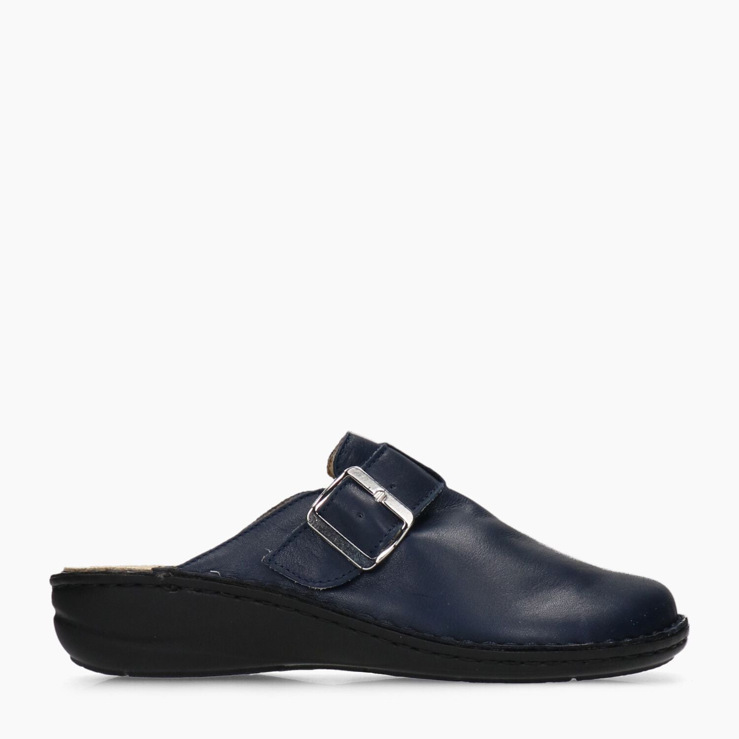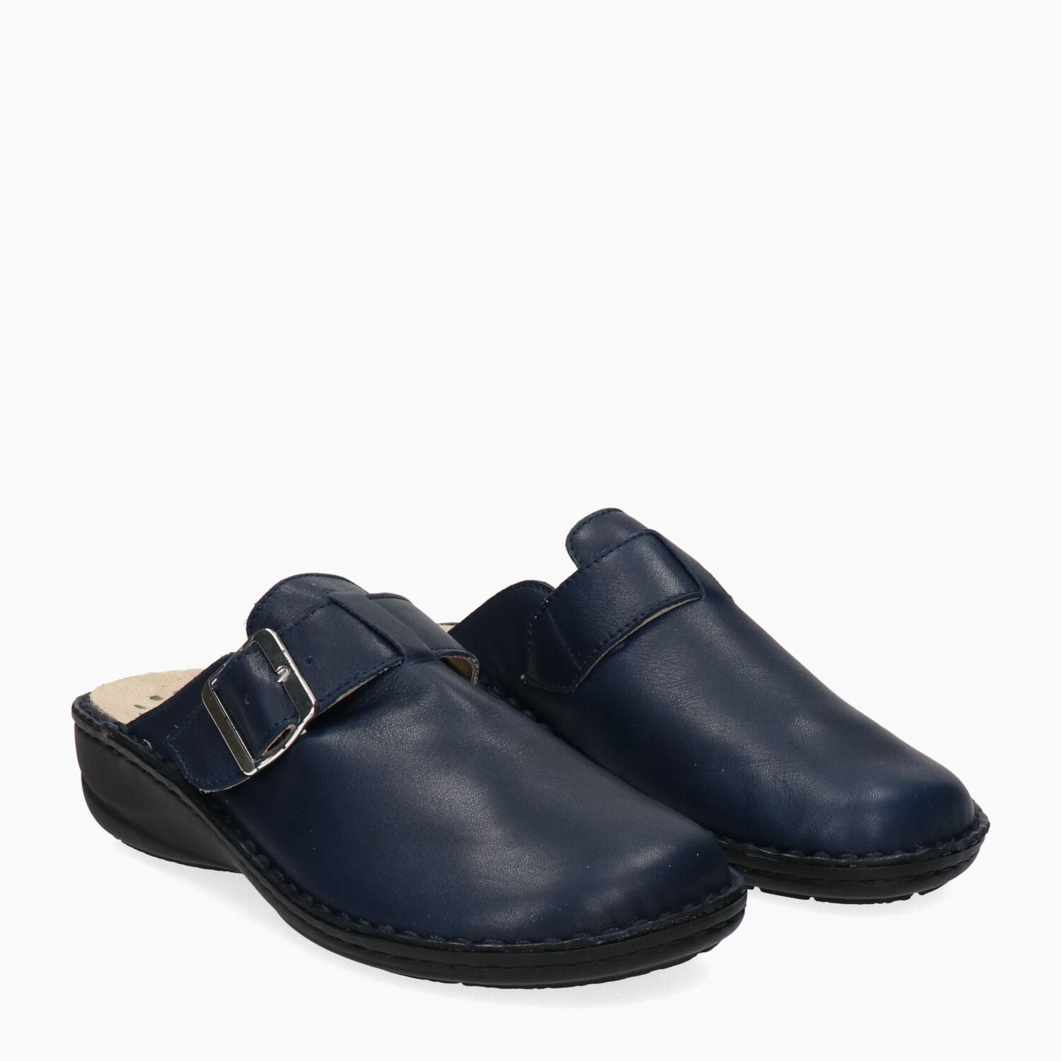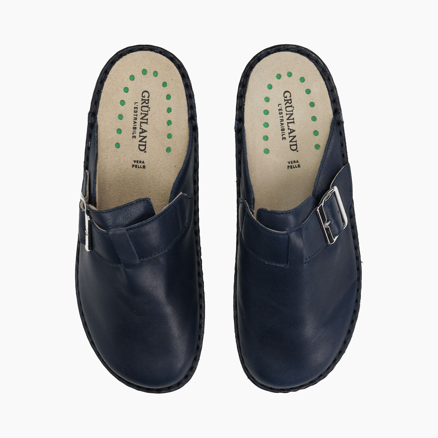 Ciabatte in pelle blu con fibbia di chiusura, zeppa 4 cm con sottopiede estraibile. Suola in gomma. Collezione Grunland.