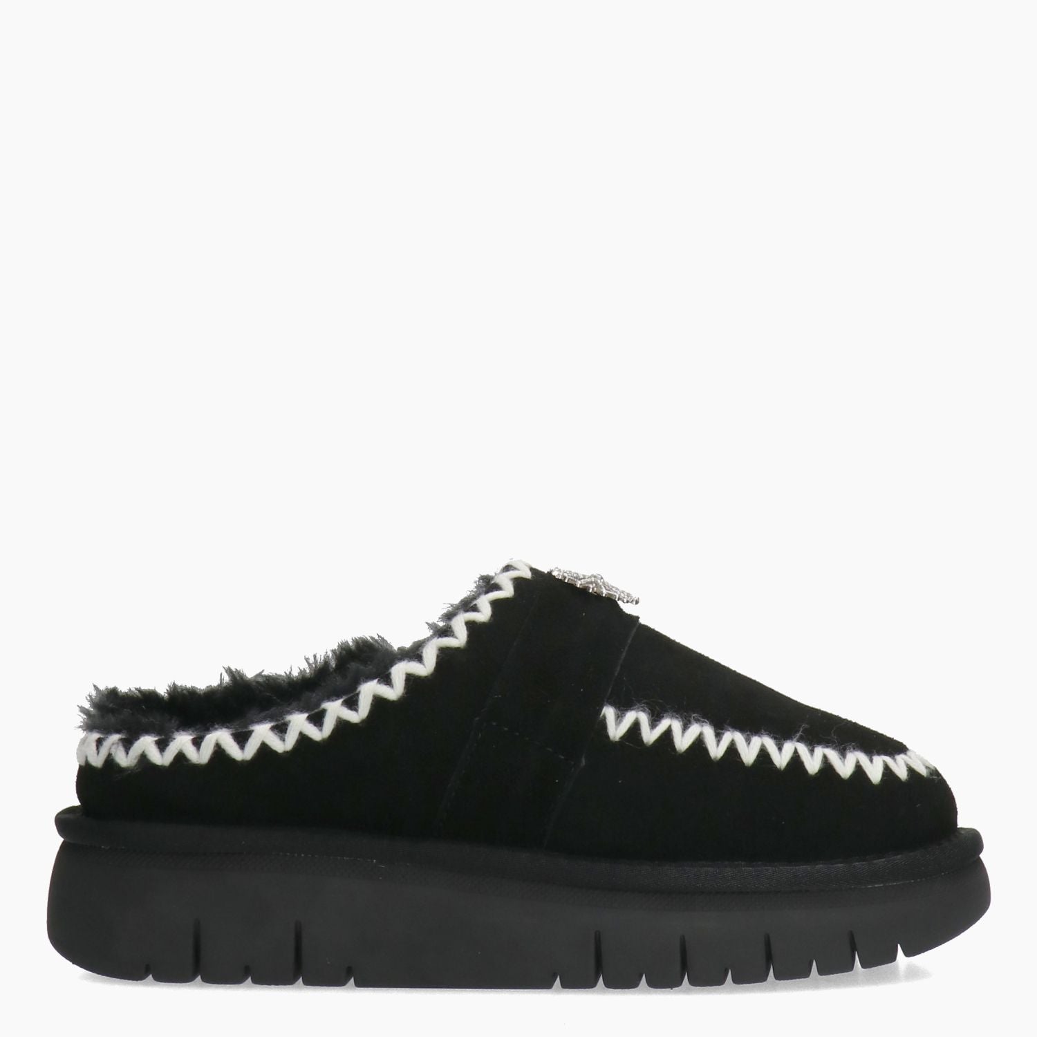 Sabot Grunland con tomaia in ecomontone nero. Fascetta con strass con cucitura bianca. Interno in ecopelo nero. Suola in gomma. Collezione Grunland donna Autunno/Inverno.
