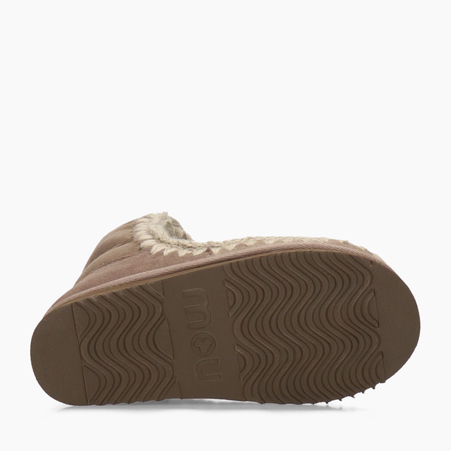 Mou Eskimo24 con tomaia in pelle scamosciata in colore tortora. Cuciture in lana melange a contrasto. Punta tonda. Logo in tessuto nel tallone. Interno in pelo. Suola in gomma. Collezione Mou donna Autunno/Inverno.