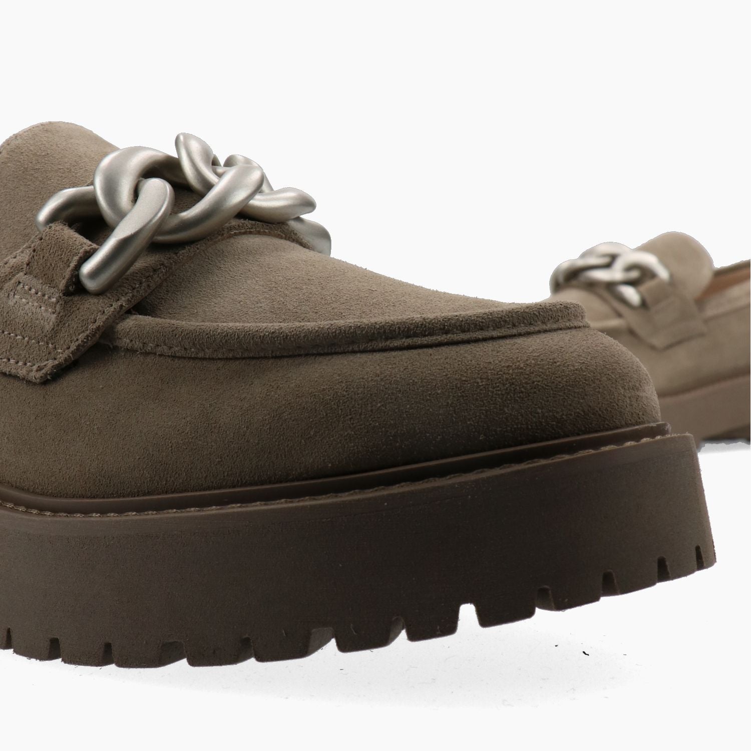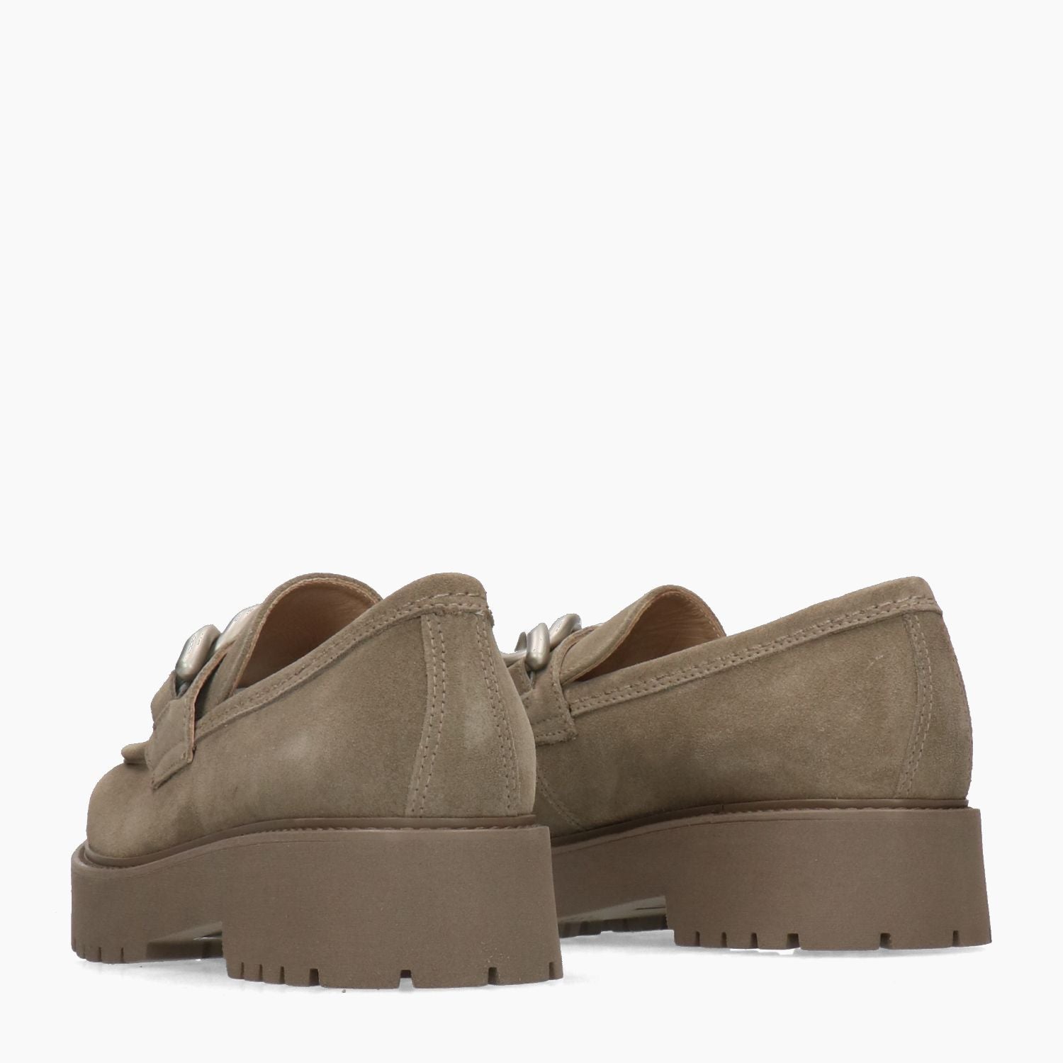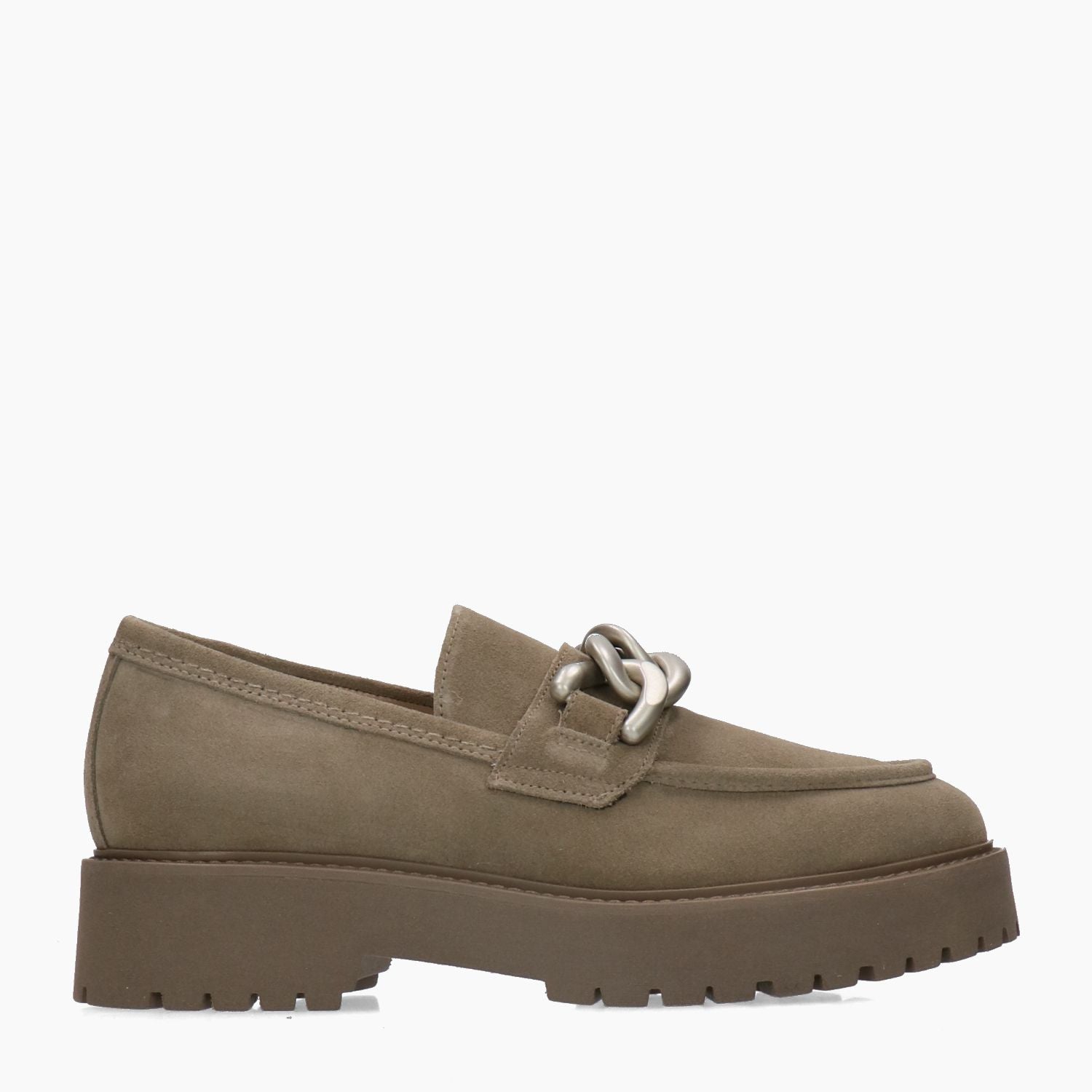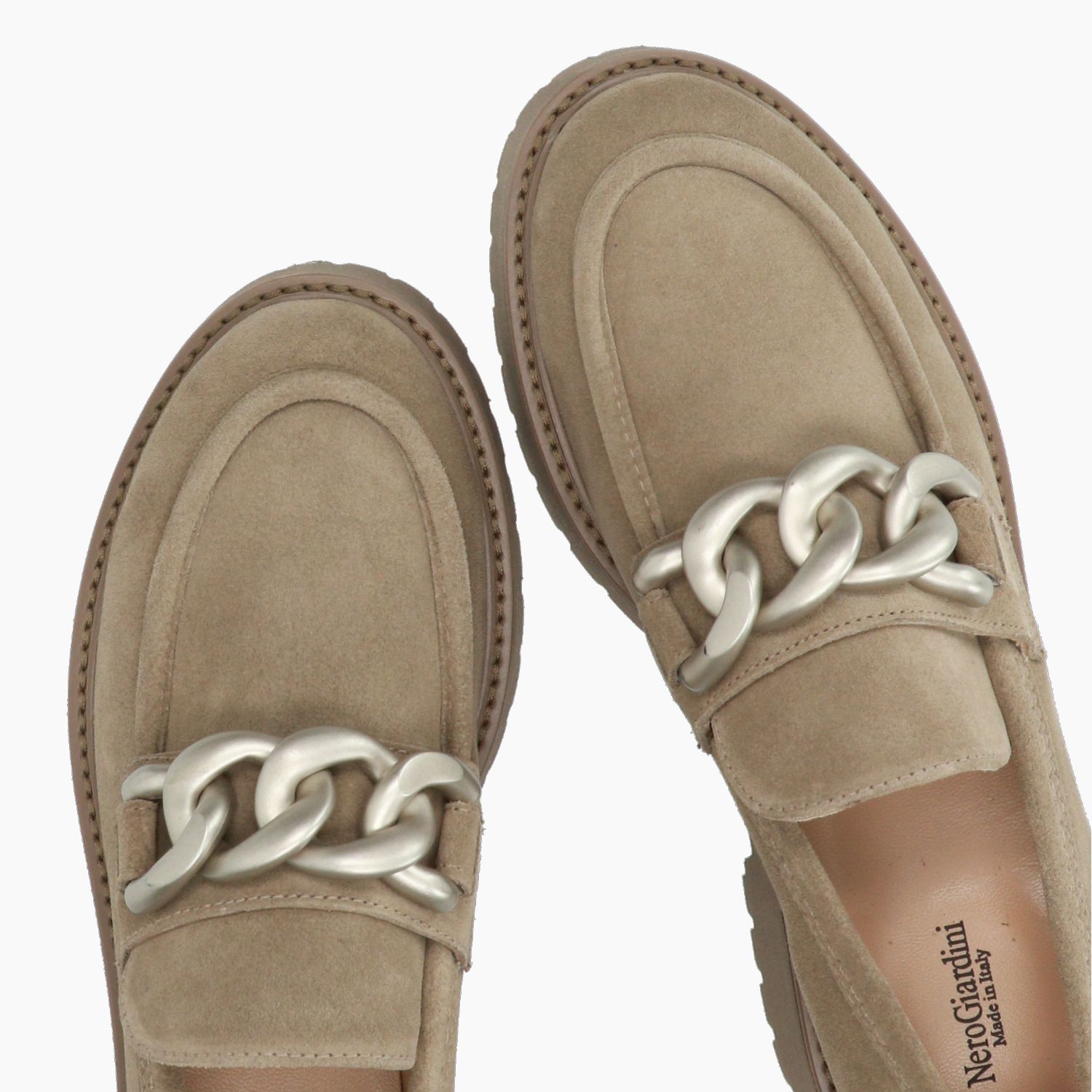 Mocassini in camoscio tortora con fascetta catena in metallo argento satinato. Punta tonda. Interno in pelle beige. Suola in gomma. Tacco di 4,5 cm. Collezione Nero Giardini donna Autunno/Inverno.