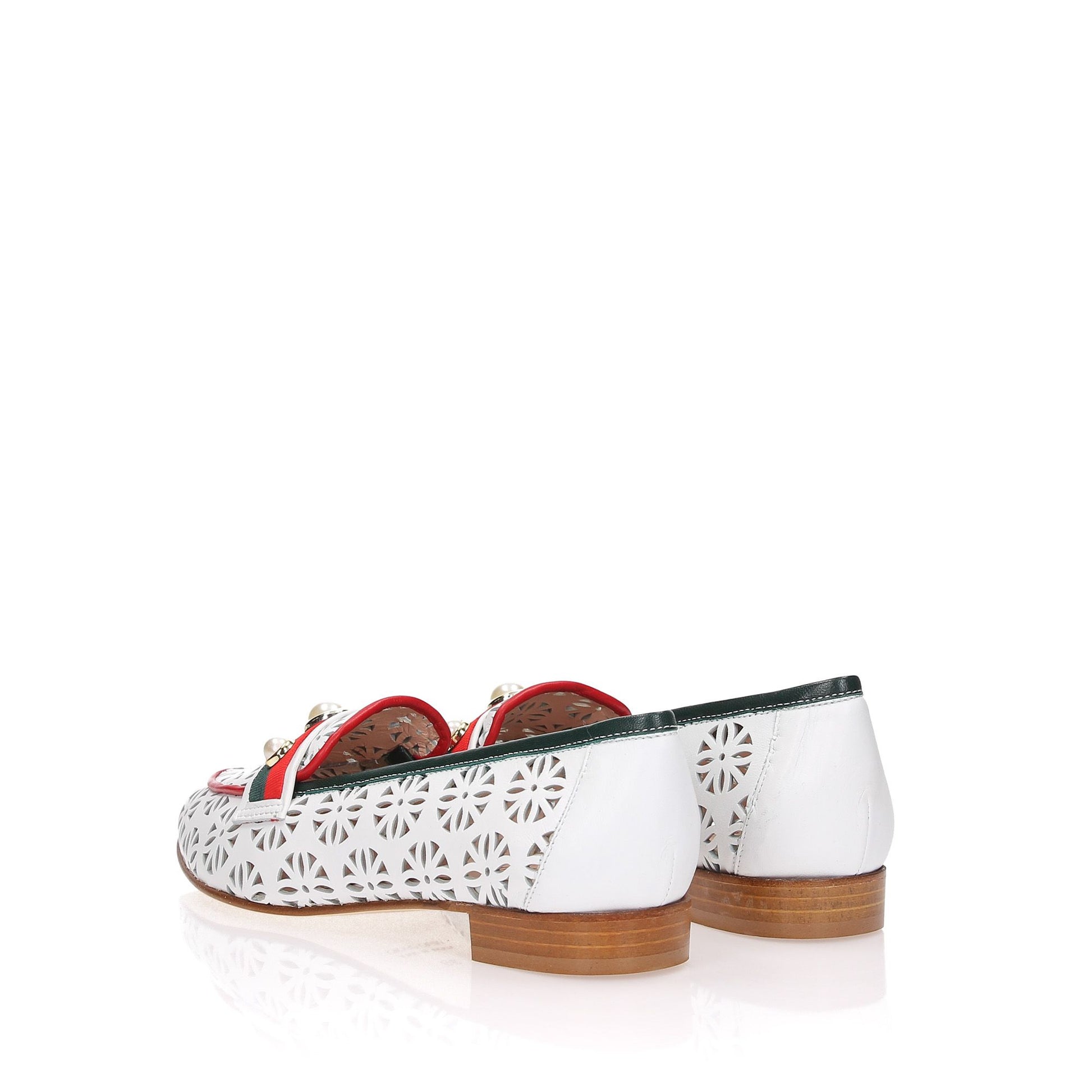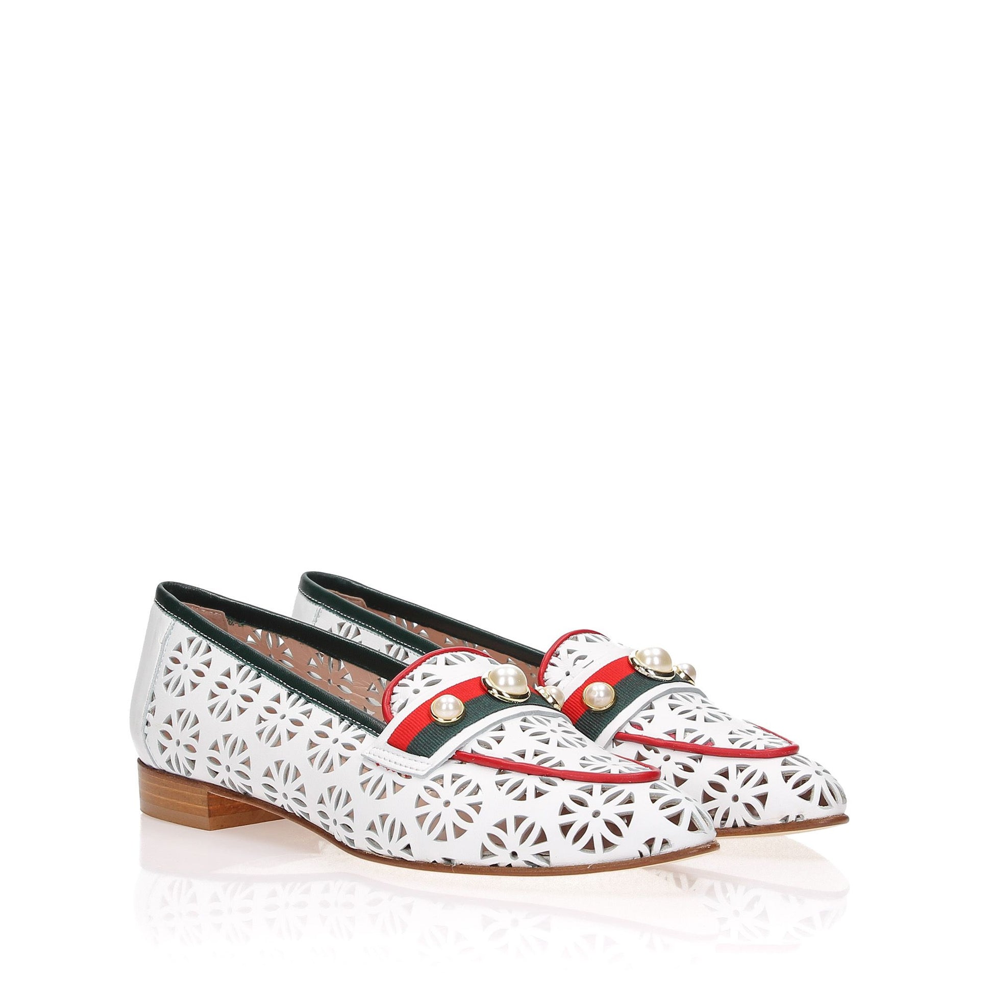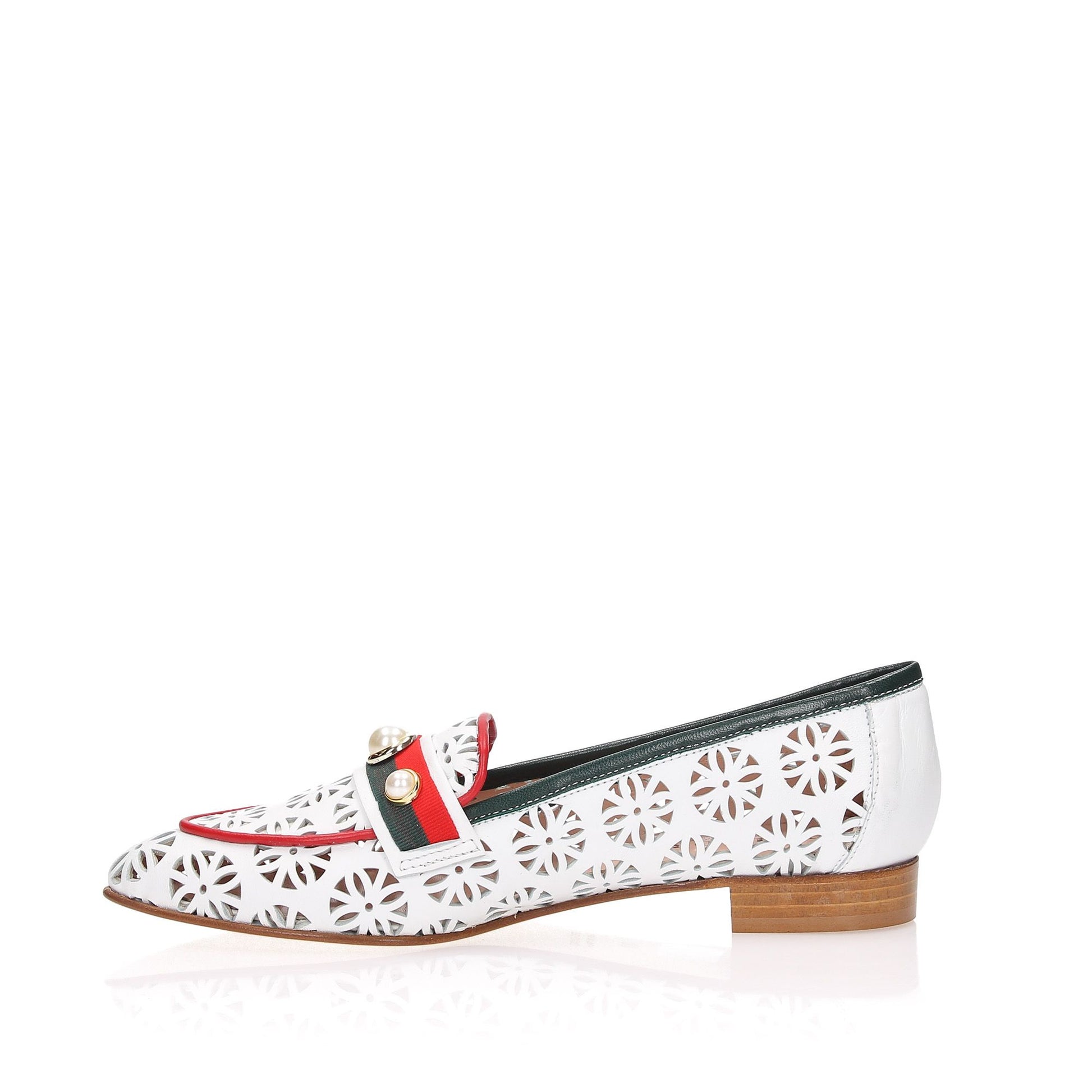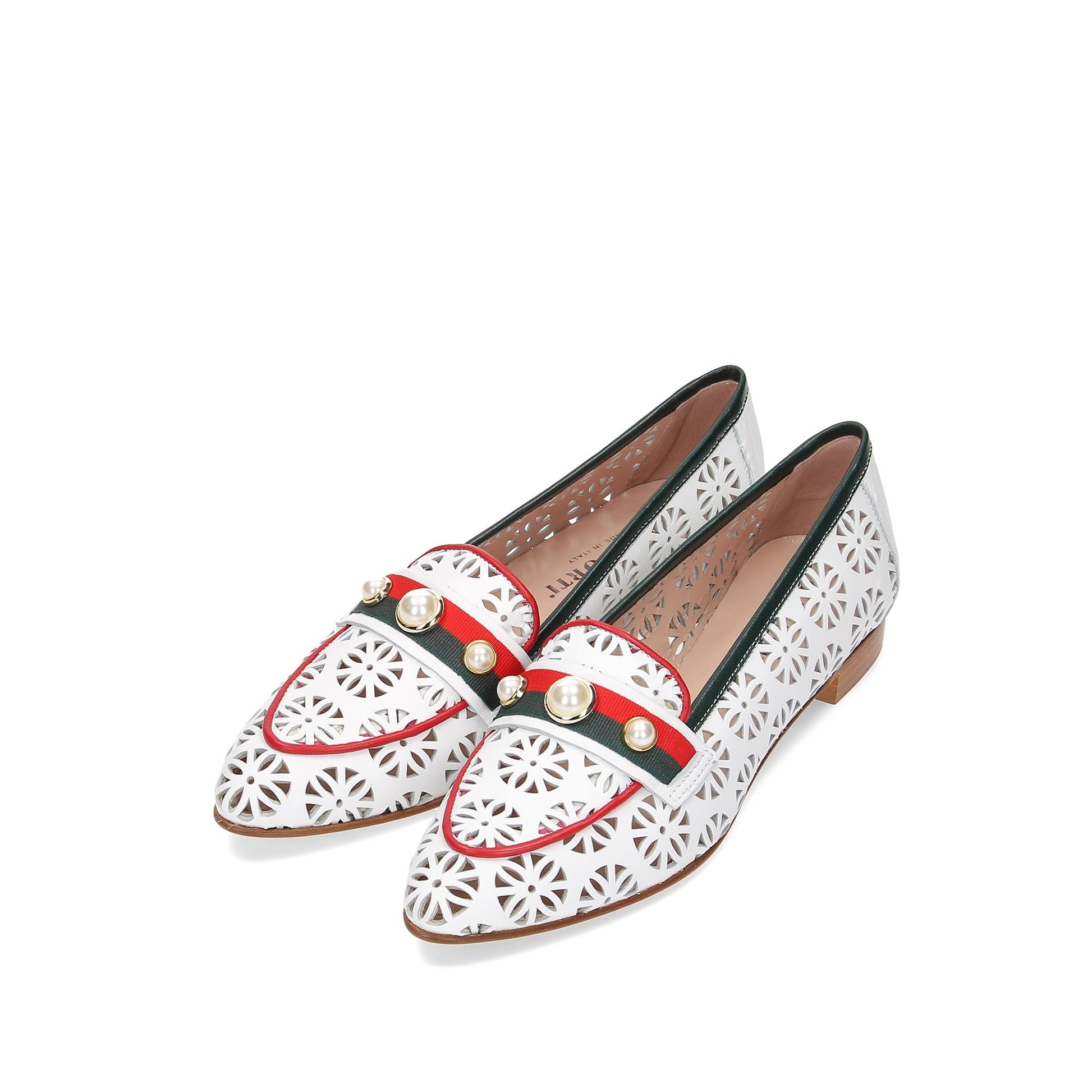Mocassini in pelle bianca con profili in pelle rossa e blu, fascietta in gro con perle applicate, tacco 20 fondo cuoio.