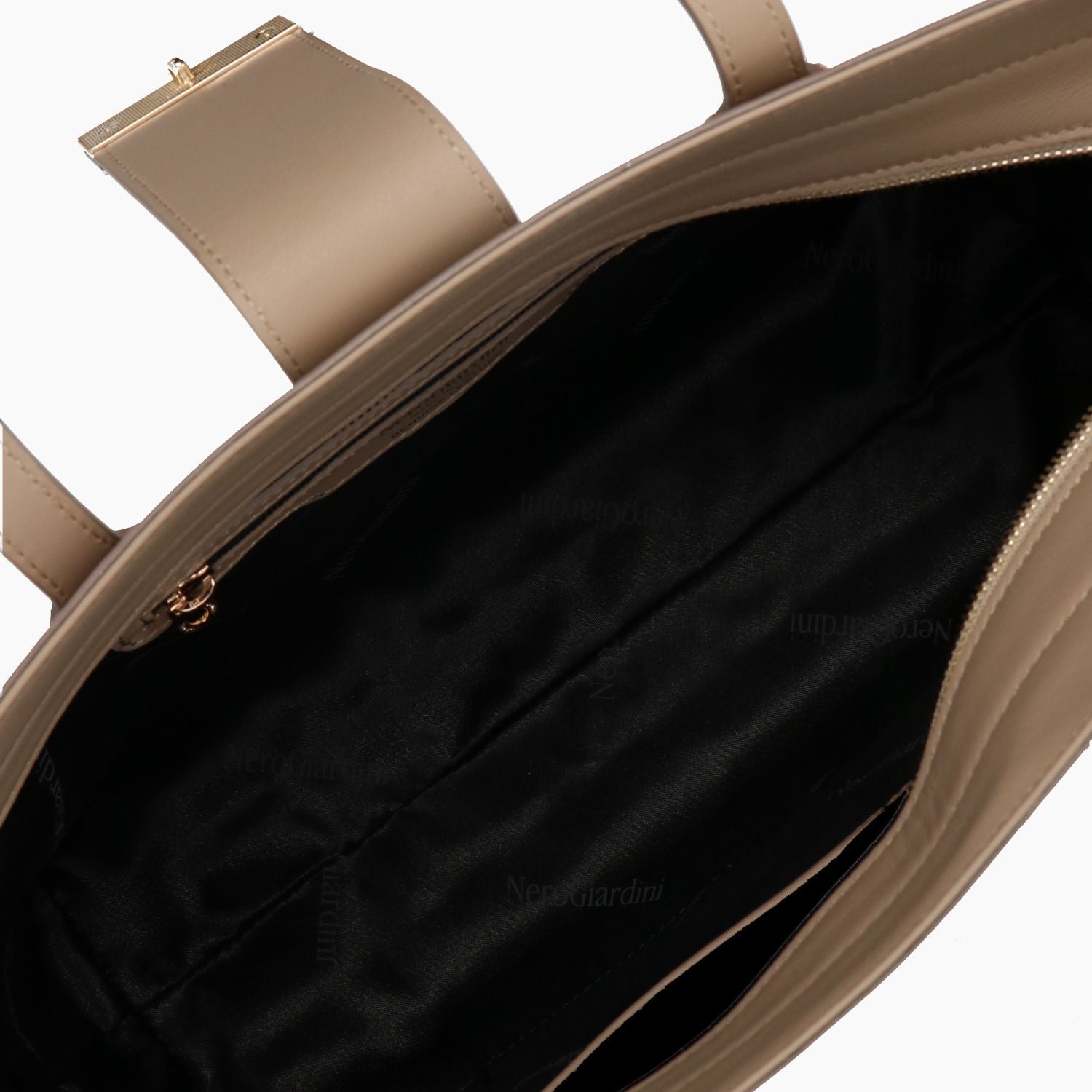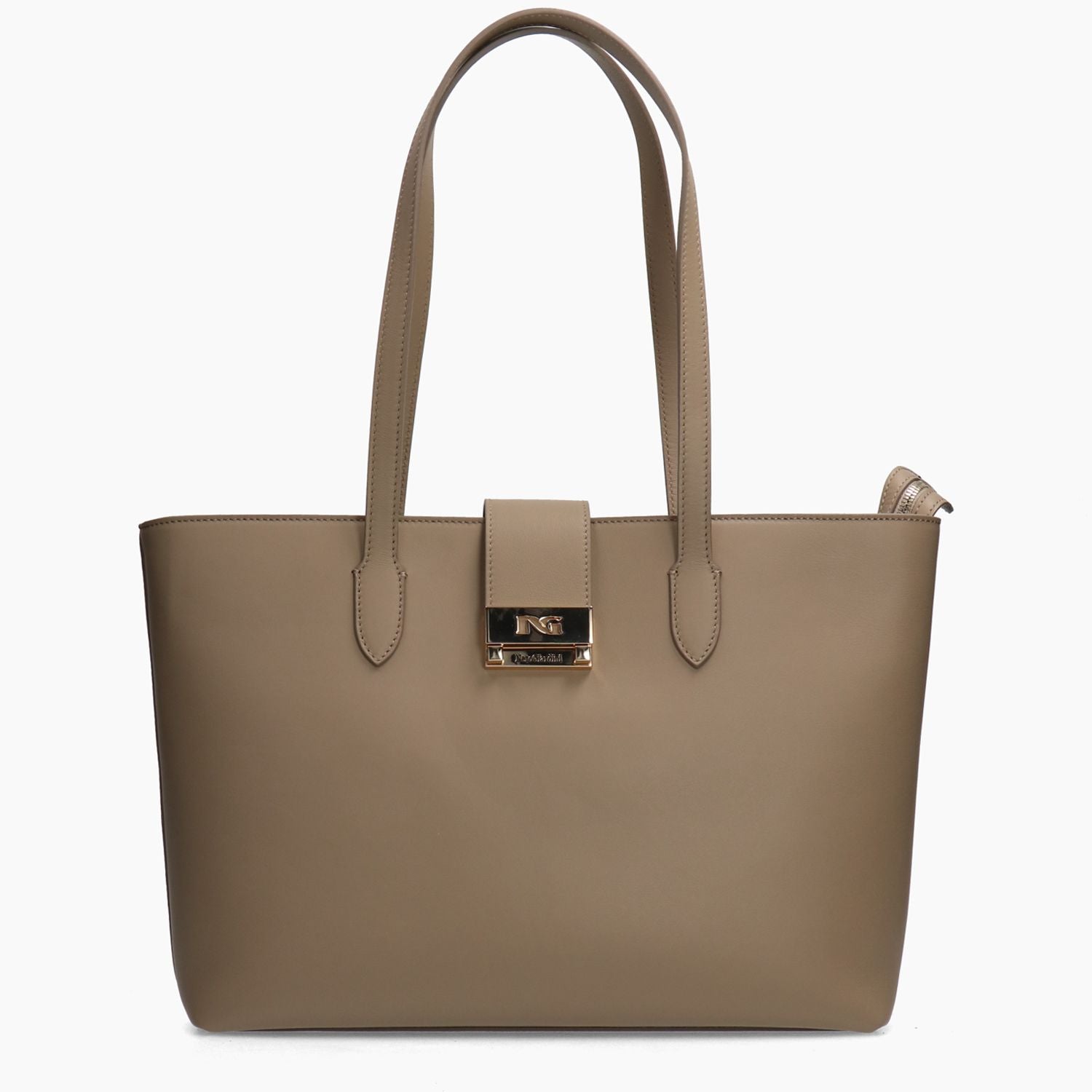 Borsa a due manici a spalla in pelle tgortora chiaro. Interno foderato in tessuto con doppia tasca di cui una chiusa con zip. Chiusura con zip. Cinturino con logo che chiude a scatto. Altezza 27 cm, Larghezza 43 cm, Profondita' 12 cm. Collezione Nero Giardini donna.