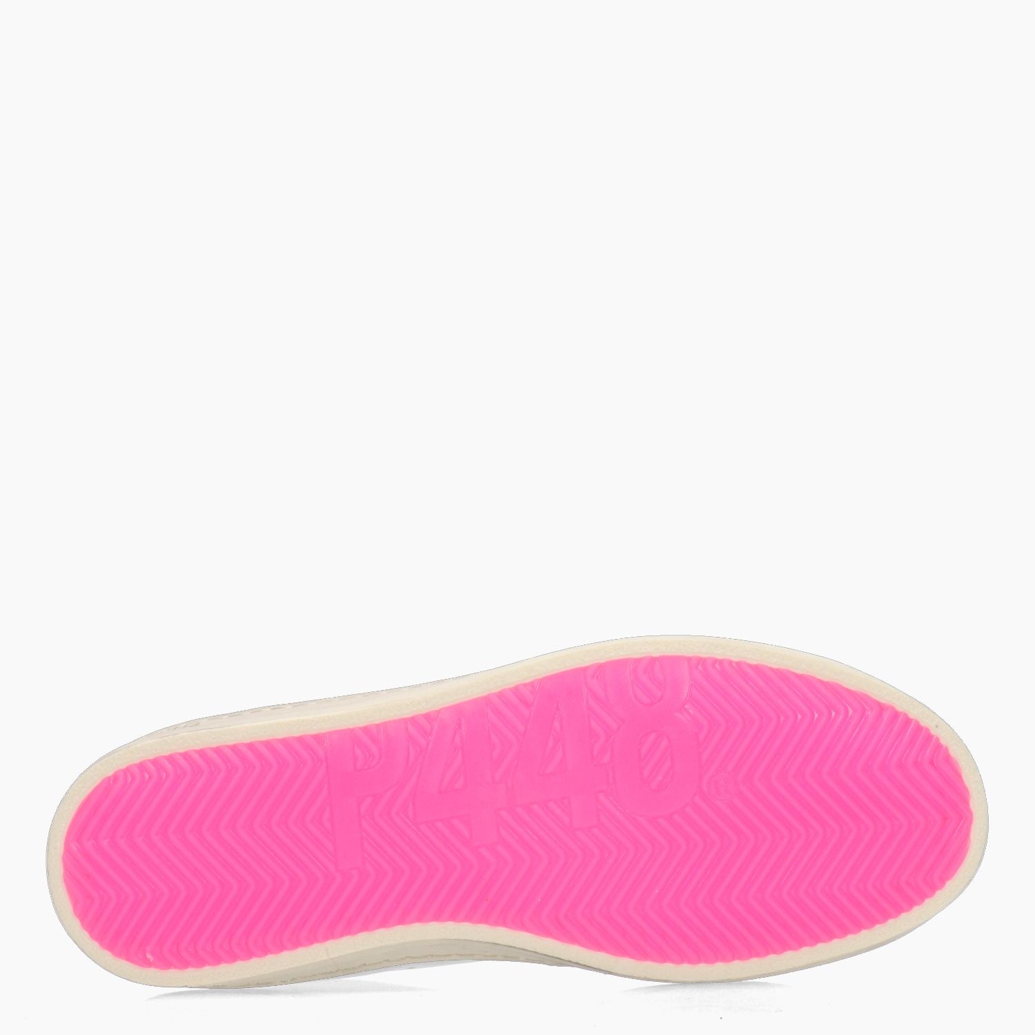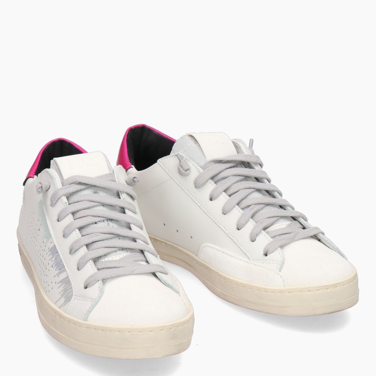 Sneakers P448 con tomaia in pelle bianca e logo traforato a lato. Ricami laterali iin cotone argento. Chiusura tramite lacci grigi. Linguetta con logo. Talloncino in pelle fuxia. Interno in tessuto e pelle con sottopiede estraibile. Suola in gomma. Collezione P448 donna.