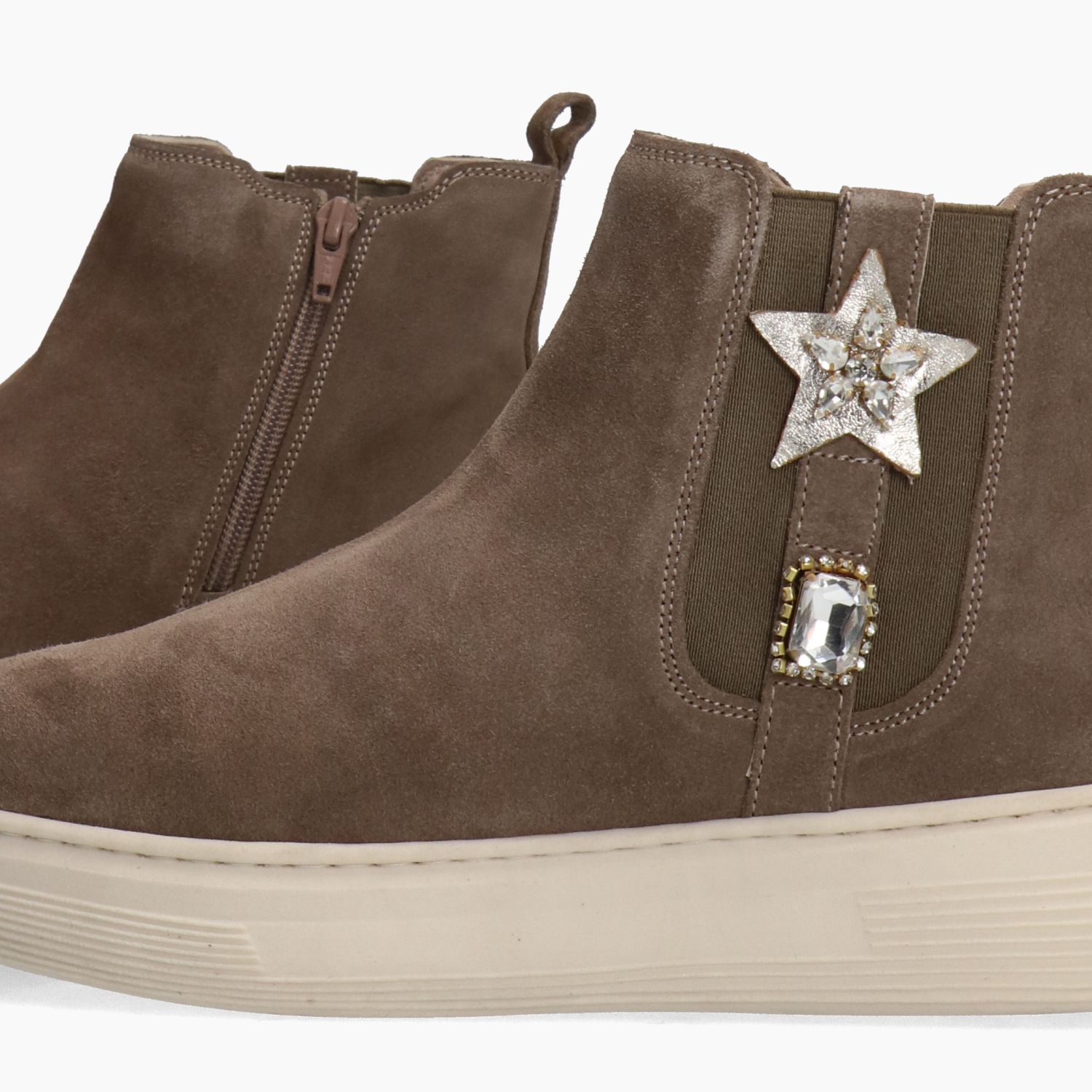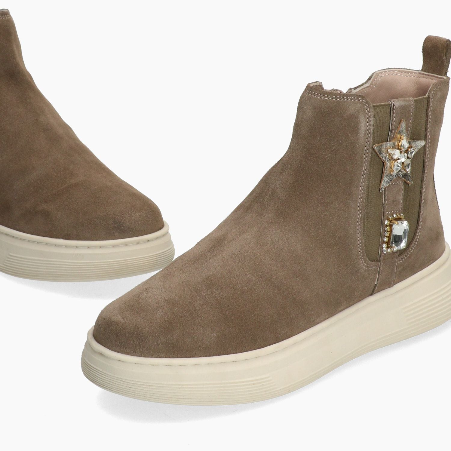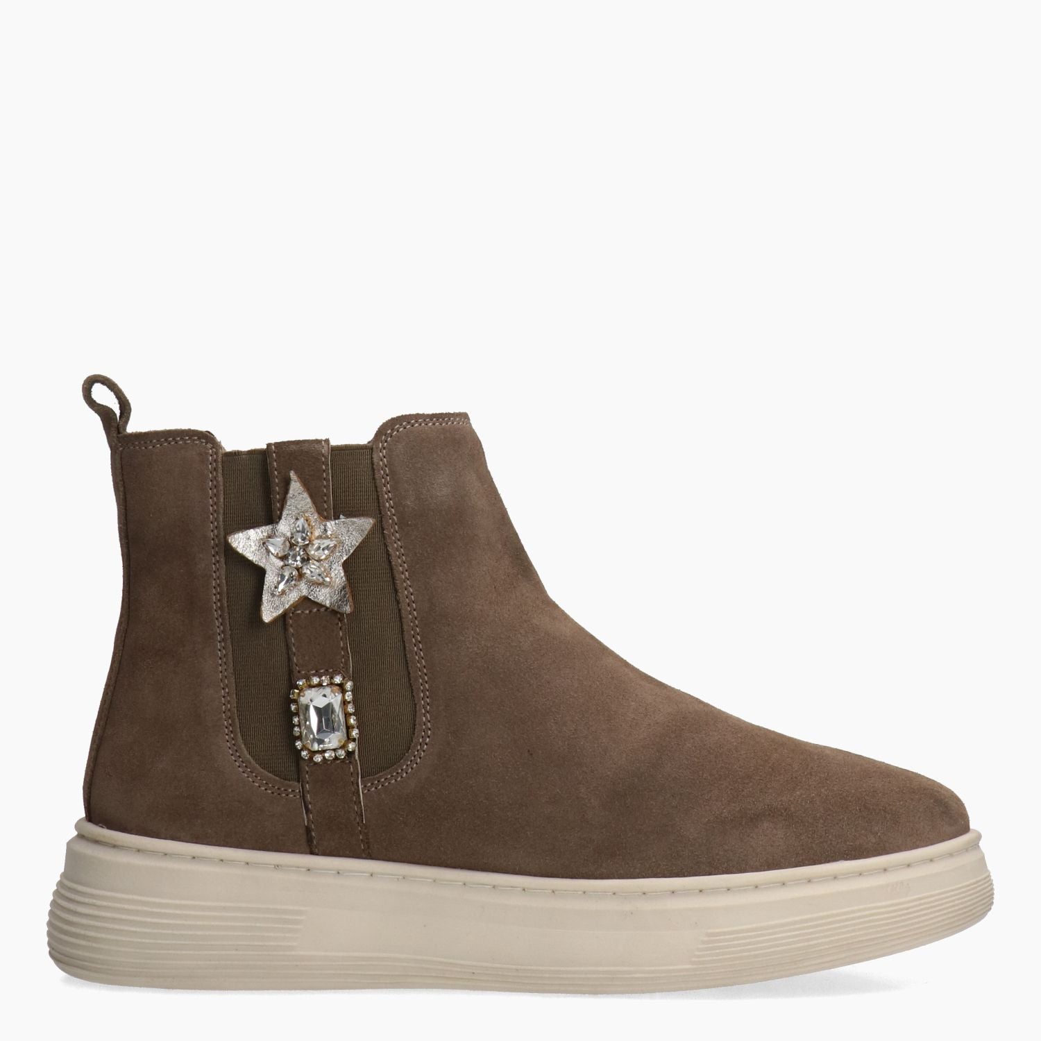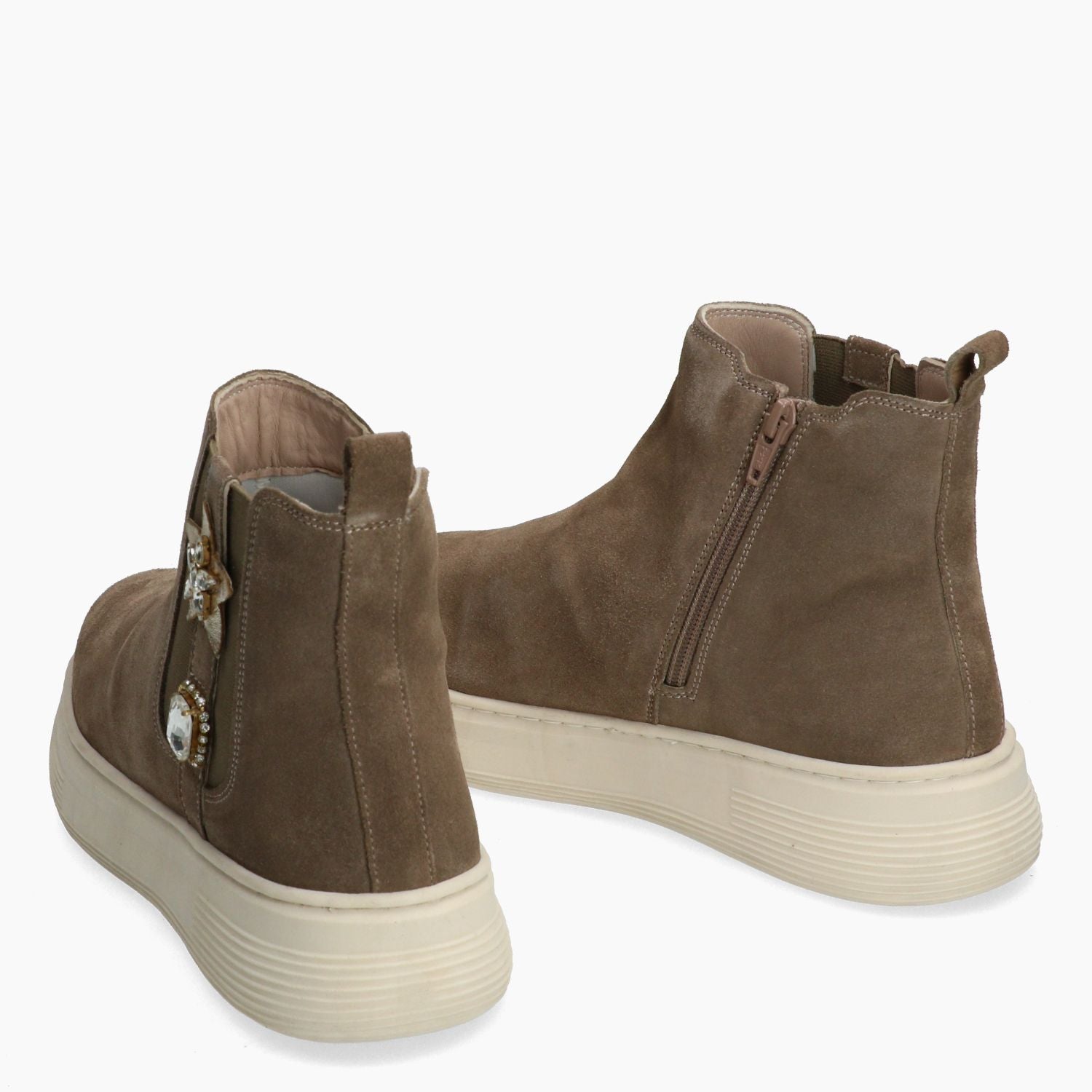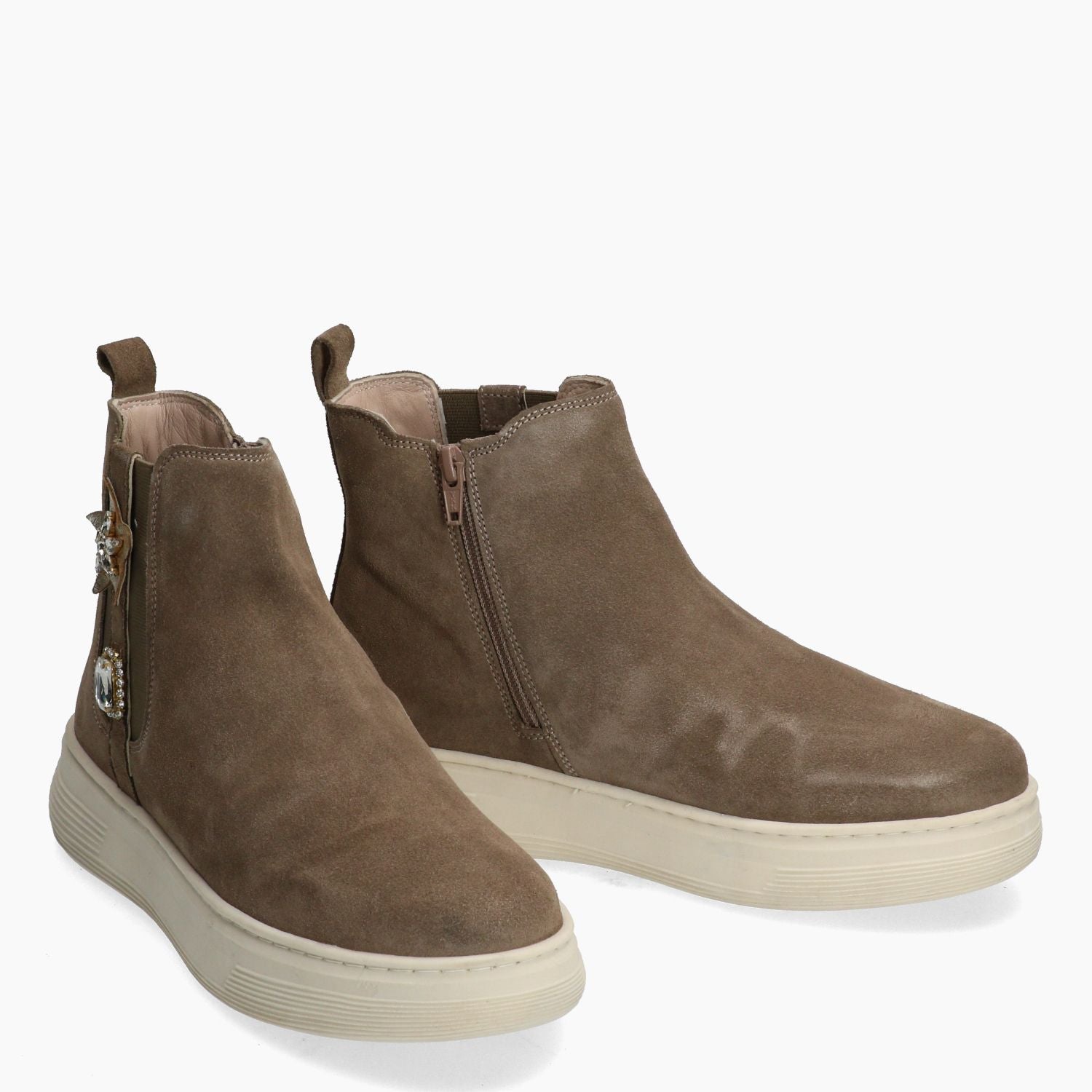 Stivaletti in pelle scamosciata tortora. Chiusura tramite zip interna. E' presente l'elastico esterno con stella e strass per migliorare la calzata sulla caviglia. Interni in pelle e tessuto. Soletta interna non rimovibile in pelle. Zeppa in gomma di 4 cm. Collezione Melluso donna Autunno Inverno.
