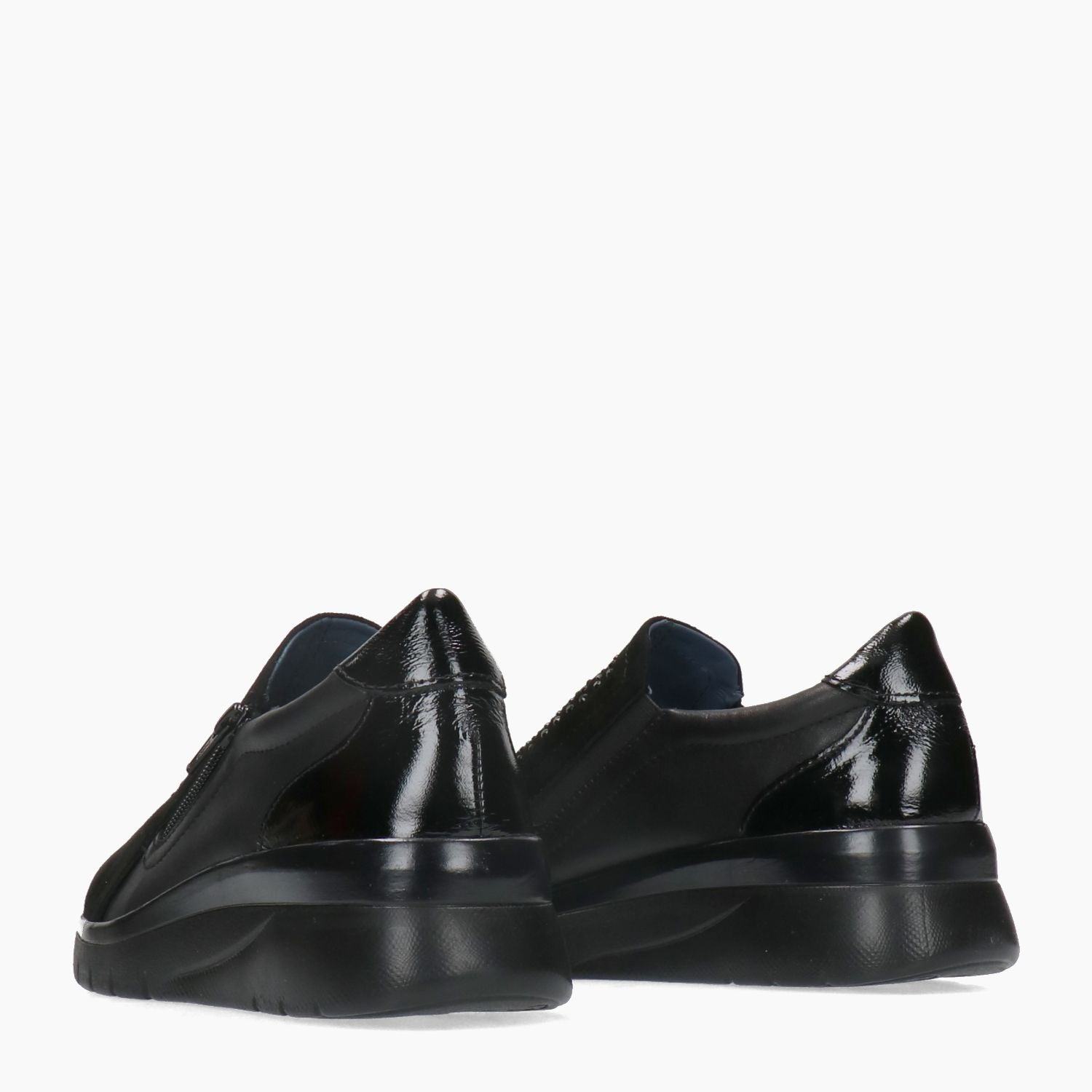 Sneakers con tomaia in pelle scamosciata nera. Strass neri sul collo del piede. Punta tonda. Chiusura con zip. Suola in gomma di 4 cm. Collezione Melluso donna Autunno/Inverno.