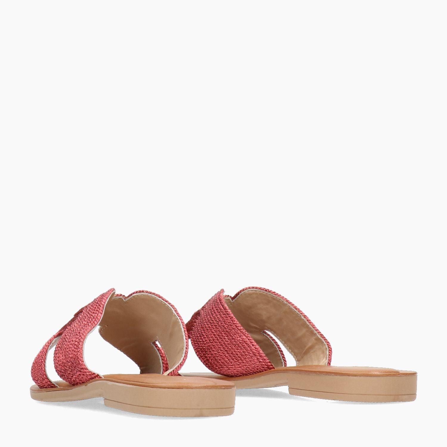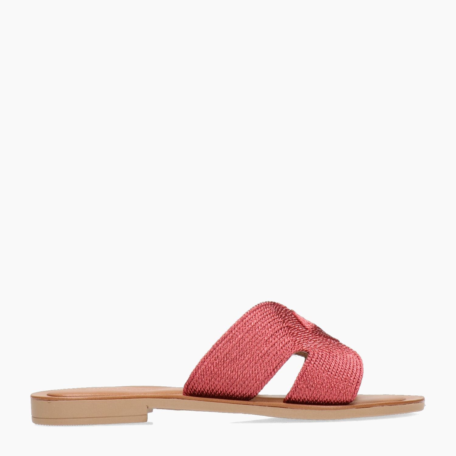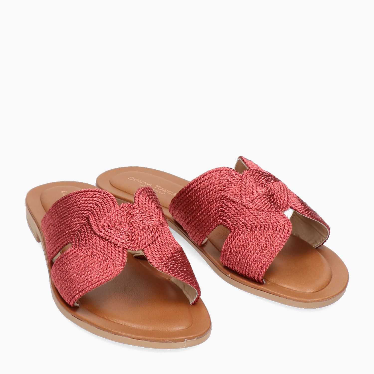 Ciabatta in tessuto tipo treccia ciliegia. Interno in pelle. Suola in gomma con tacco di 1,5 cm. Collezione Donna Toscana primavera estate.