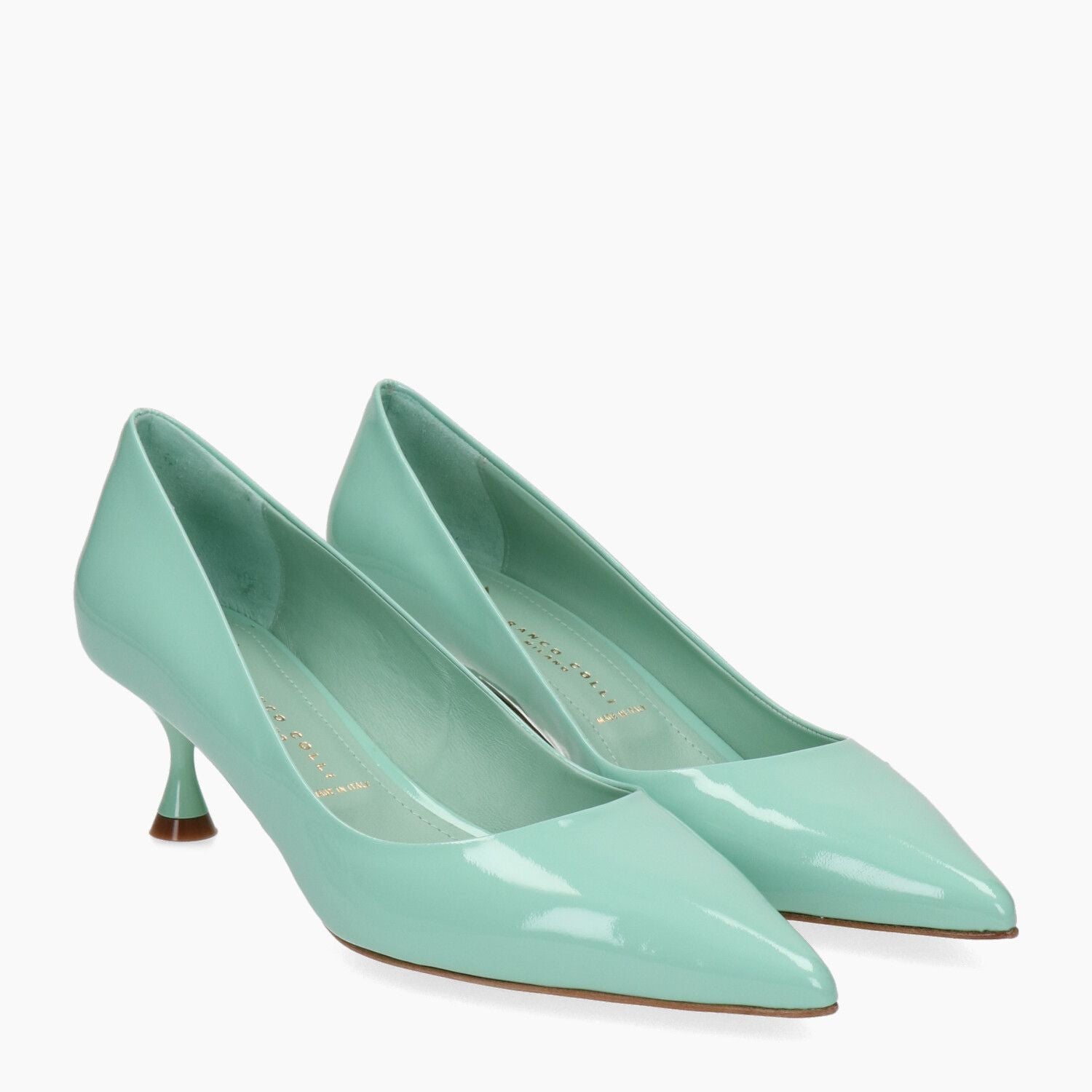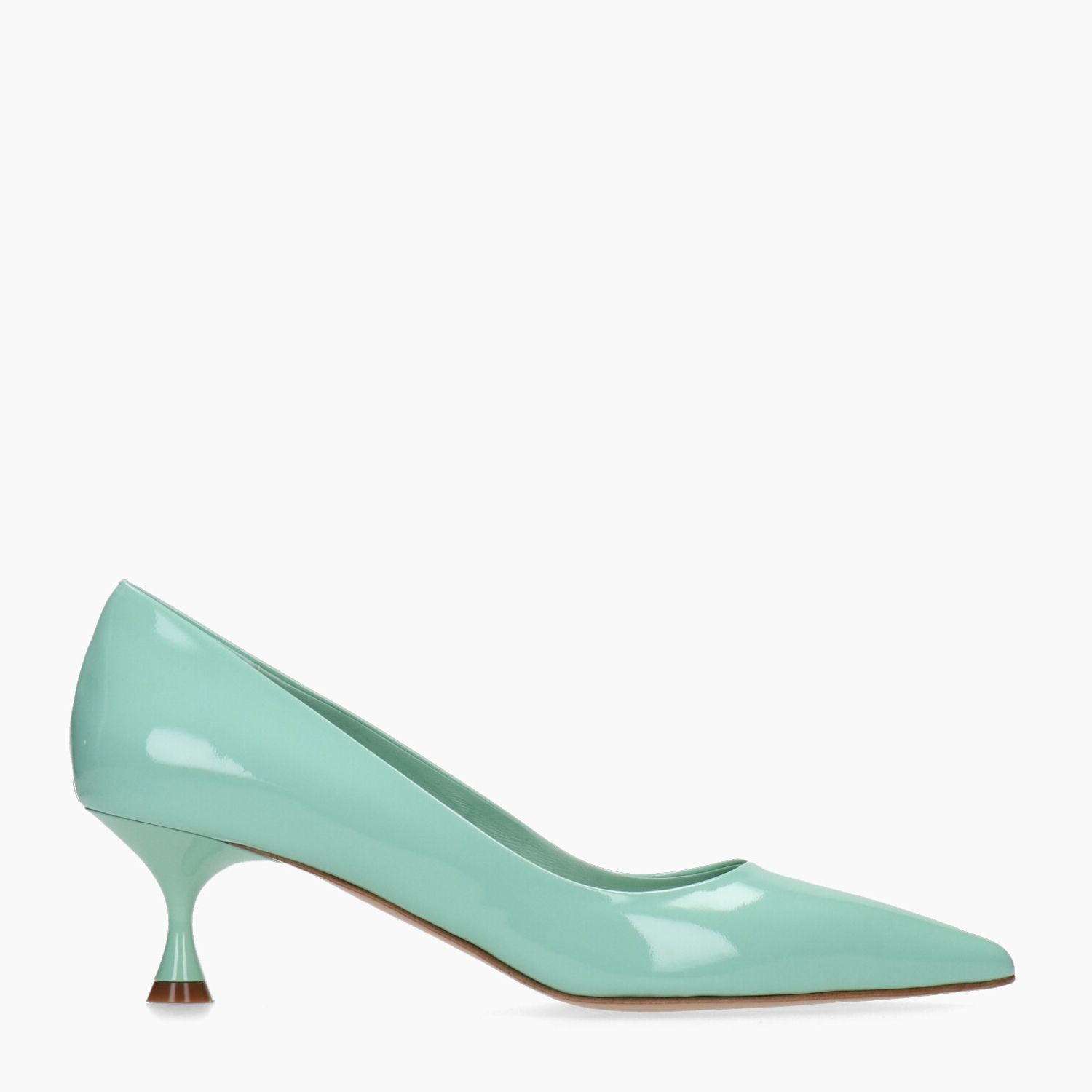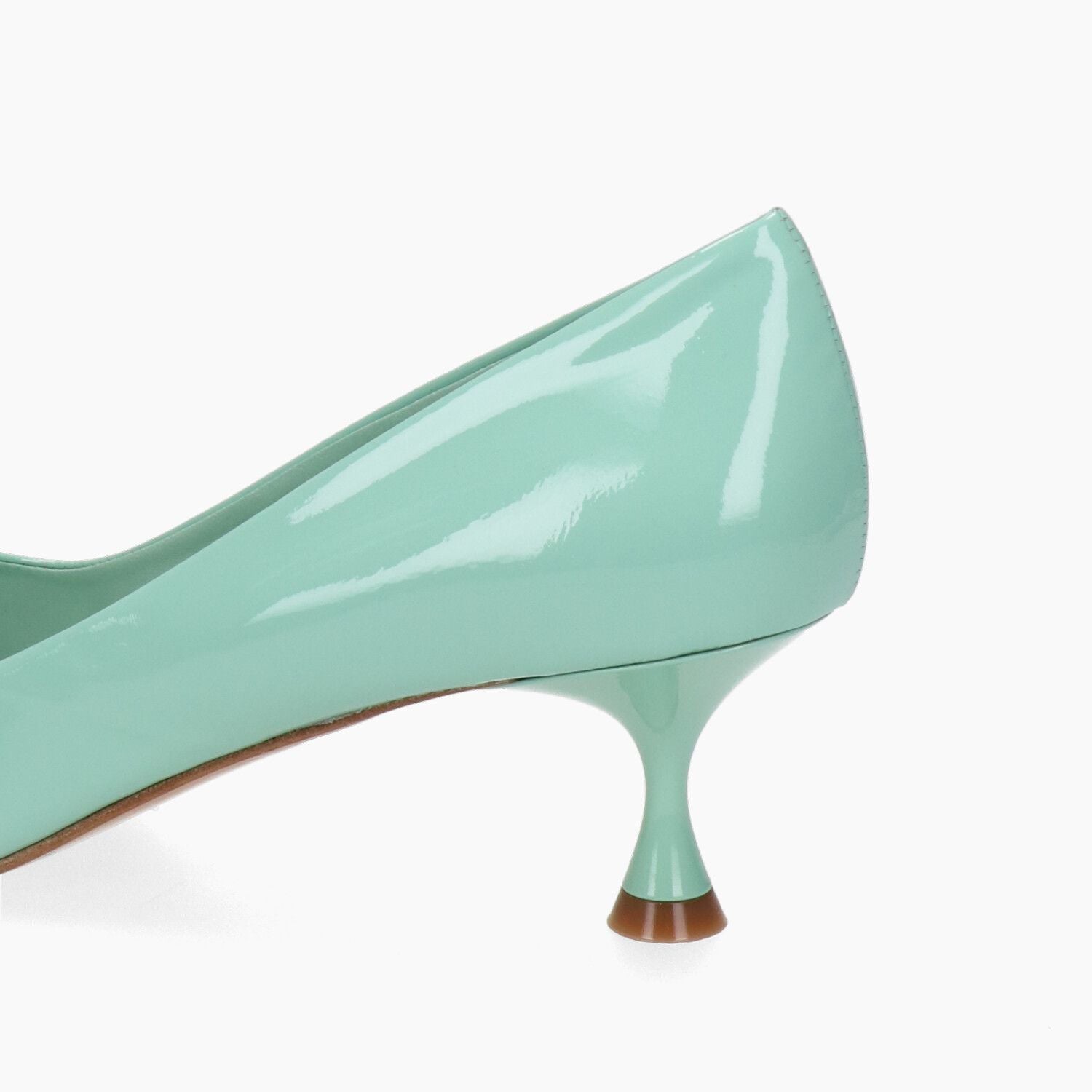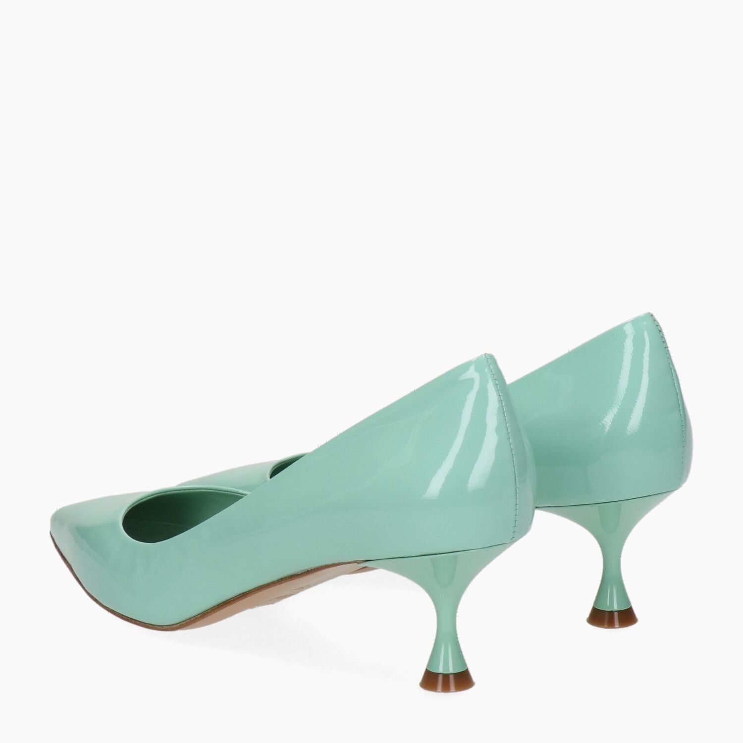 Decollete in vernice verde acqua, fondo cuoio.