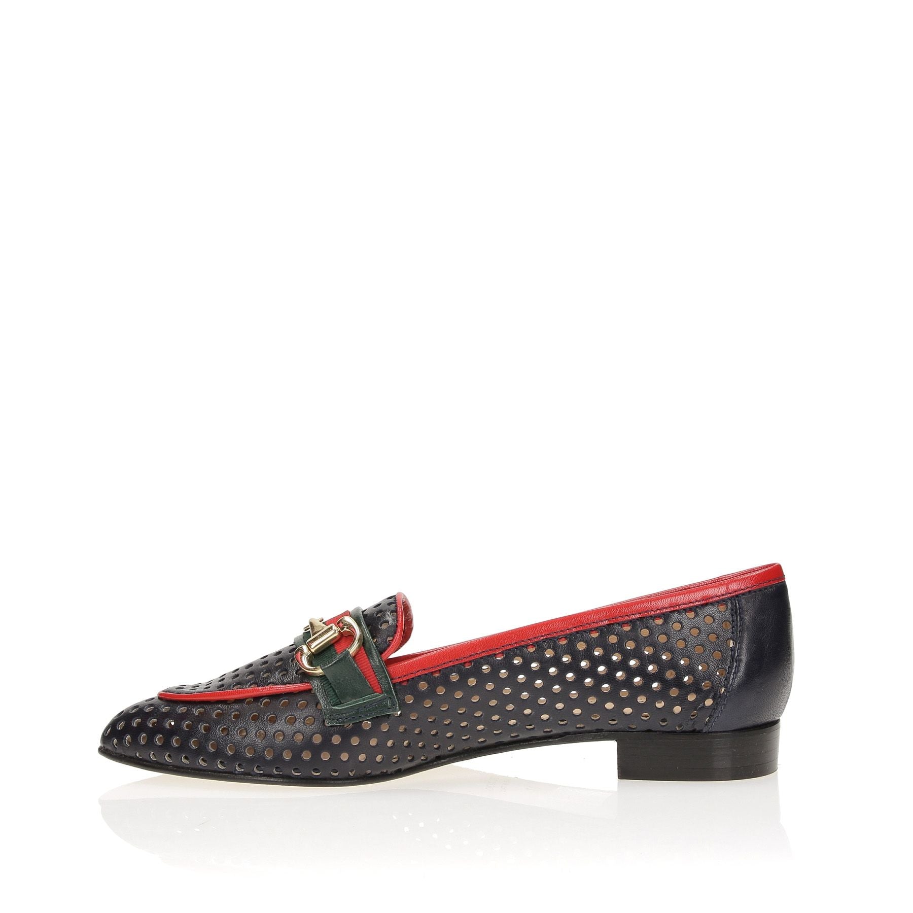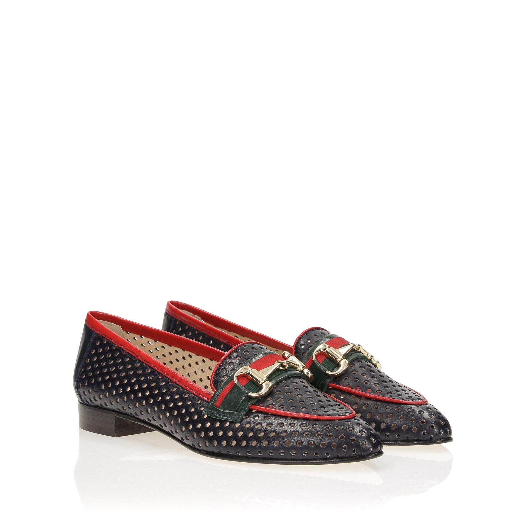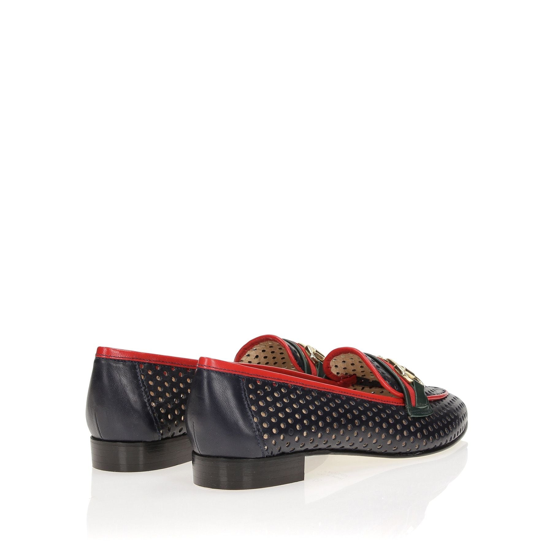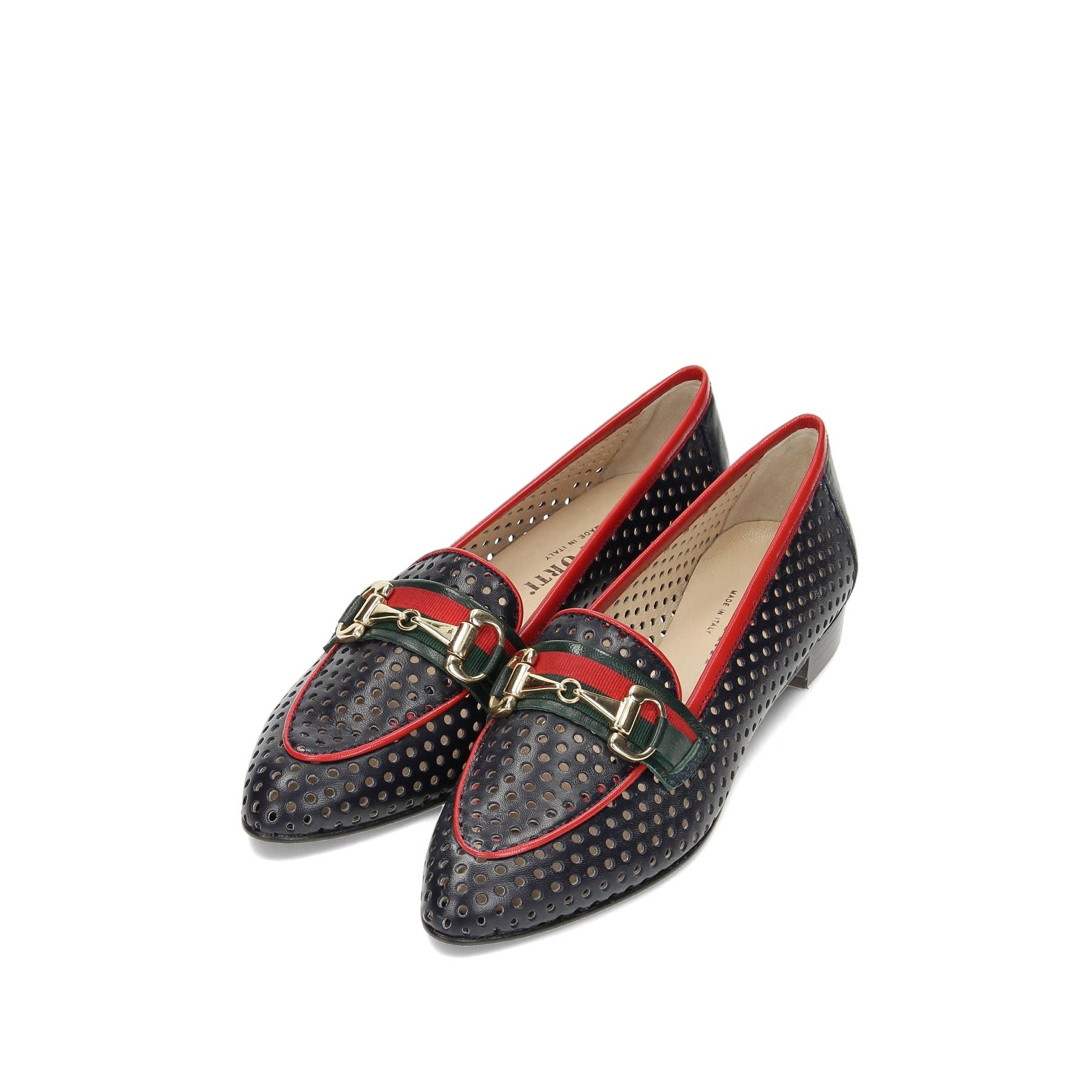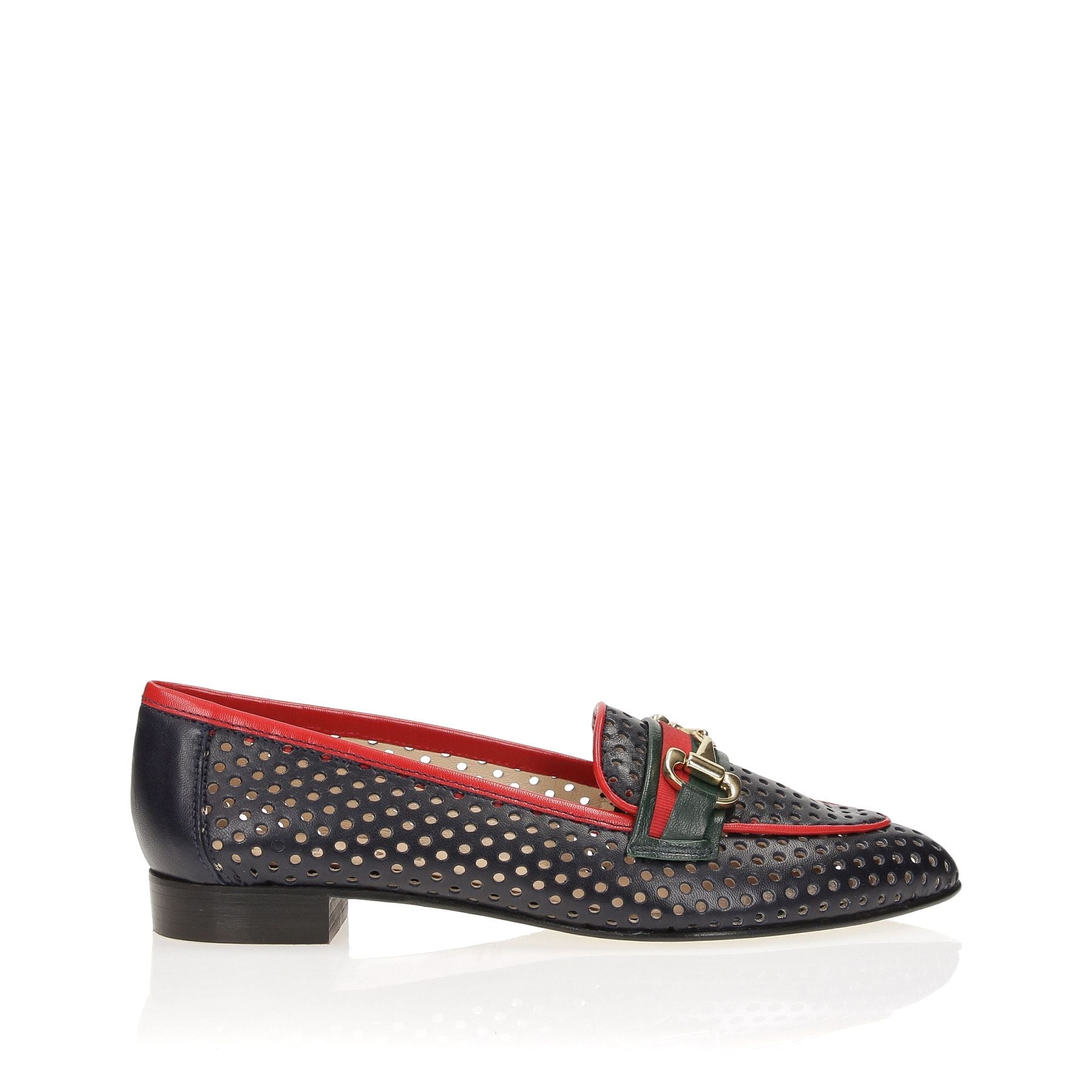 Mocassini in pelle blu navy traforata con profili rossi, morsetto in metallo, tacco 20 fondo cuoio.