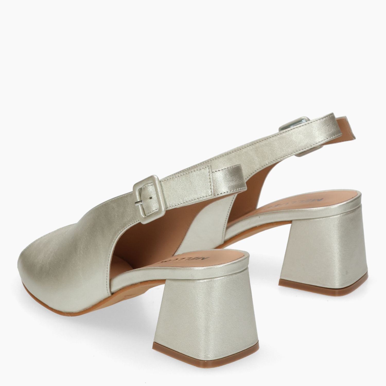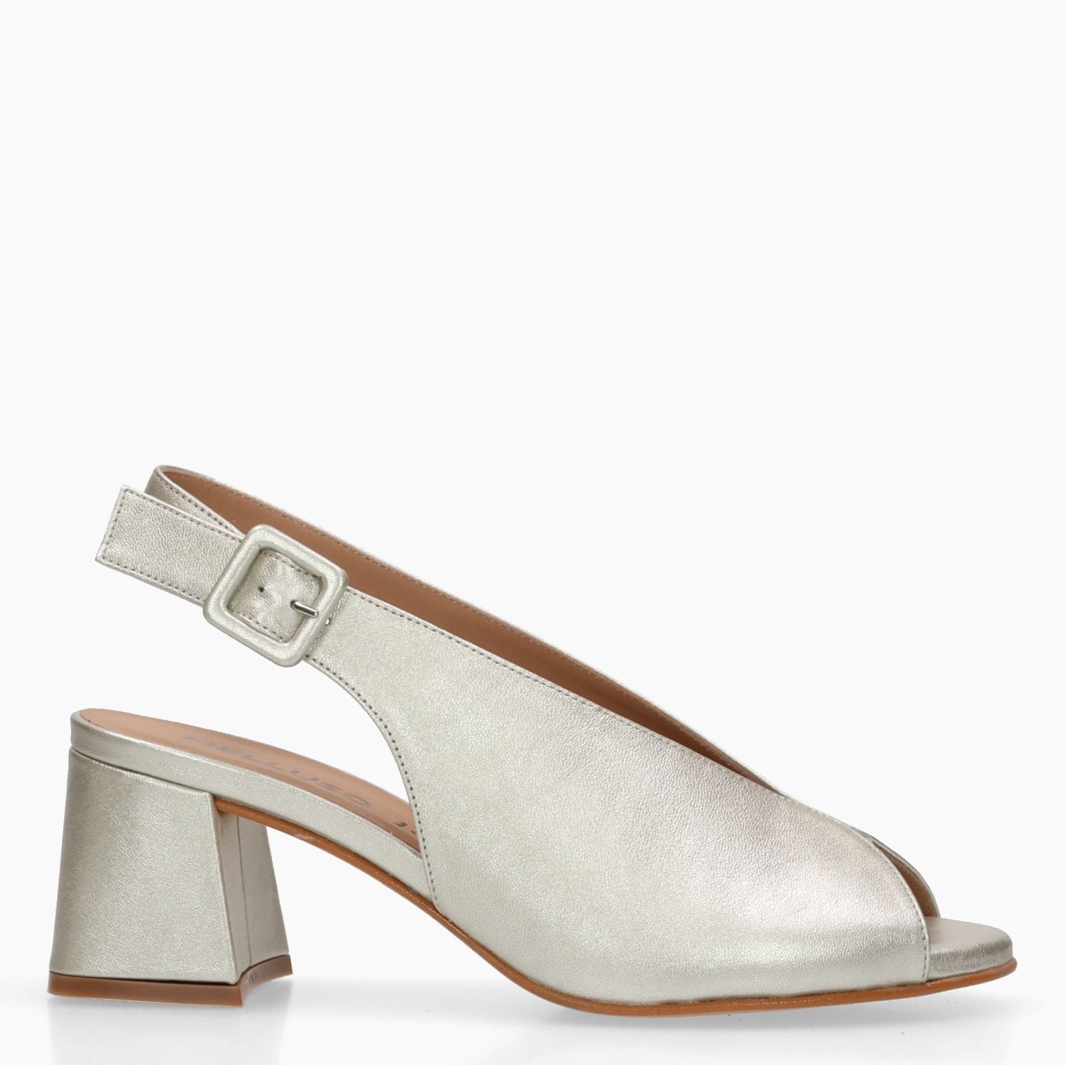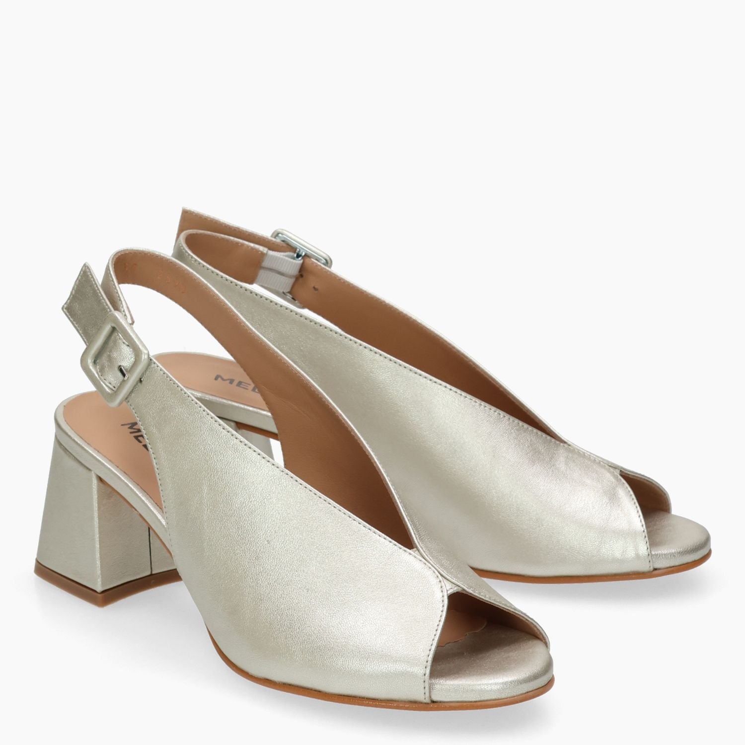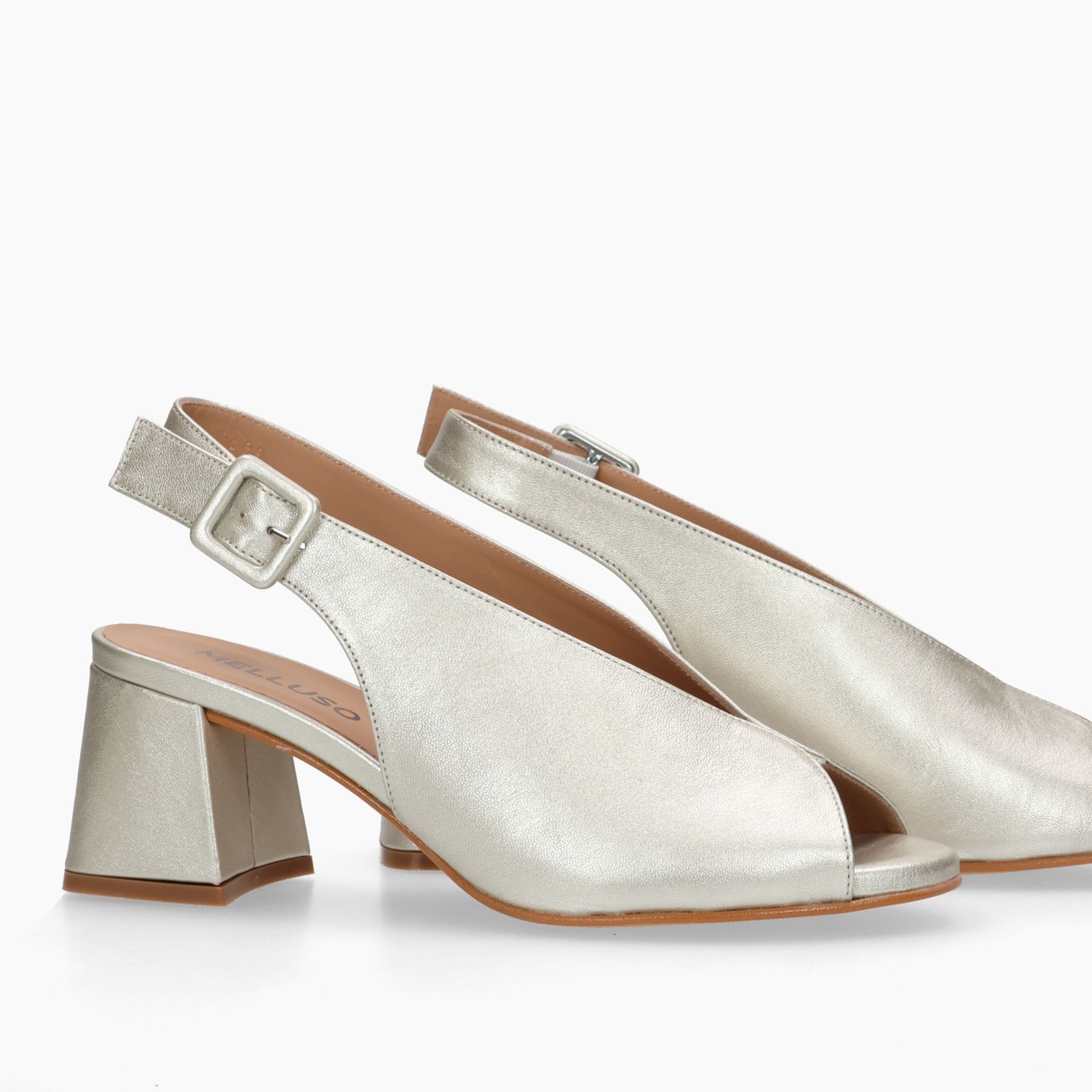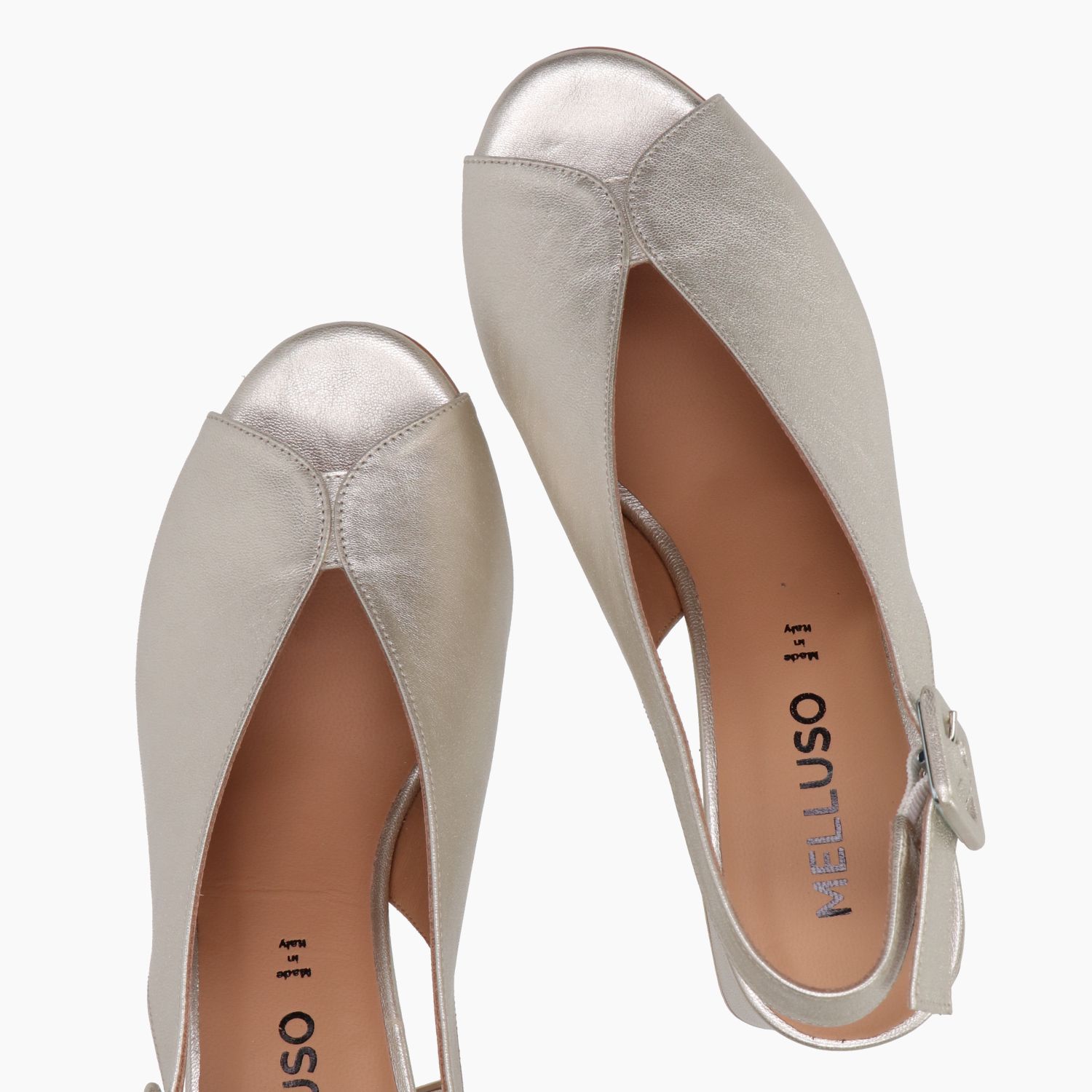Sandalo Melluso con tomaia in pelle laminata in colore platino. Chiusura con cinturino. Interno in pelle. Suola in gomma con tacco di 6 cm. Collezione Melluso donna Primavera/Estate.