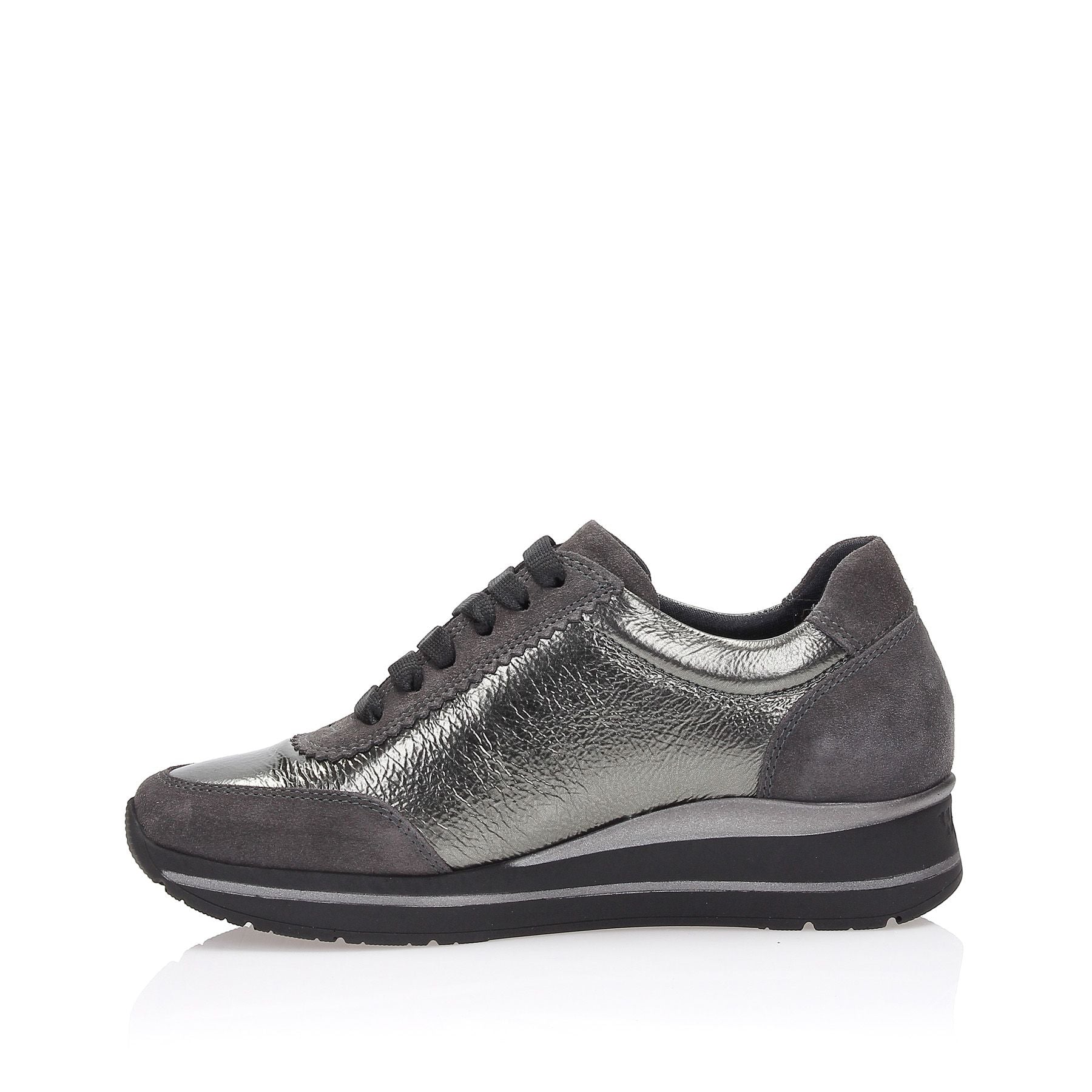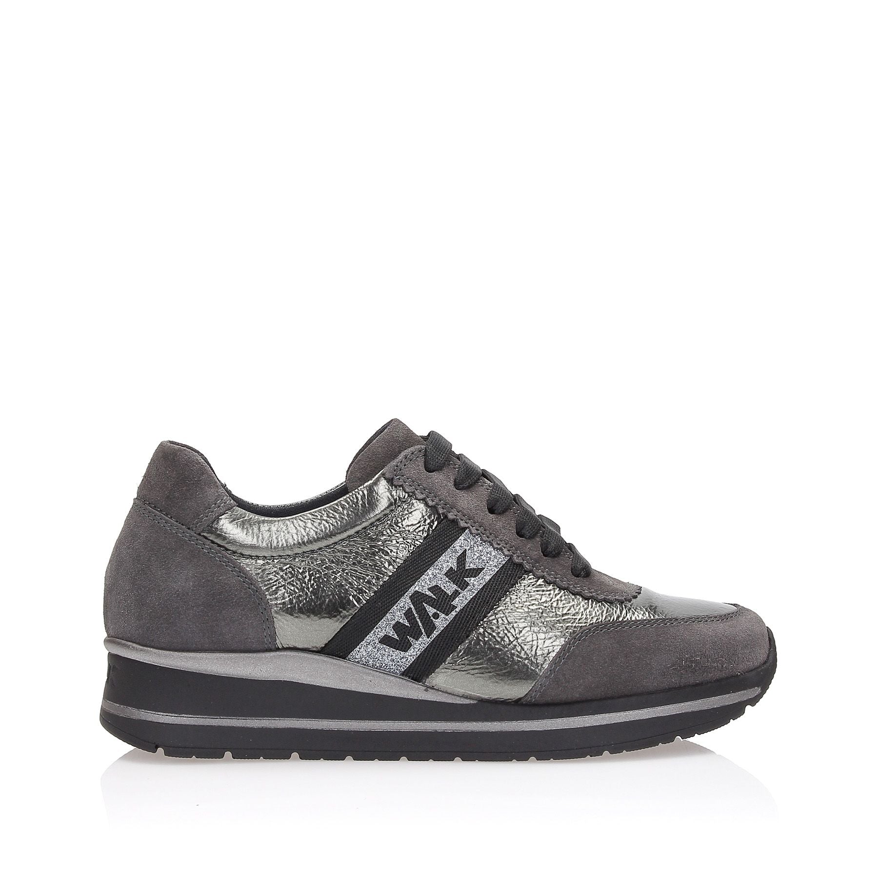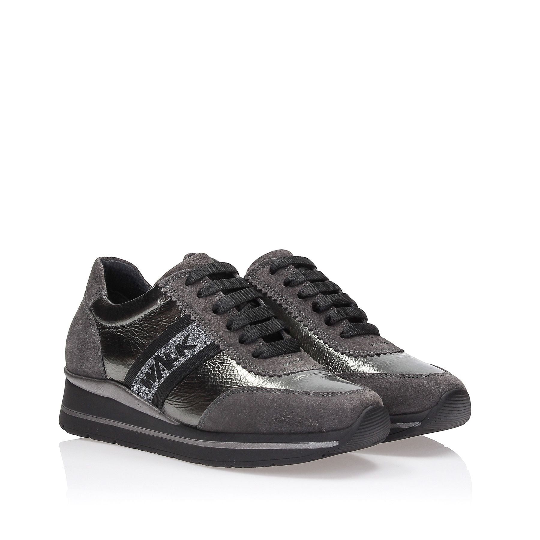Sneakers in pelle laminata antracite con riporti in camoscio grigio, zeppa 40 fondo gomma.