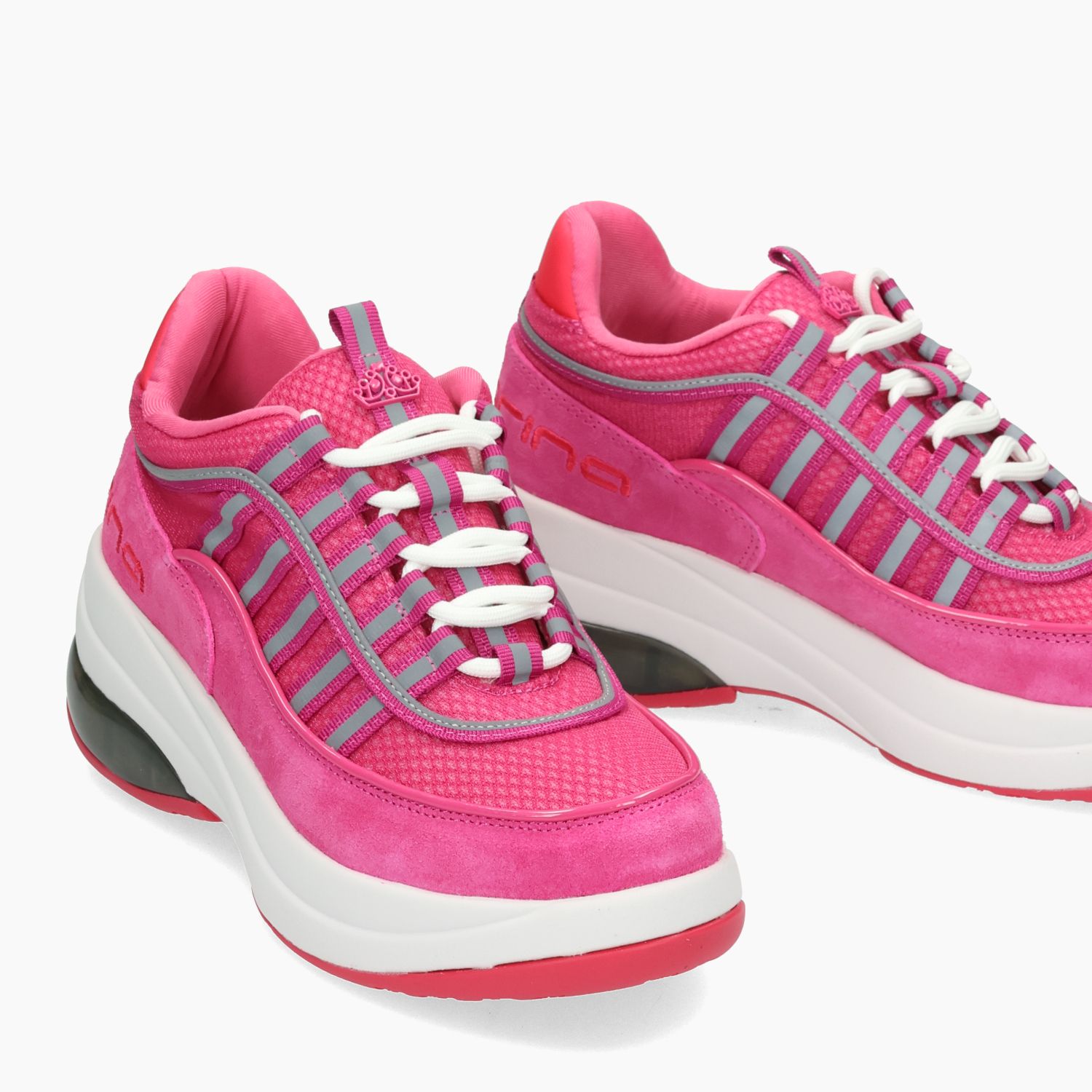 Sneakers in pelle scamosciata e nylon fuxia. Interno in pelle e tessuto con sottopiede estraibile. Stripe con tessuto catarinfrangente. Logo nel tallone. Suola in gomma con zeppa di 6 cm. Collezione Fornarina donna.