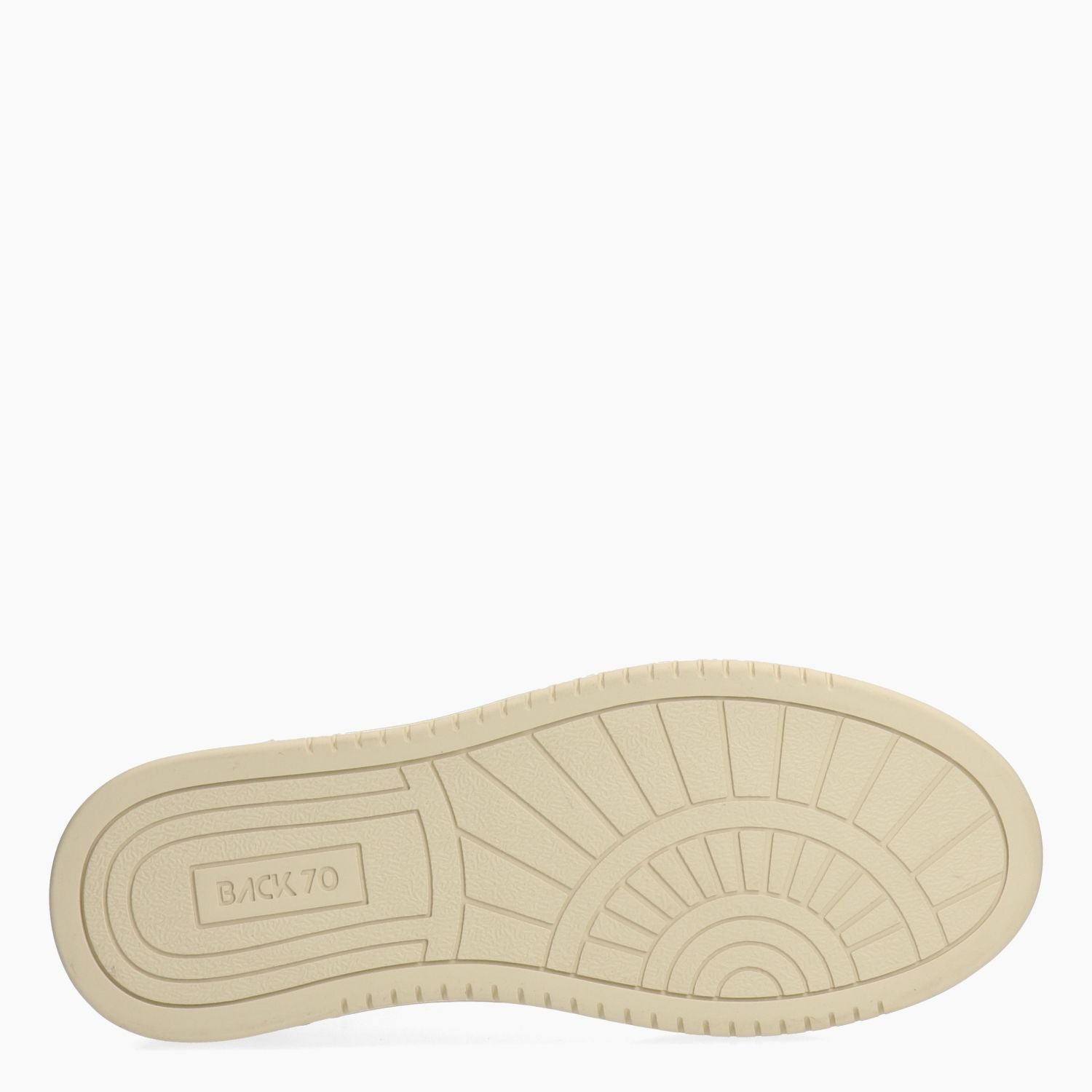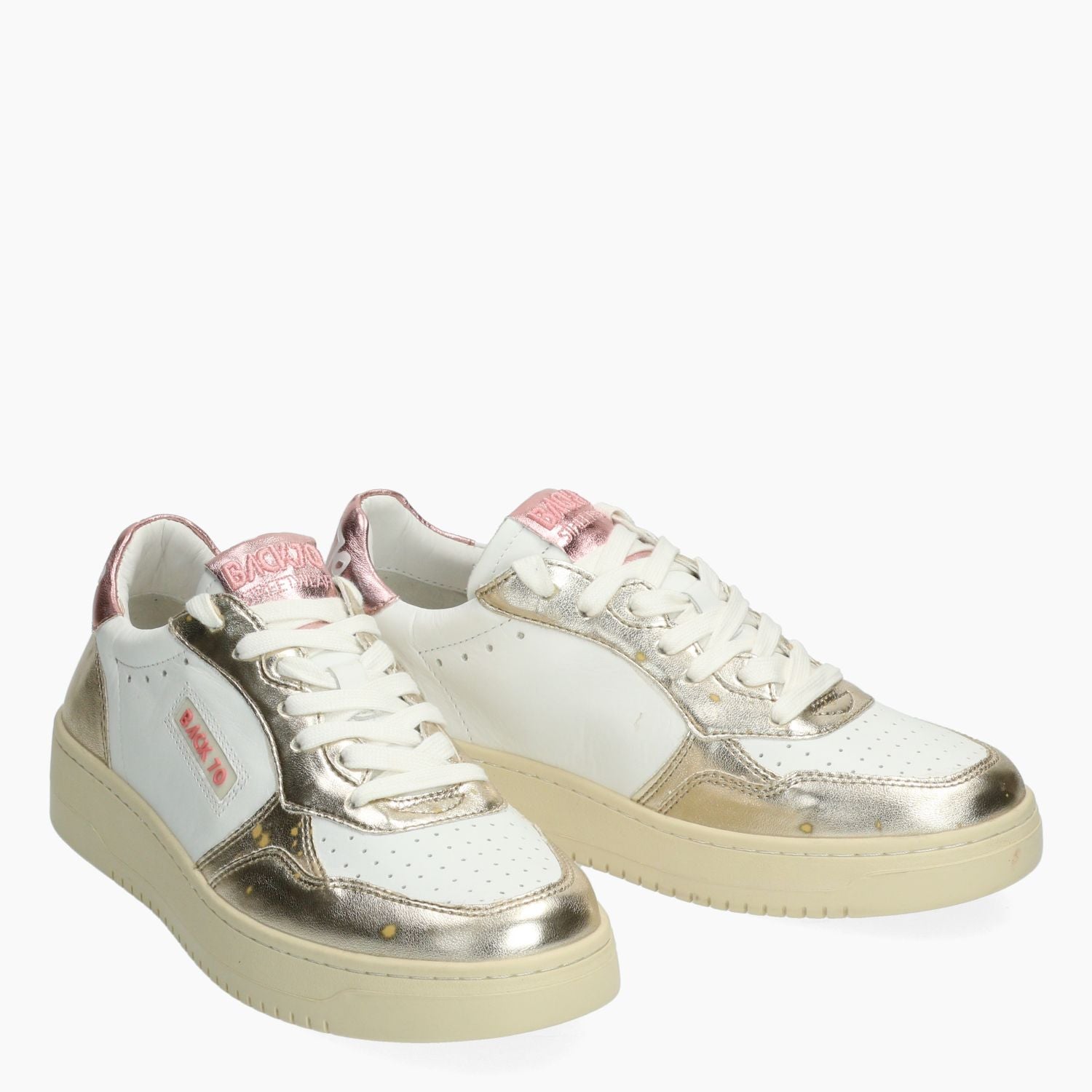Snealkers in pelle in colore bianco con riporti in pelle laminata oro e rosa. Logo laterale in rilievo. Interno in tessuto e pelle con sottopiede estraibile. Suola in gomma. Collezione Back 70 donna.