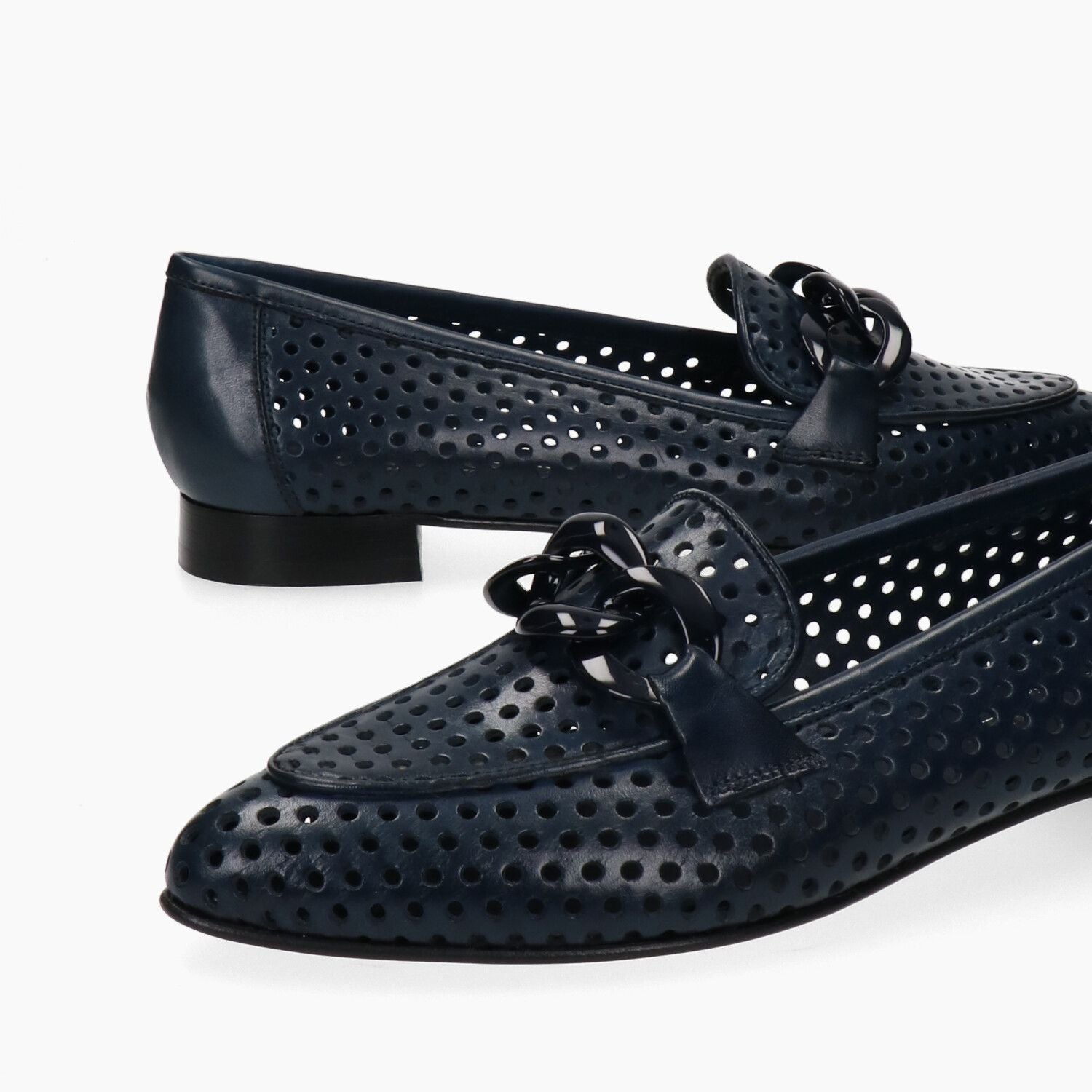 Mocassini in pelle traforata blu con morsetto, fondo cuoio.