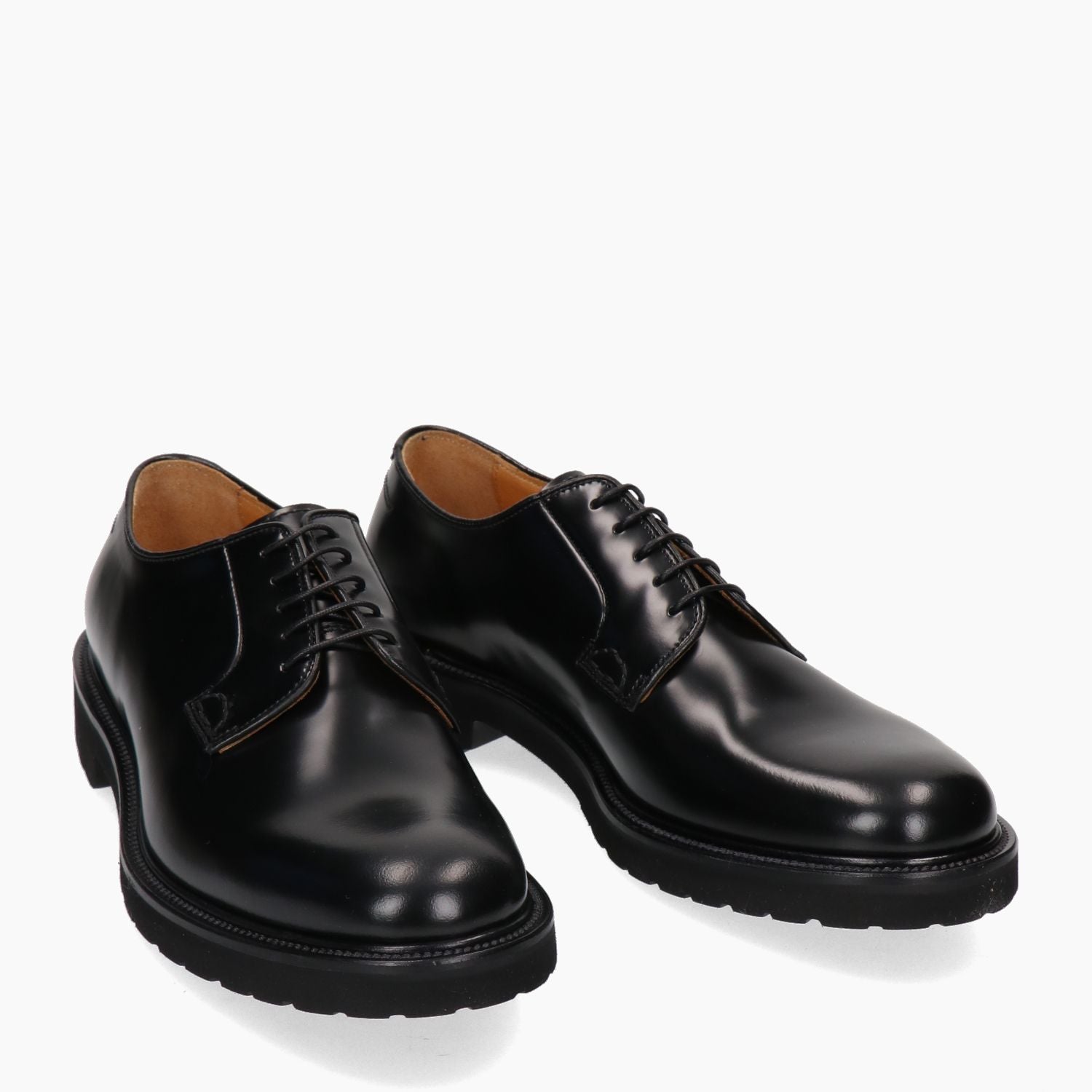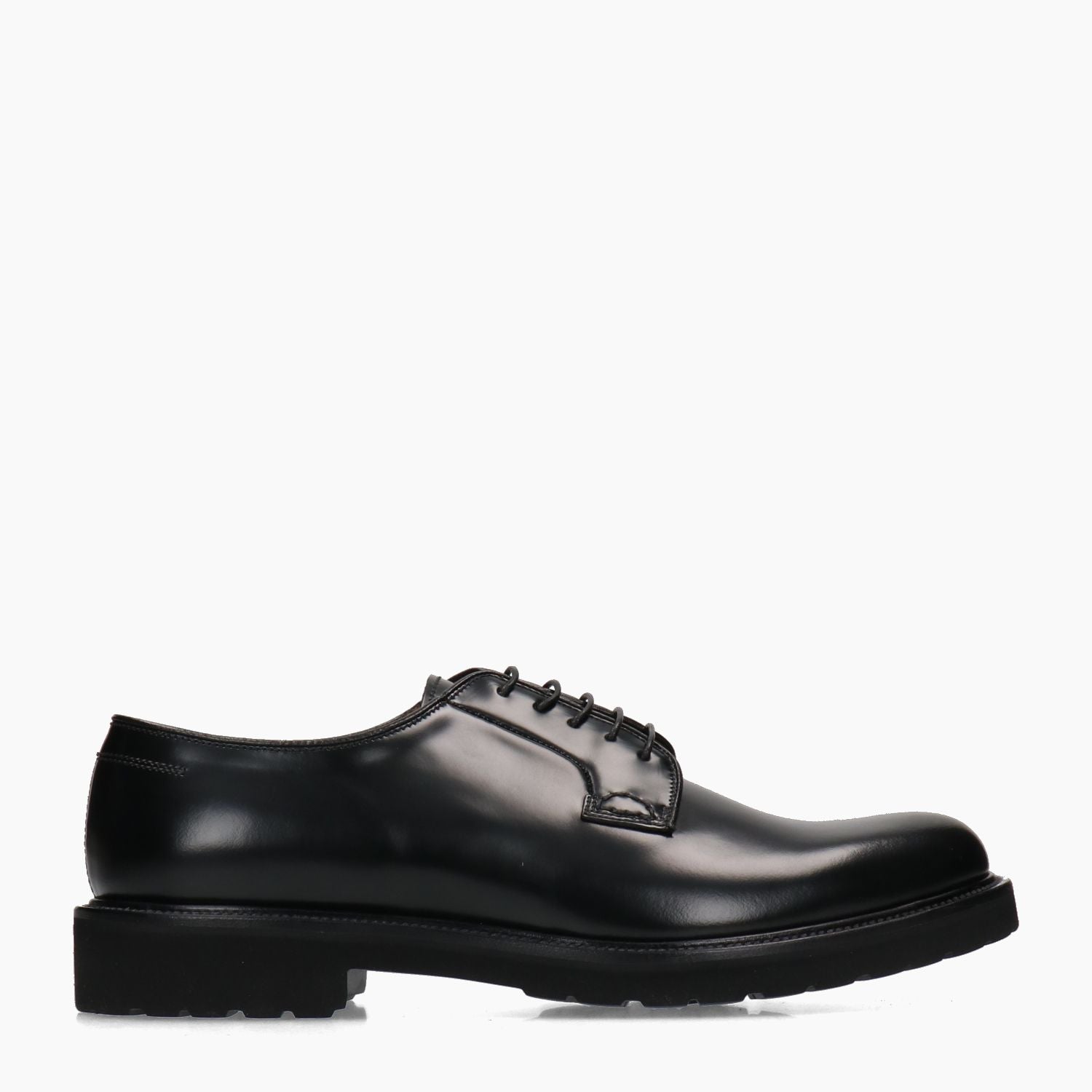 Derby in pelle in colore nero. Chiusura con lacci in colore nero. Interno in pelle in colore nero. Soletta interna non rimovibile. Suola esterna in gomma in colore nero. Tacco in gomma di 3 cm. Collezione Mille 885 uomo Autunno/Inverno.