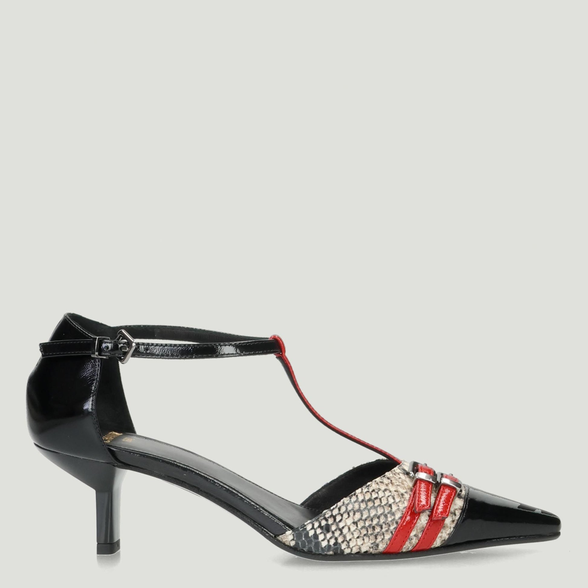 Charleston in pelle stampata rettile colore roccia con puntale e tallone in vernice nera. Cinturini in vernice rossa. Interno in pelle. Suola in cuoio e gomma con tacco di 5 cm. Collezione Chantal autunno/inverno.