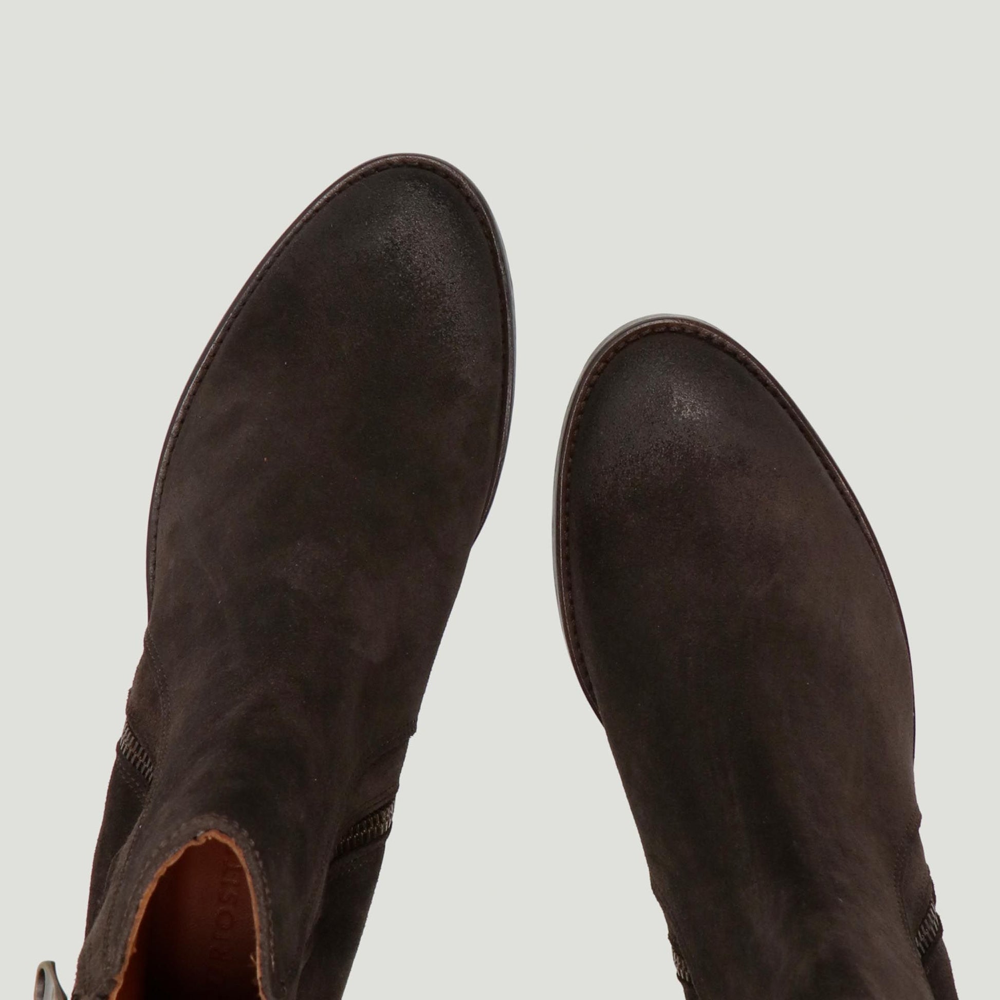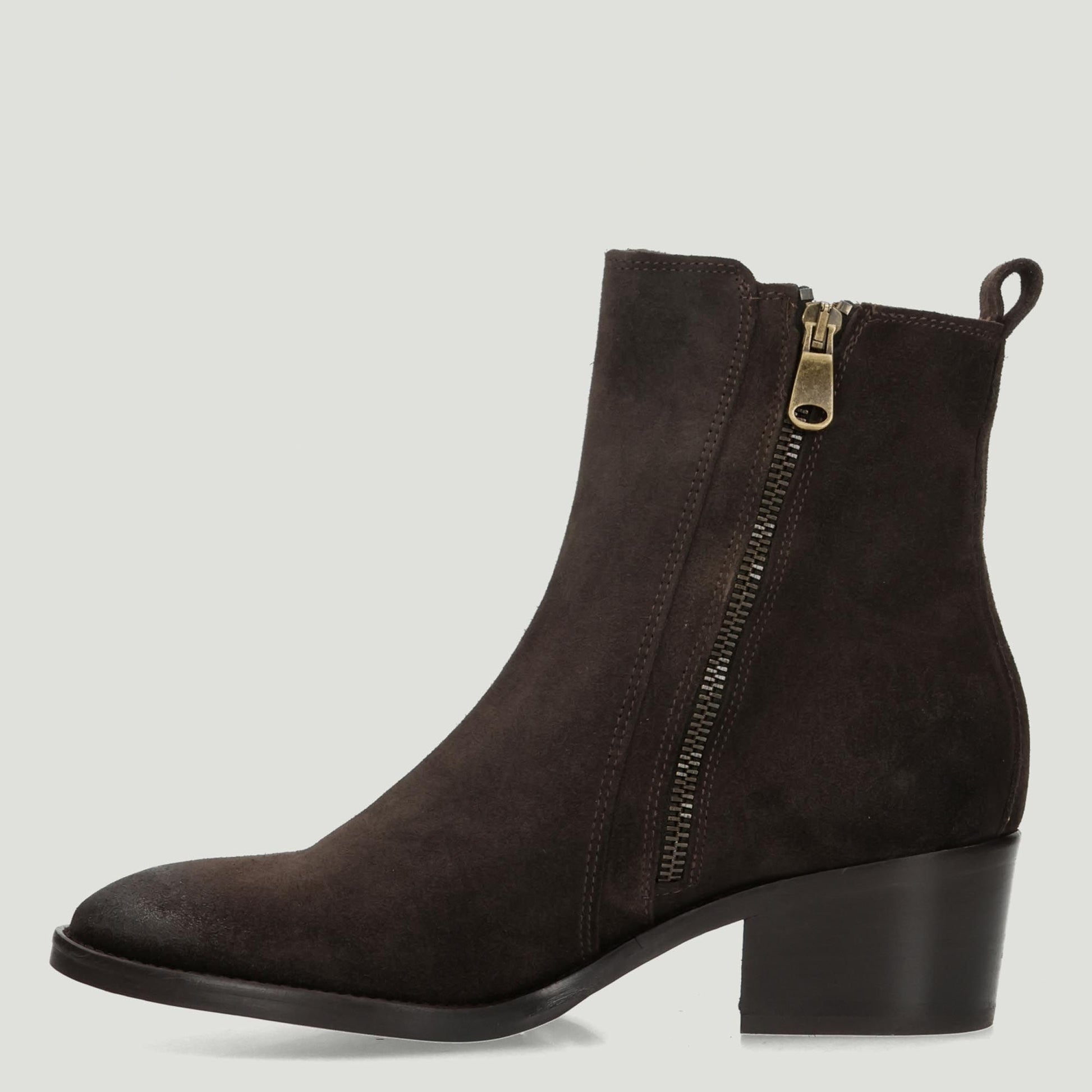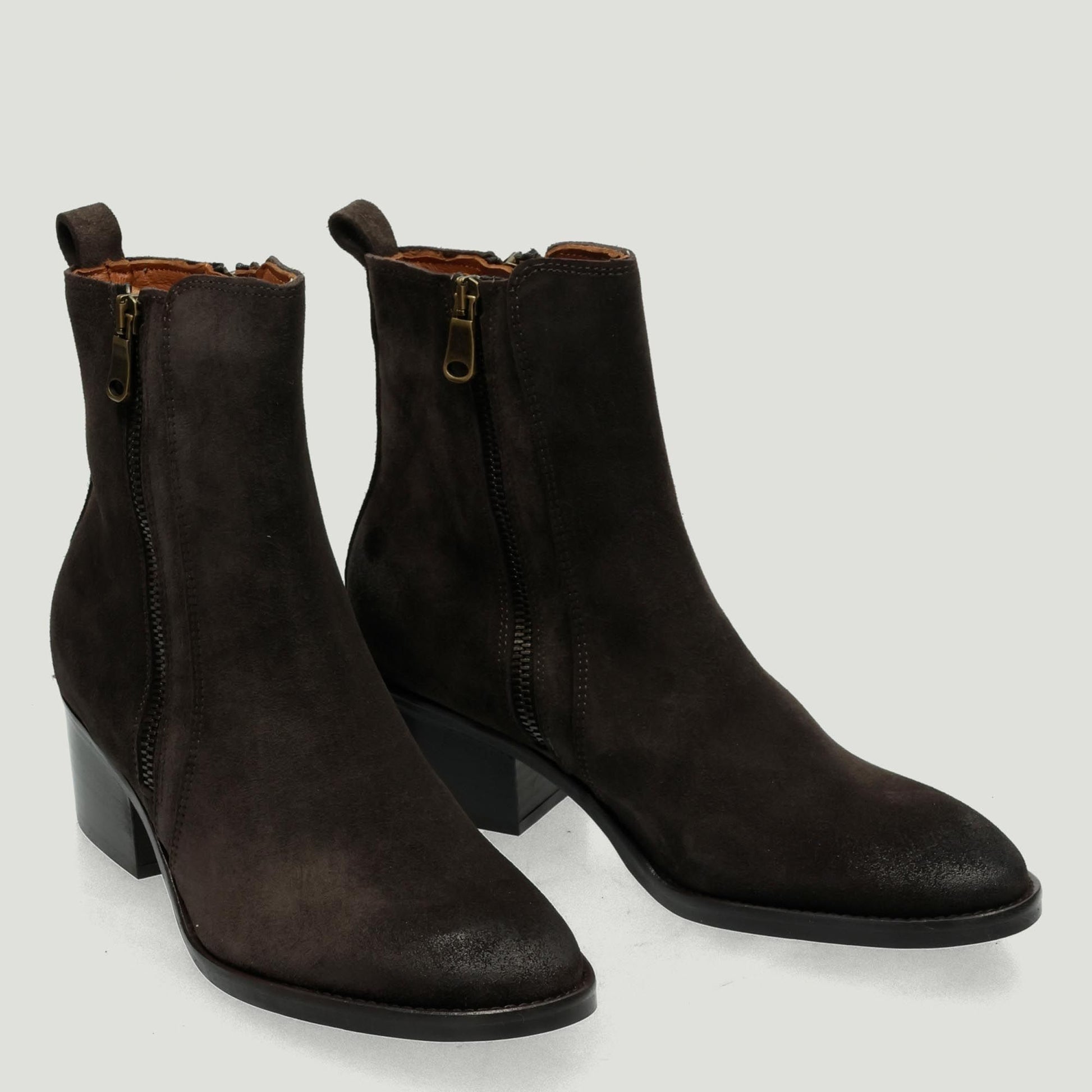 Stivaletto in pelle scamosciata testa di moro con doppie zip laterali. Interno in pelle. Soletta interna non rimovibile. Suola in cuoio e gomma con tacco di 4 cm. Collezione Curiosite' donna.