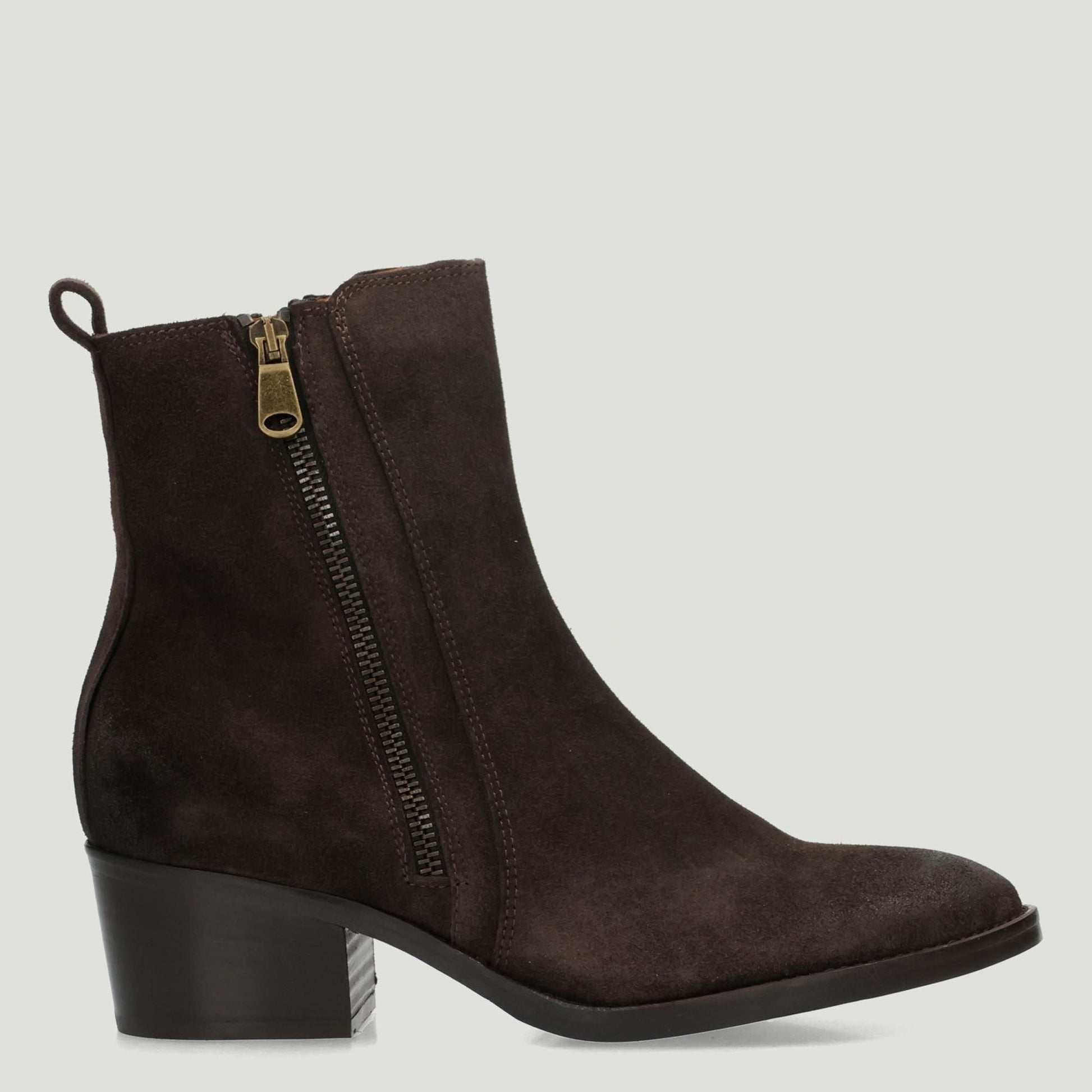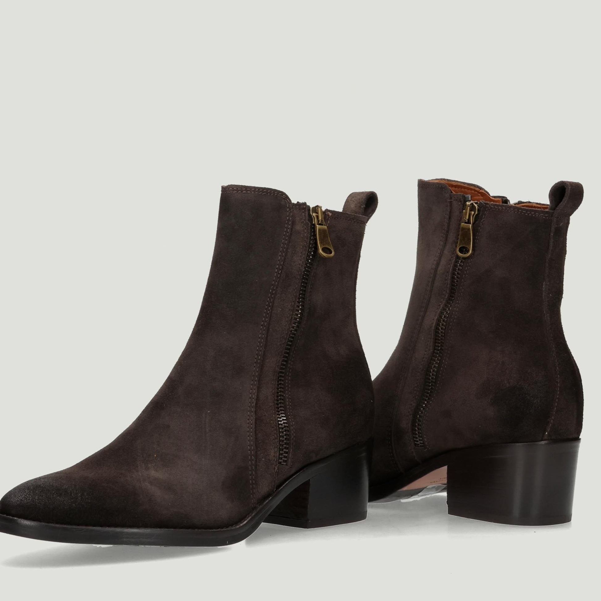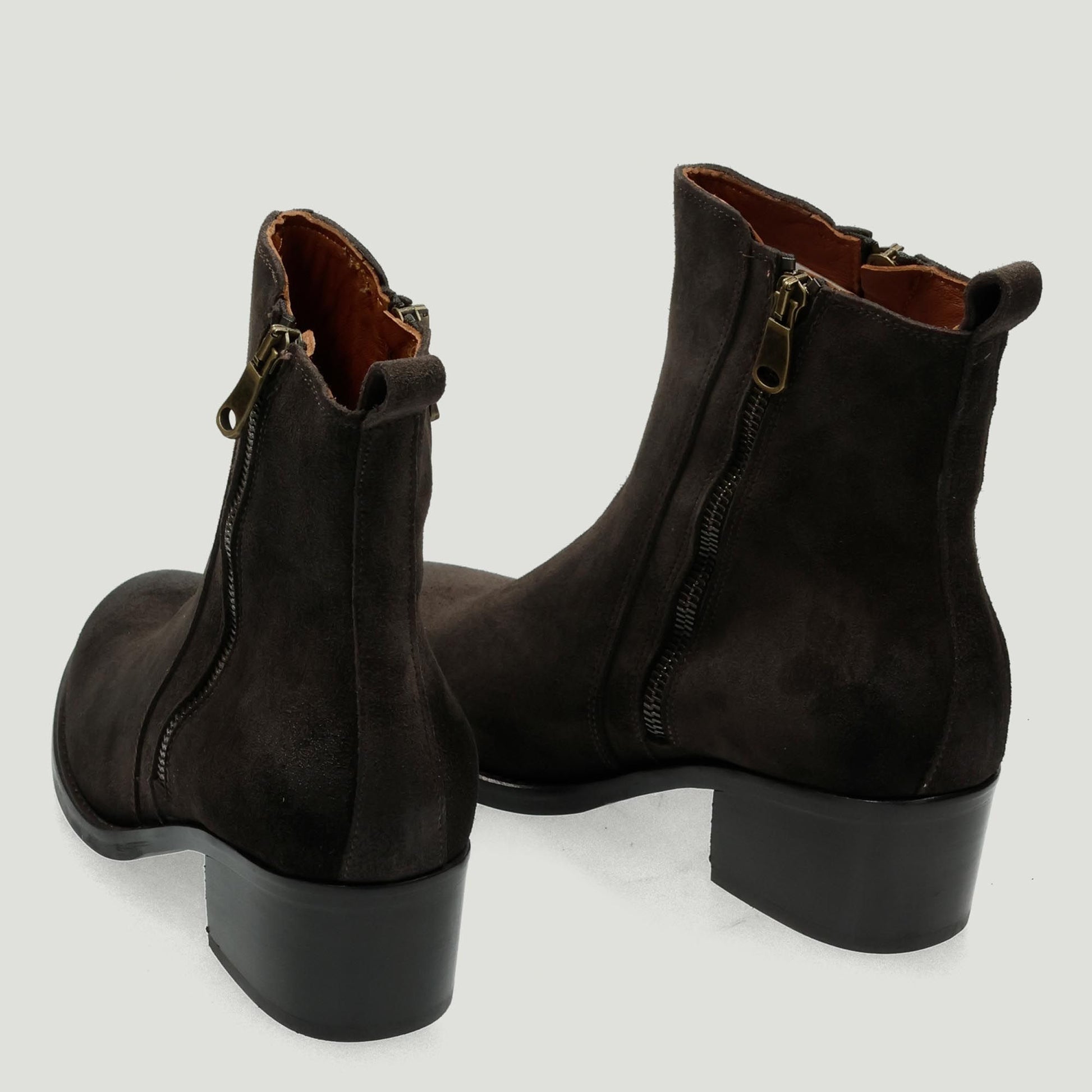 Stivaletto in pelle scamosciata testa di moro con doppie zip laterali. Interno in pelle. Soletta interna non rimovibile. Suola in cuoio e gomma con tacco di 4 cm. Collezione Curiosite' donna.