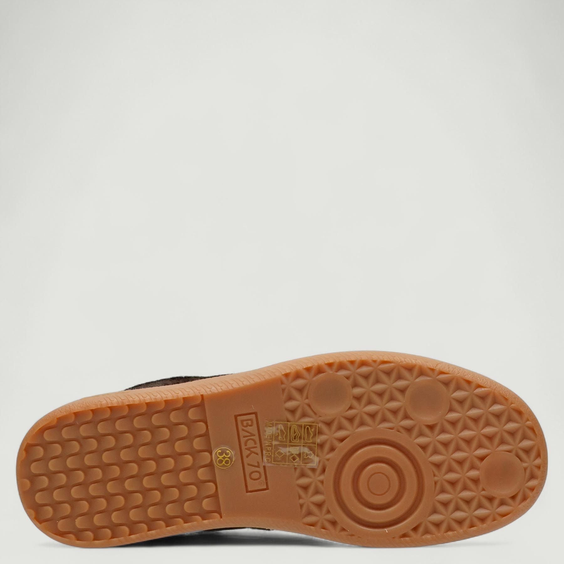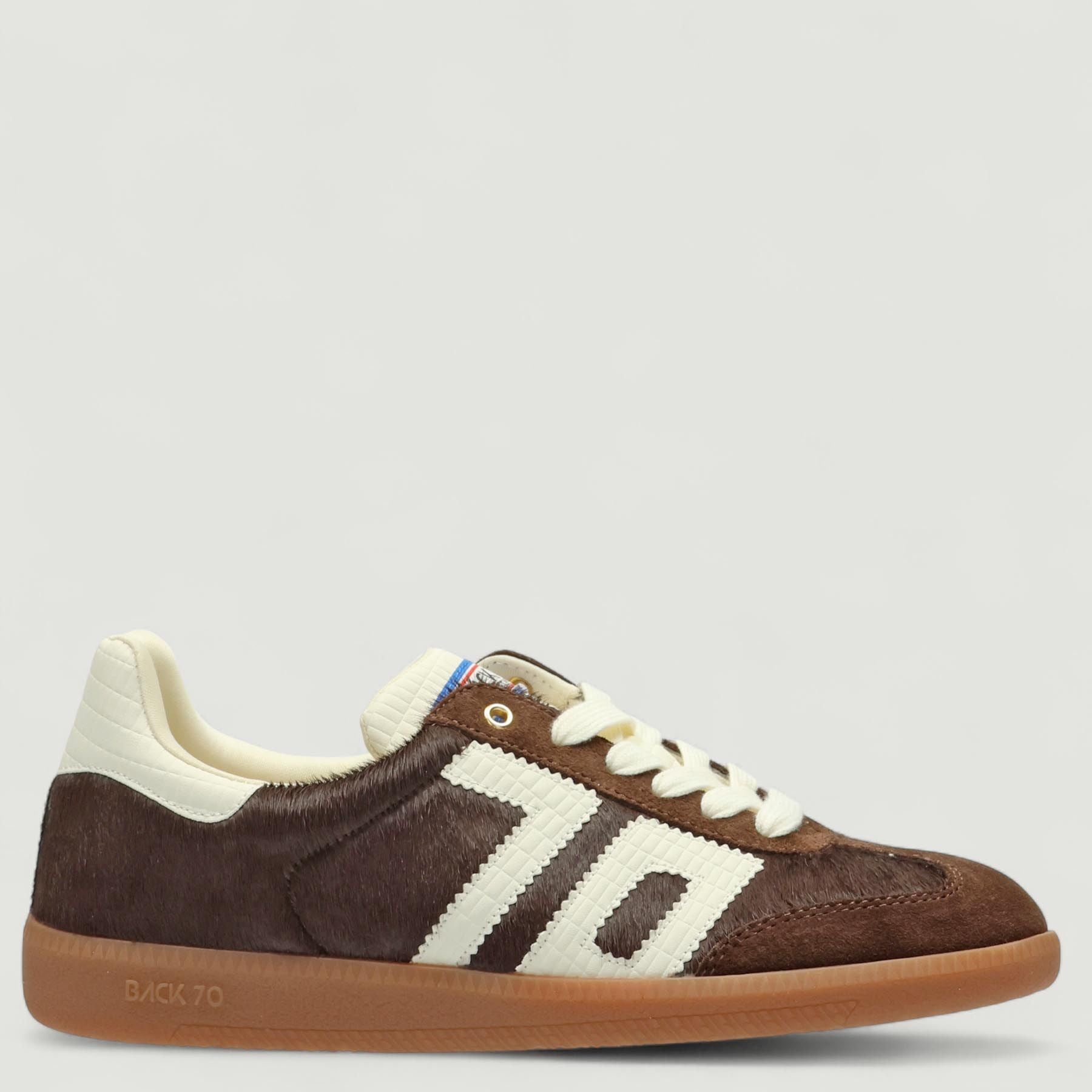 Snealkers in cavallino color caffe con riporti in camoscio in tinta. Logo laterale in pelle avorio. Interno in tessuto con sottopiede estraibile. Suola in gomma color mastice. Collezione Back 70 donna autunno/inverno.