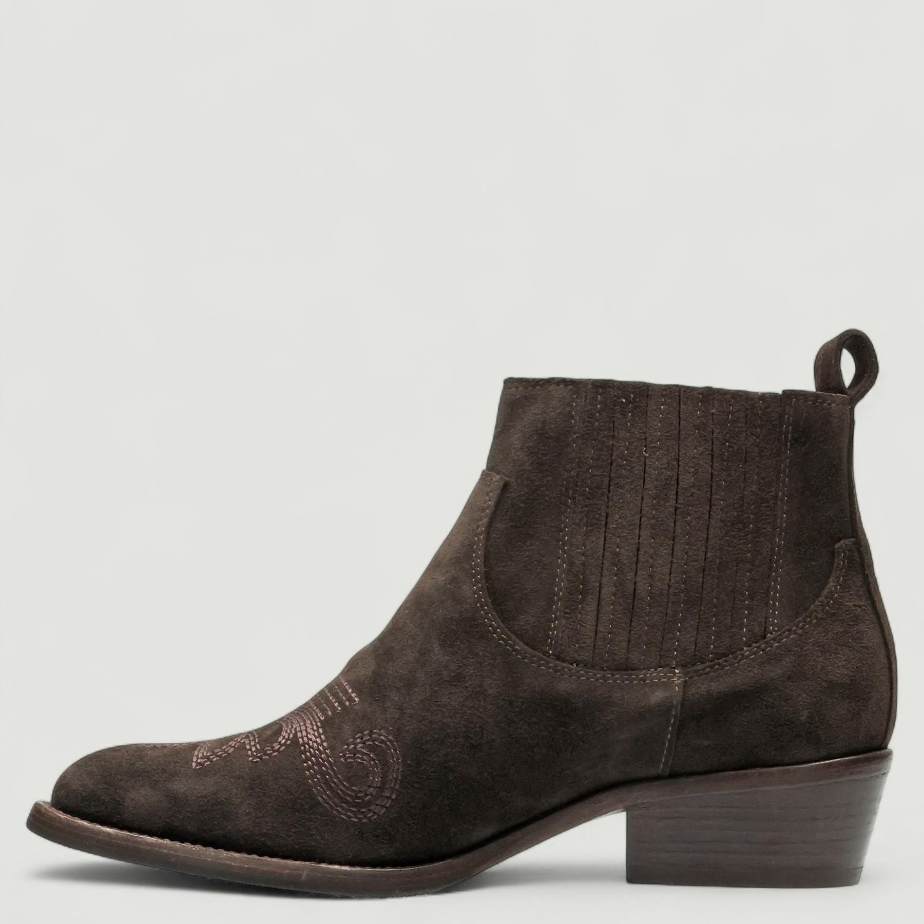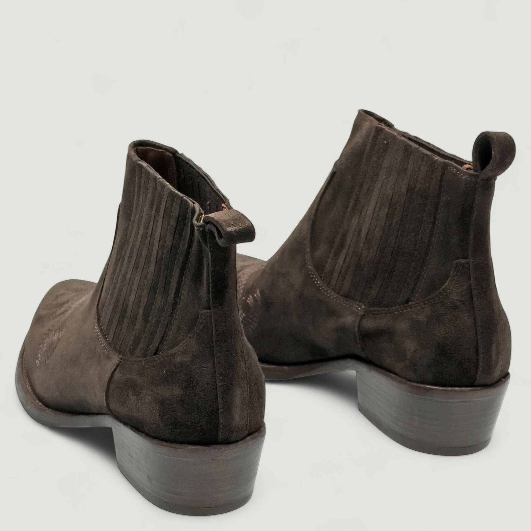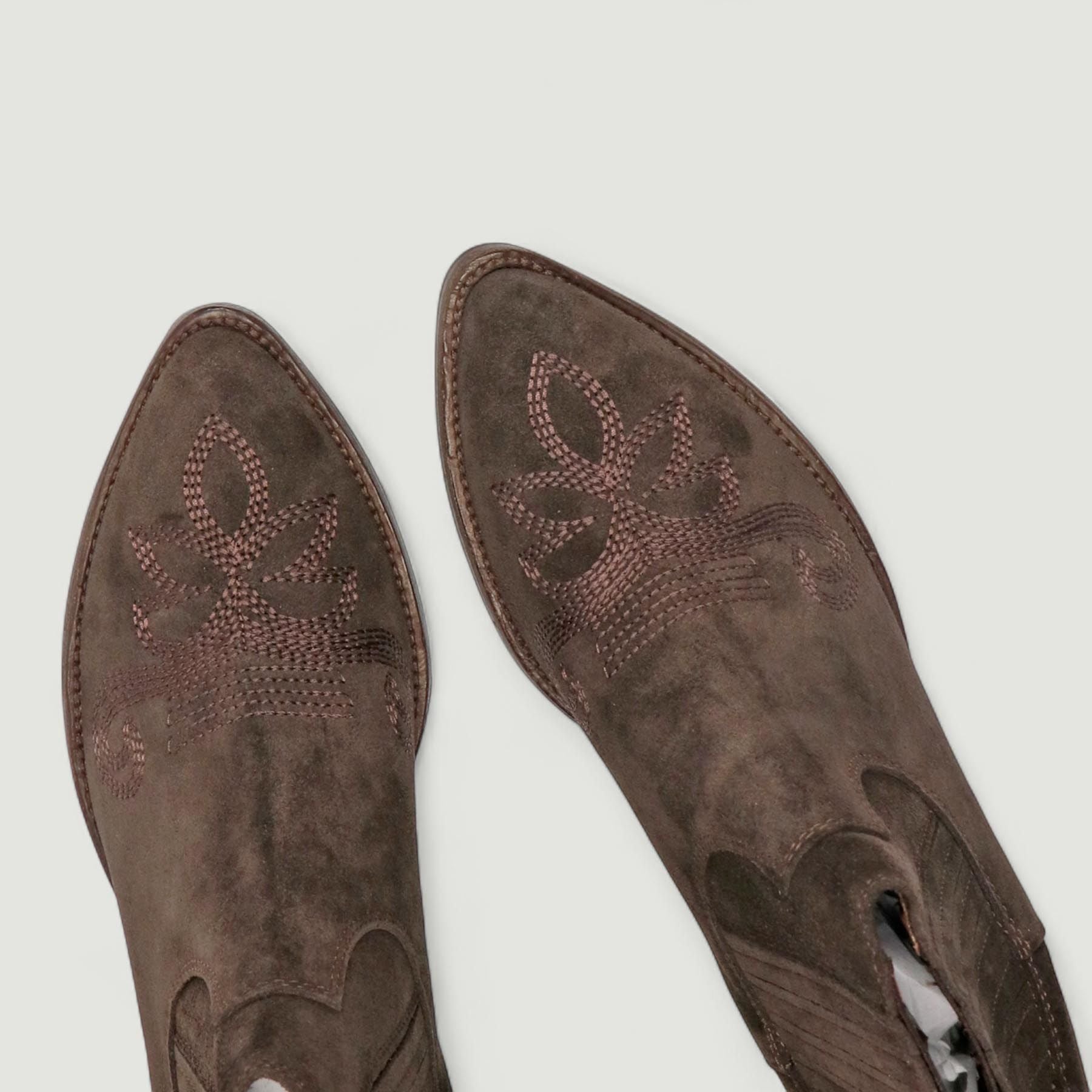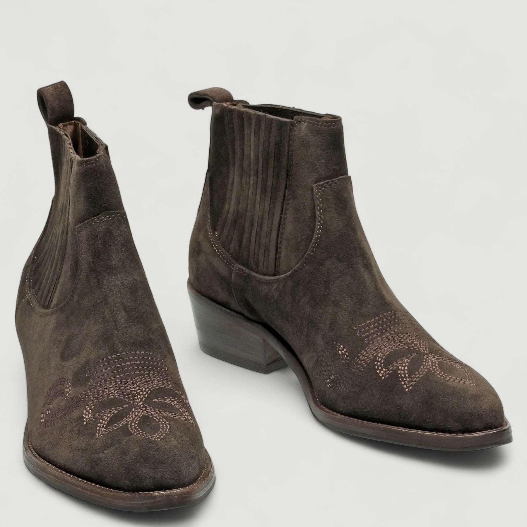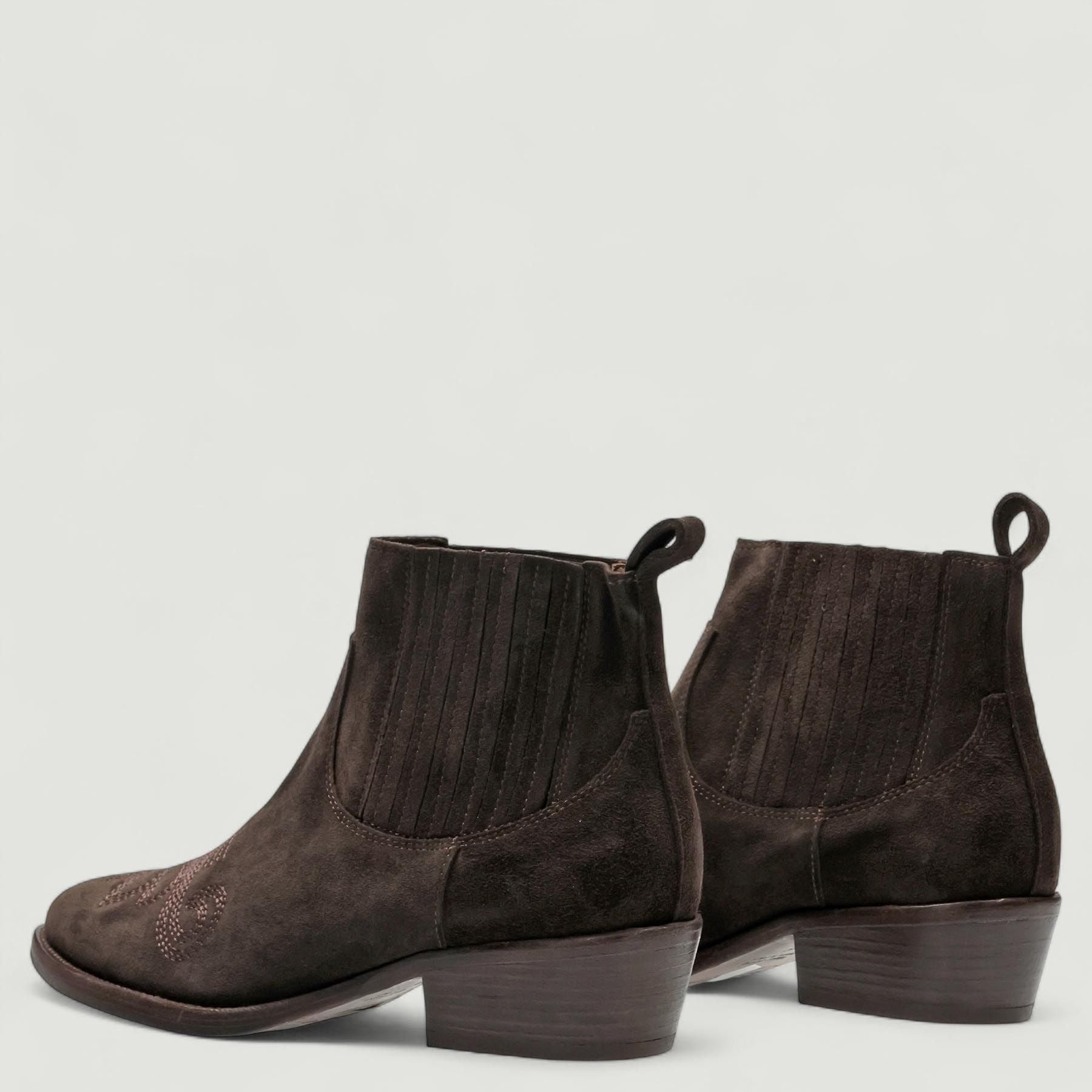 Stivaletti in pelle scamosciata testa di moro con elastici laterali ricoperti. Interno in pelle con sottopiede non estraibile. Suola in gomma di 3,5 cm. Collezione Duccio Del Duca donna Autunno/Inverno.