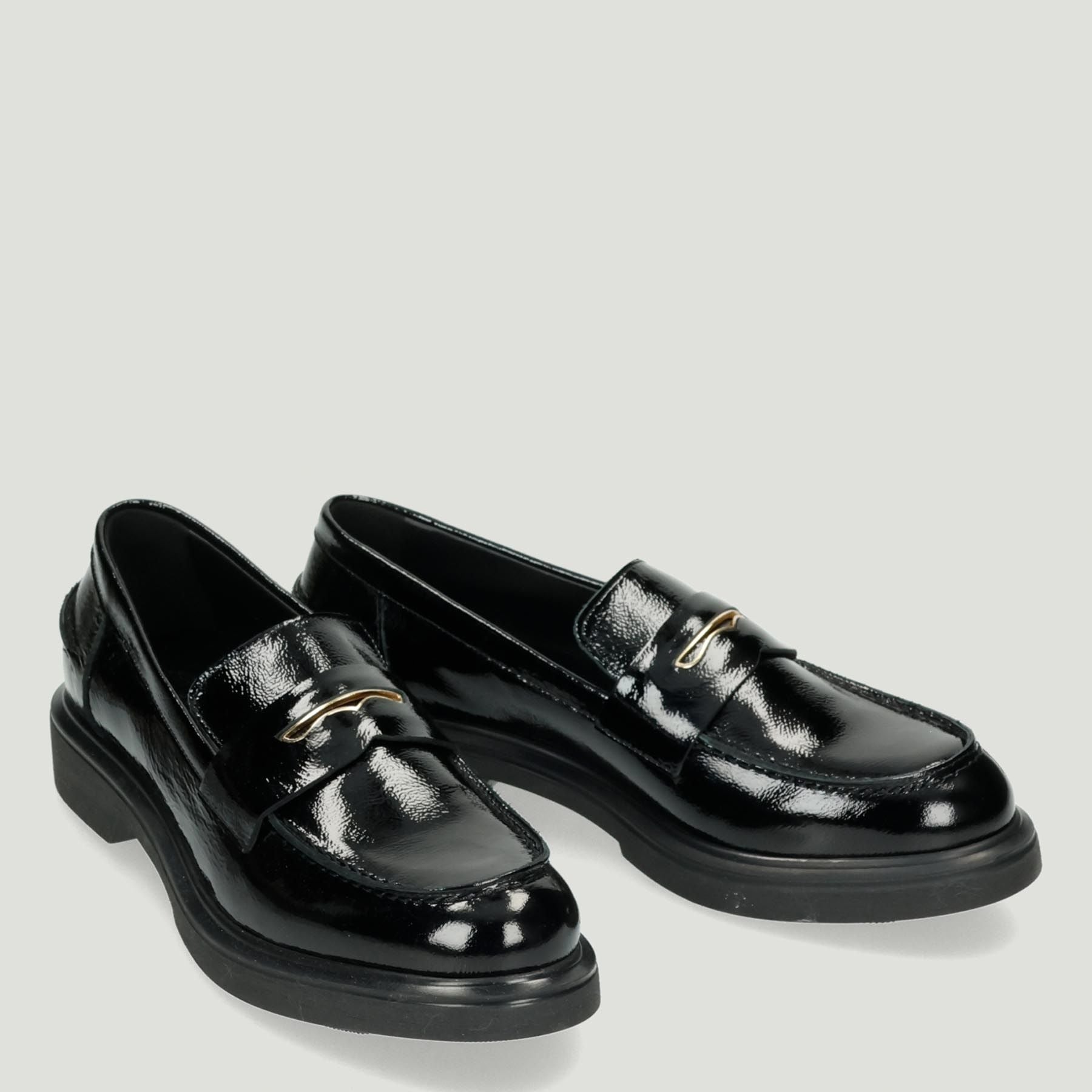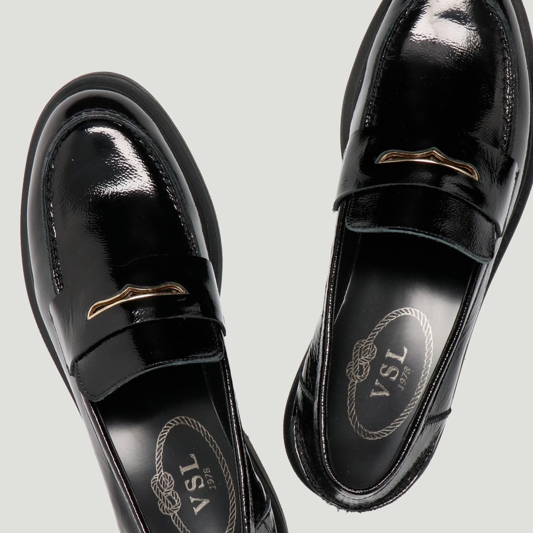 Mocassino in pelle verniciata nera. Interno in pelle. Suola in gomma con tacco di 3 cm. Collezione VSL1978 donna autunno/inverno.