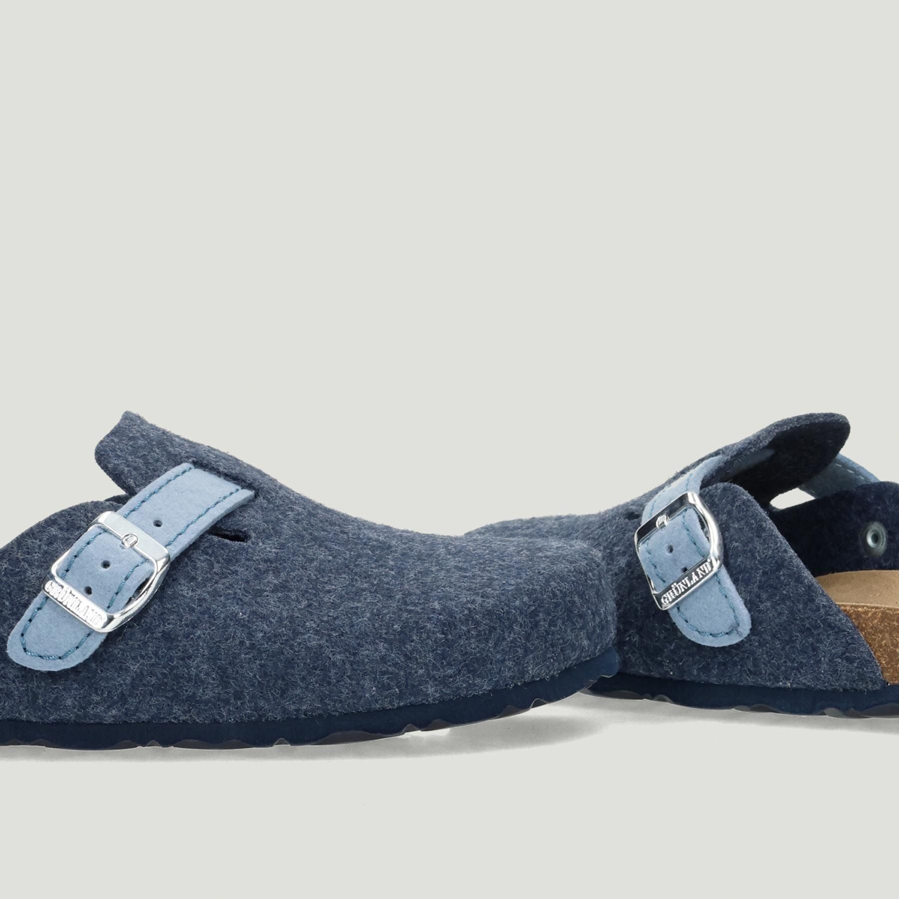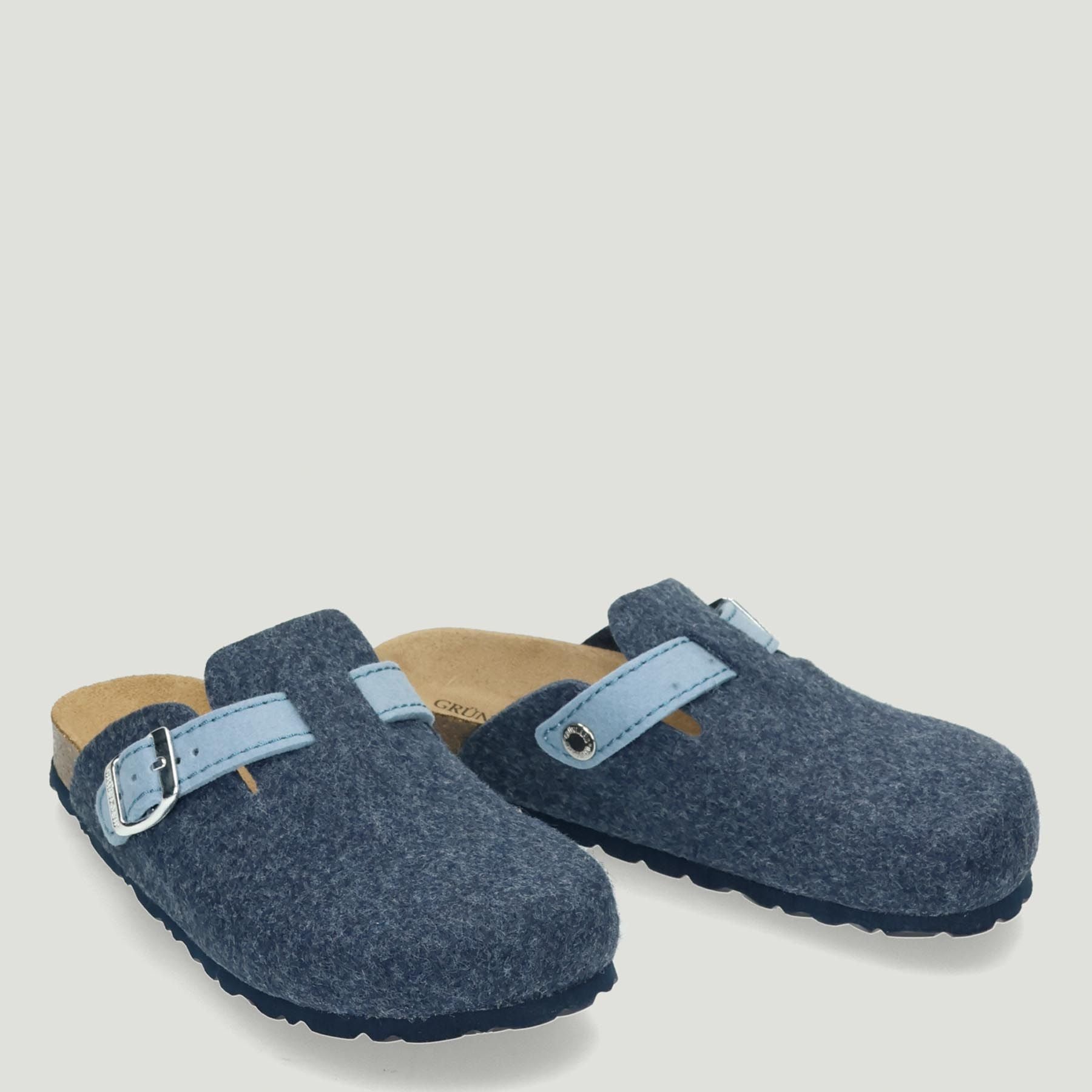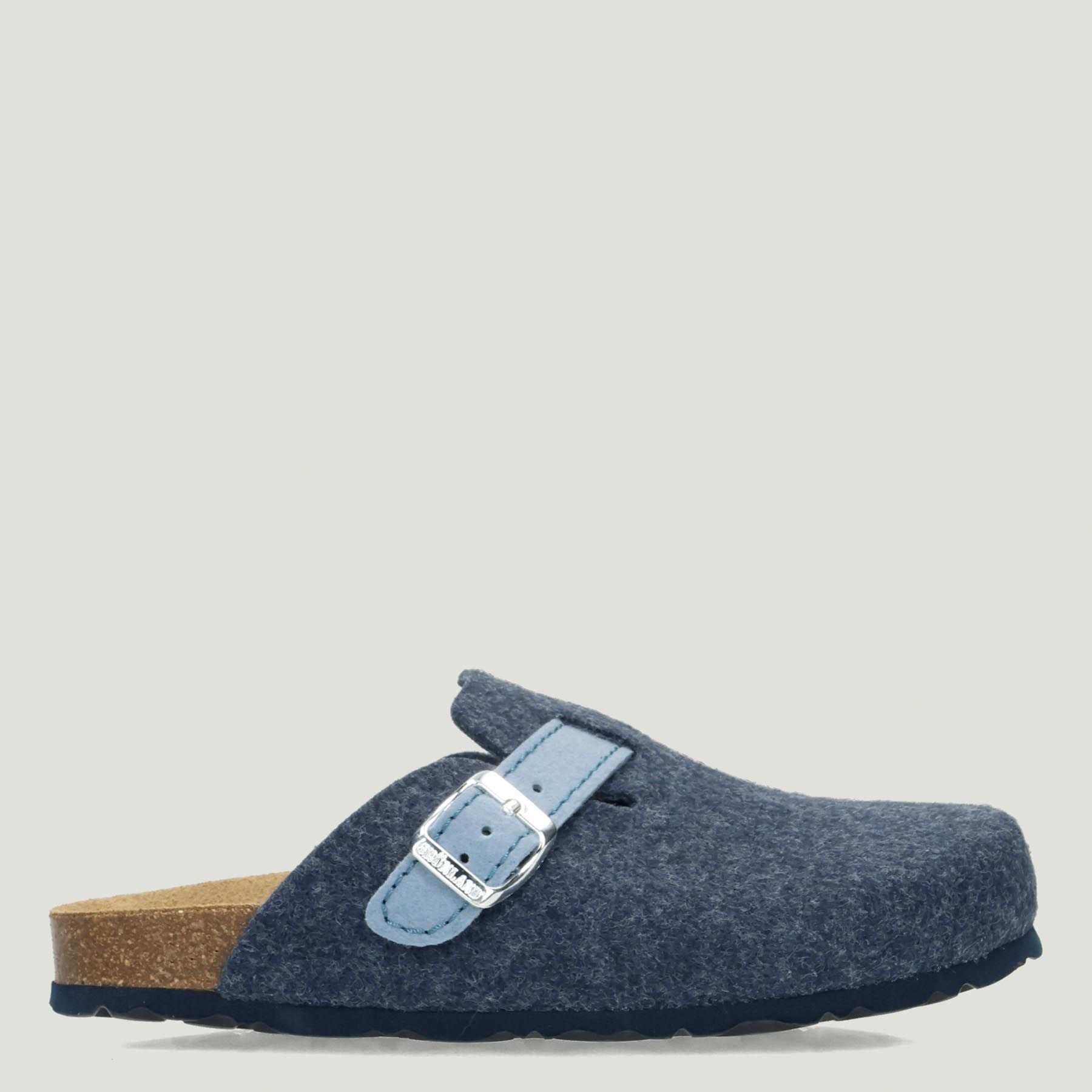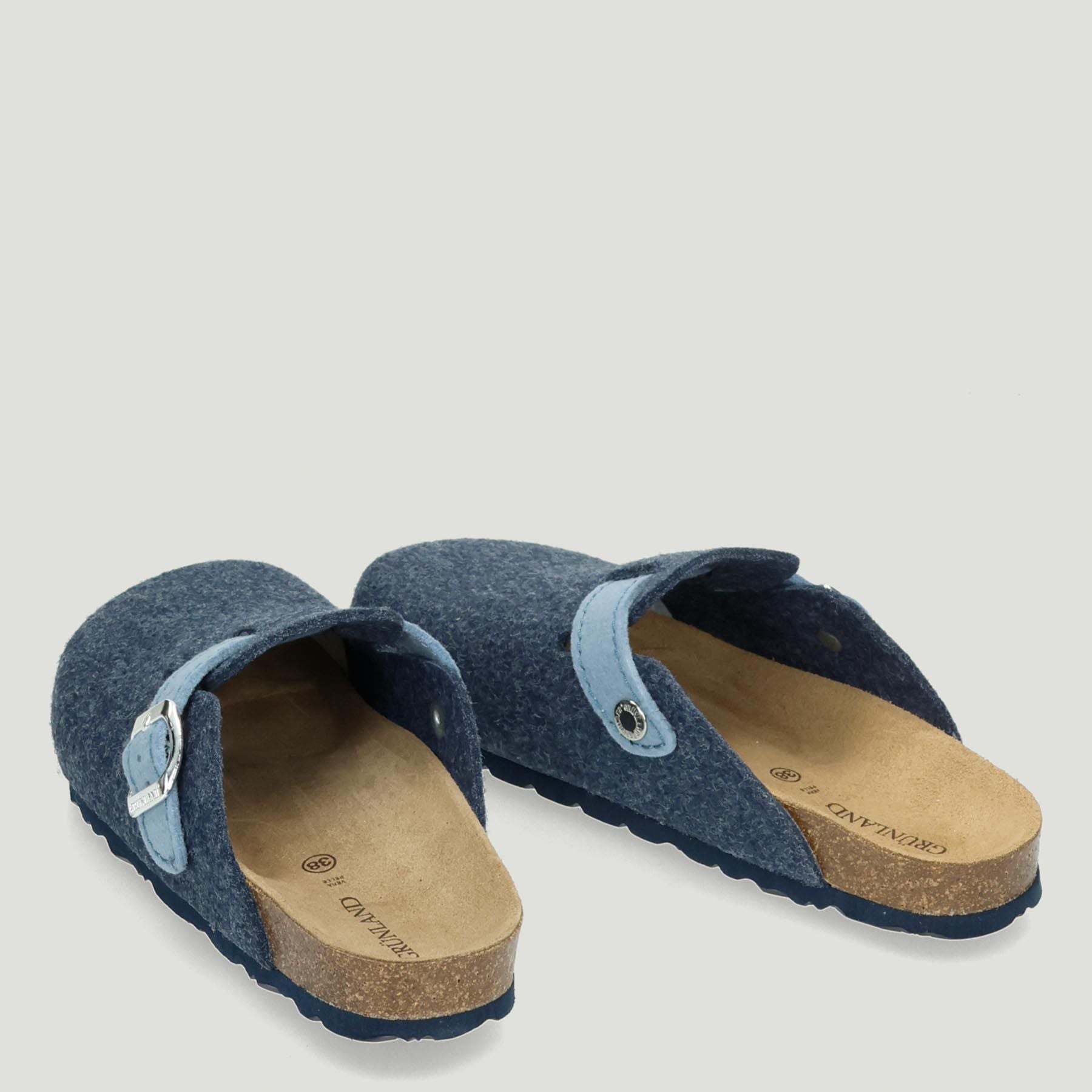 Ciabatta Grunland in lana cotta in colore blu-indaco con fascetta regolabile celeste. Sottopiede anatomico in pelle scamosciata. Suola in gomma. Collezione Grunland donna Autunno/Inverno.