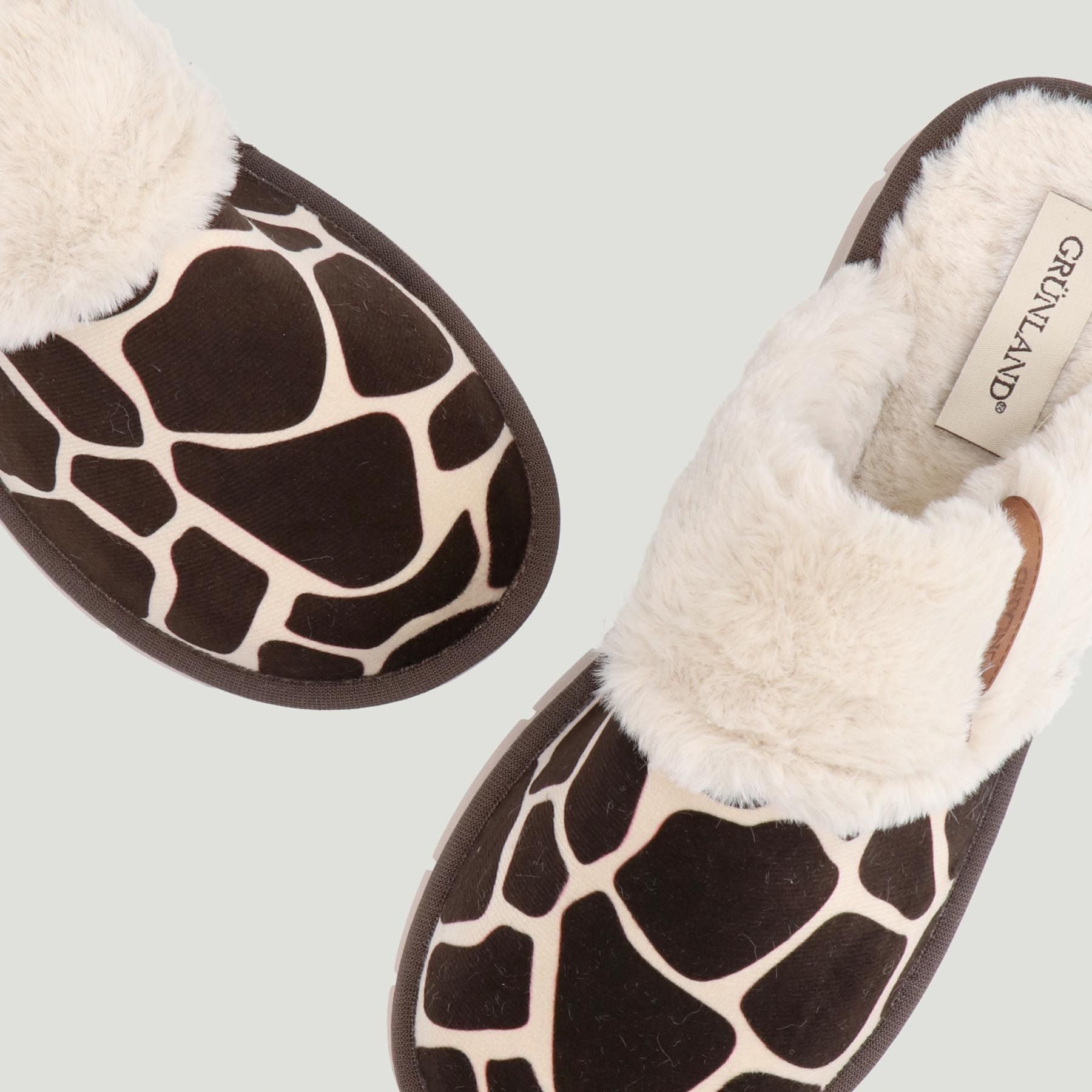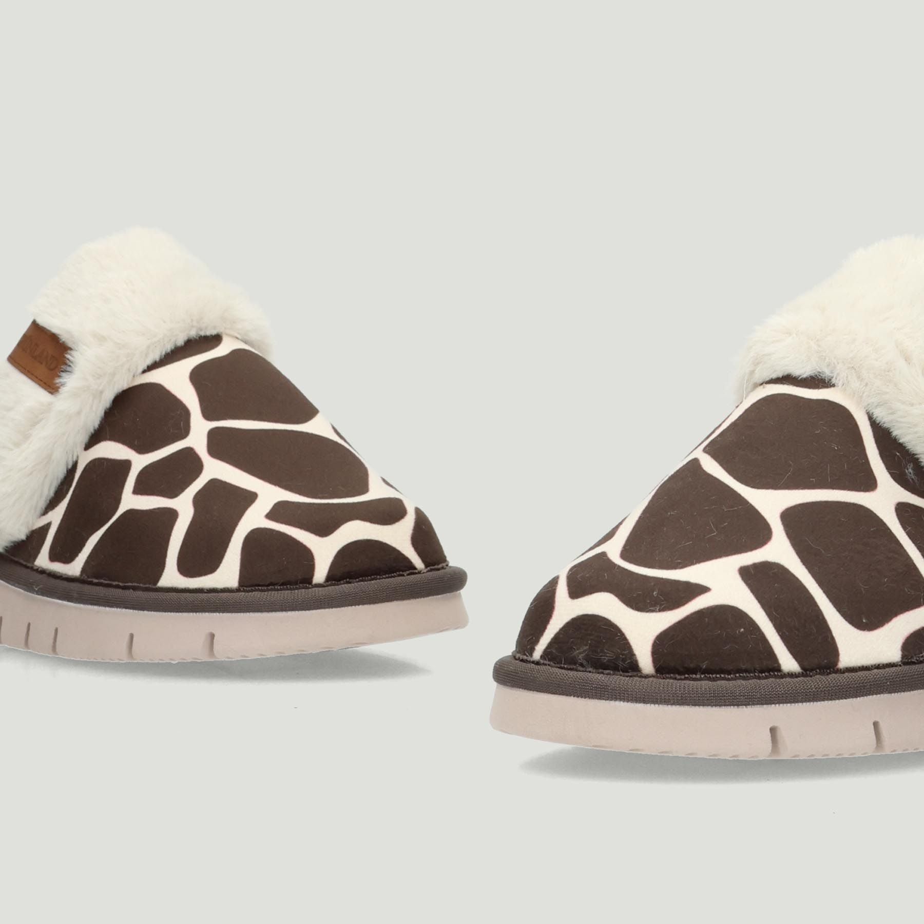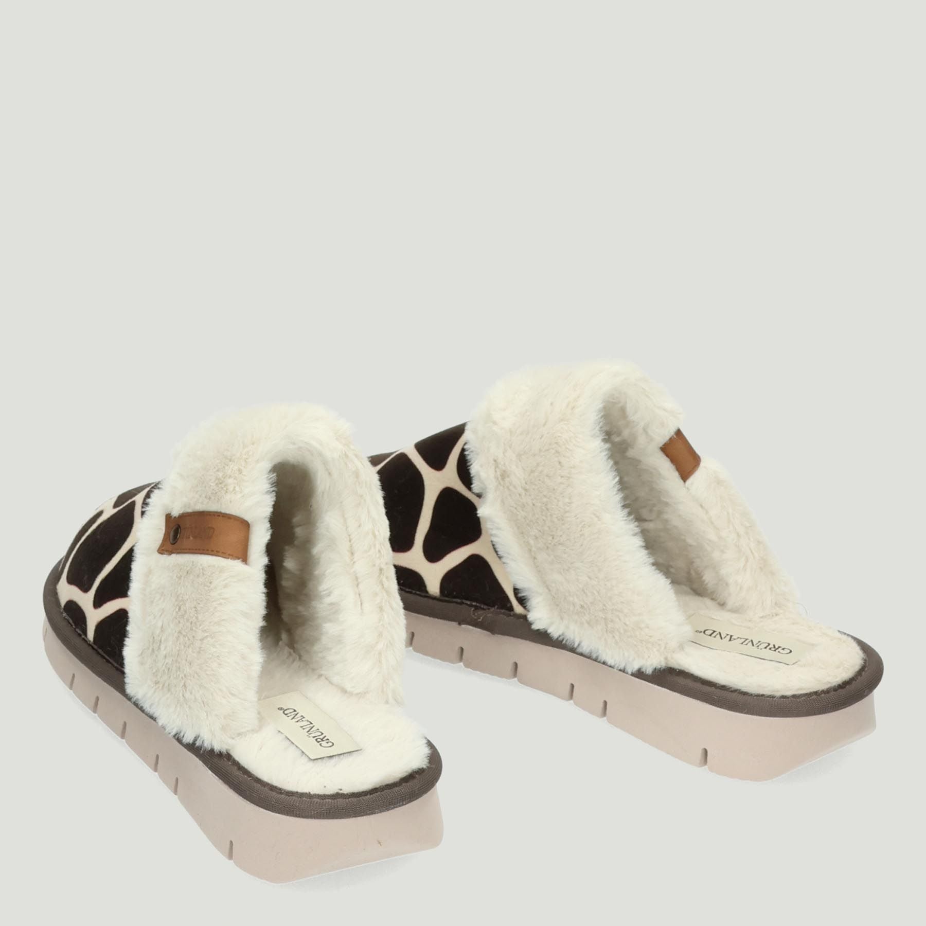 Sabot Grunland con tomaia in tessuto maculato marrone. Bordo di ecopelo con logo. Interno in ecopelo. Suola in gomma di 3 cm. Collezione Grunland donna Autunno/Inverno.