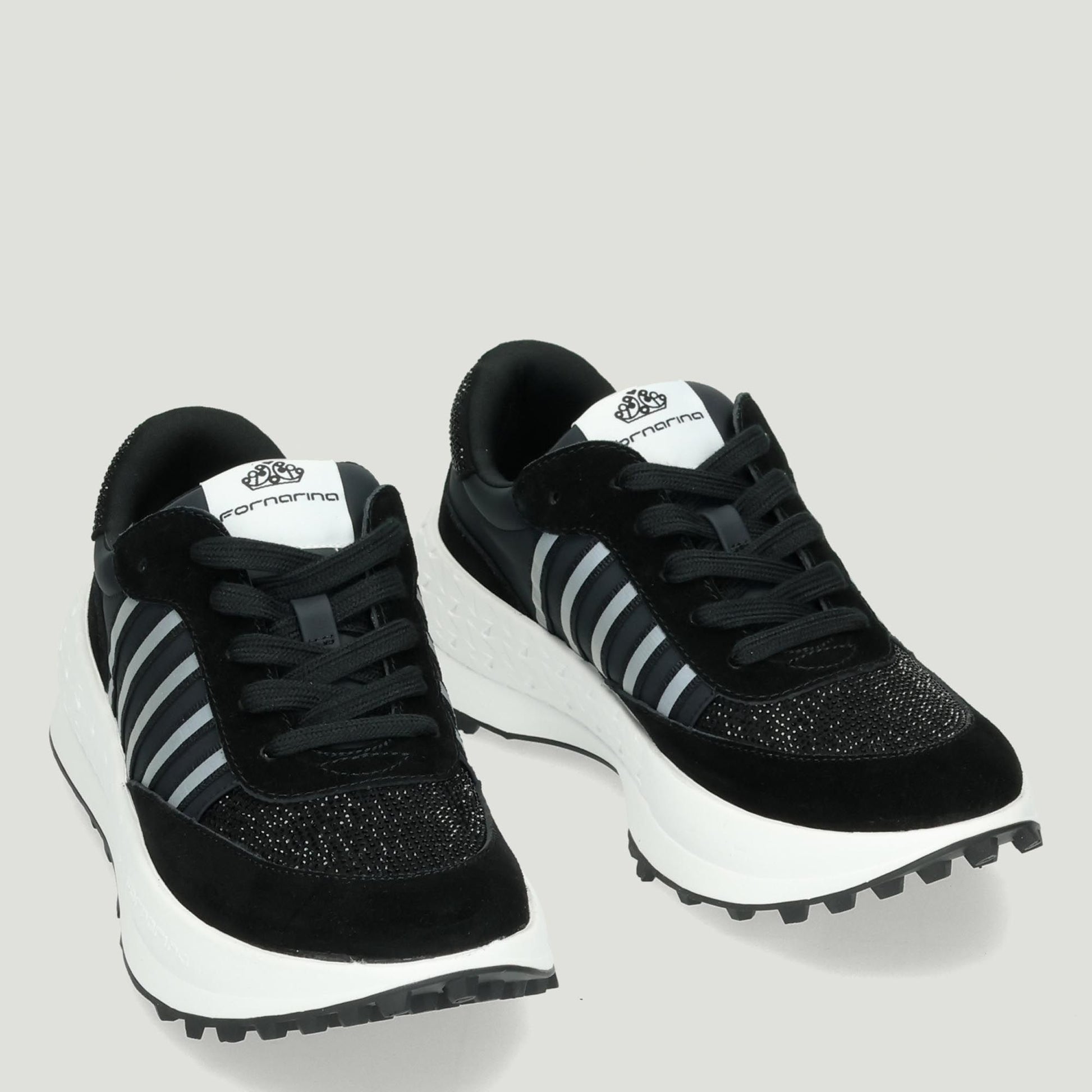 Sneakers in pelle scamosciata e nylon nero. Vaschetta e tallone con strass neri. Interno in tessuto con sottopiede estraibile. Stripe con tessuto catarinfrangente. Suola in gomma con zeppa di 5 cm. Collezione Fornarina donna.