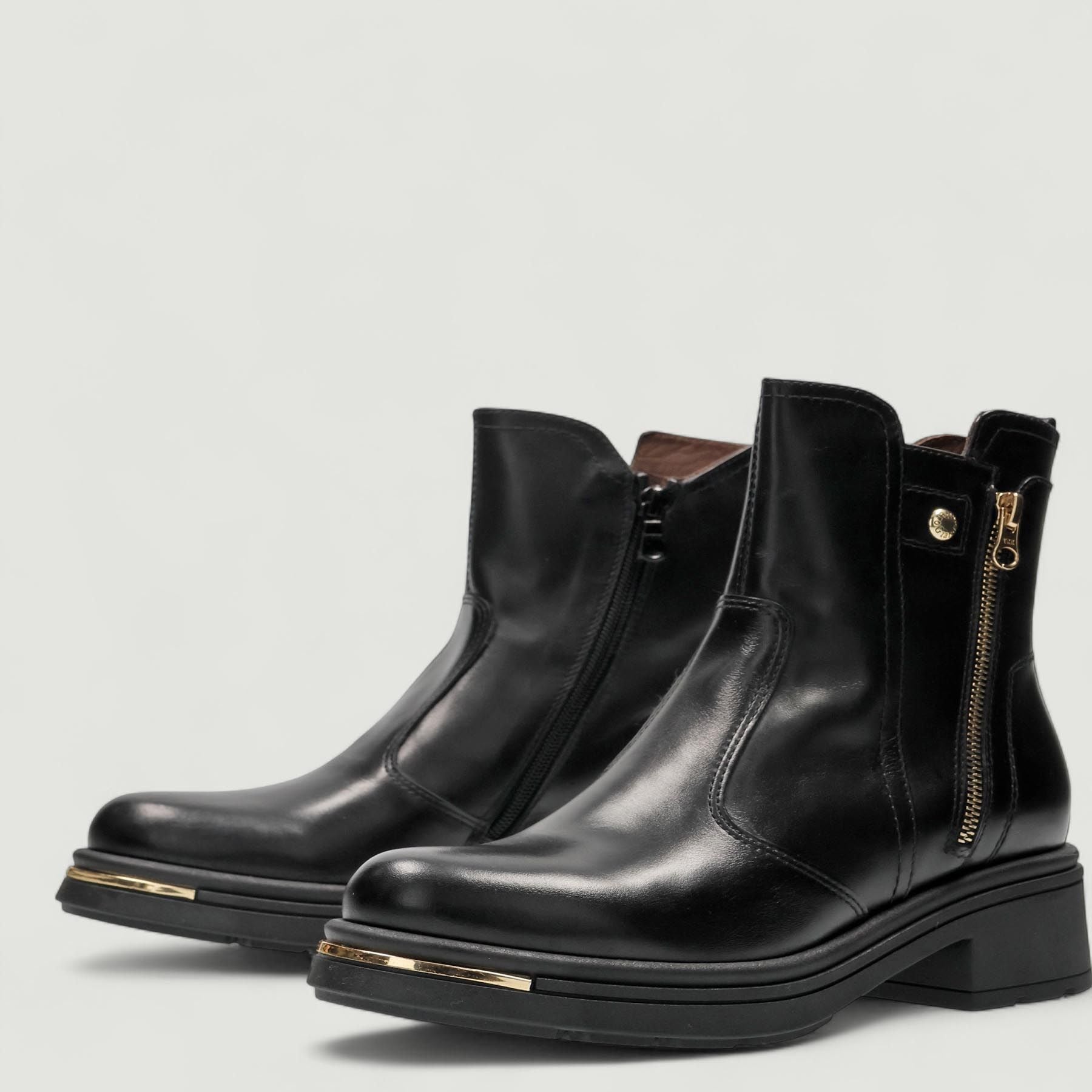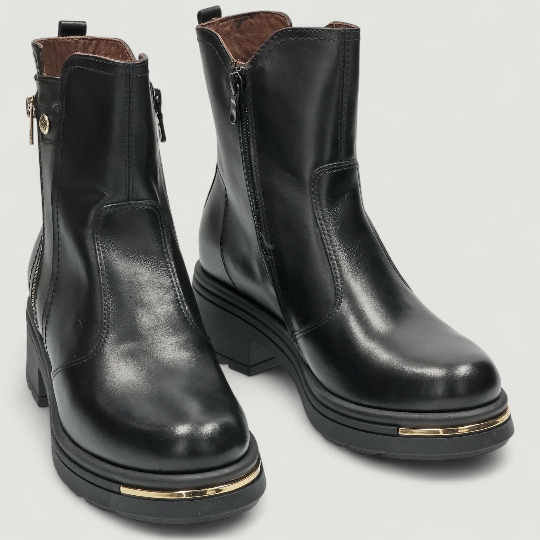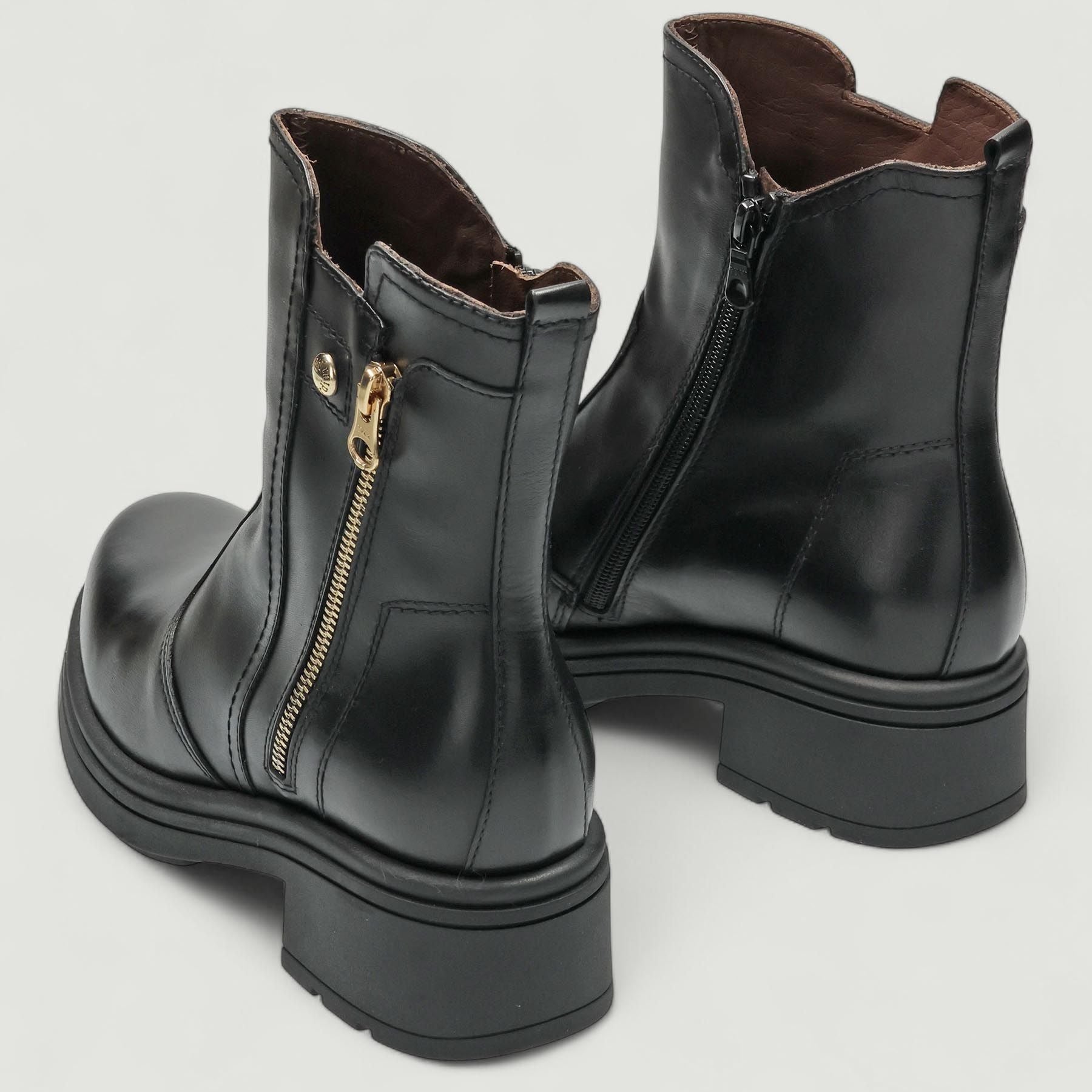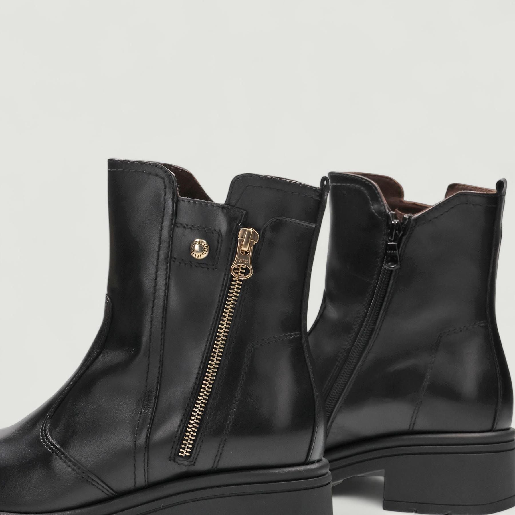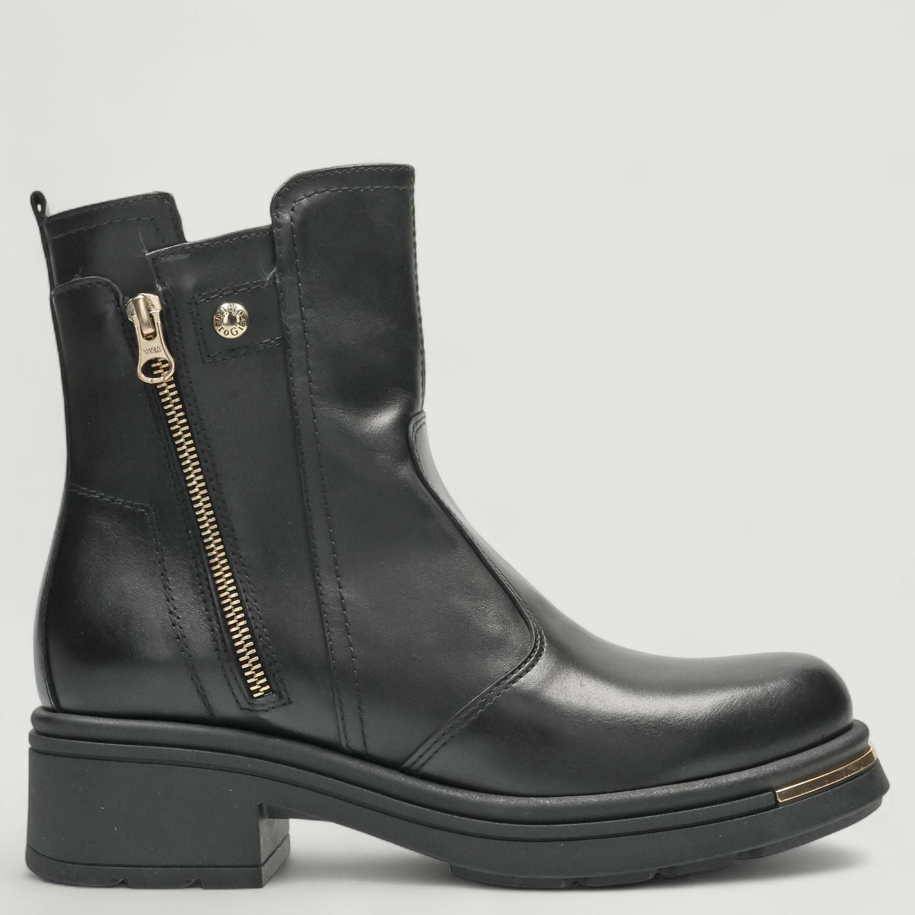 Stivaletto in pelle nera. Chiusura con zip laterale. Zip laterale finta dorata. Interno in pelle con sottopiede estraibile in memory. Suola in gomma con tacco di 3 cm. Inserto dorato nella punta. Collezione Nero Giardini donna autunno/inverno.