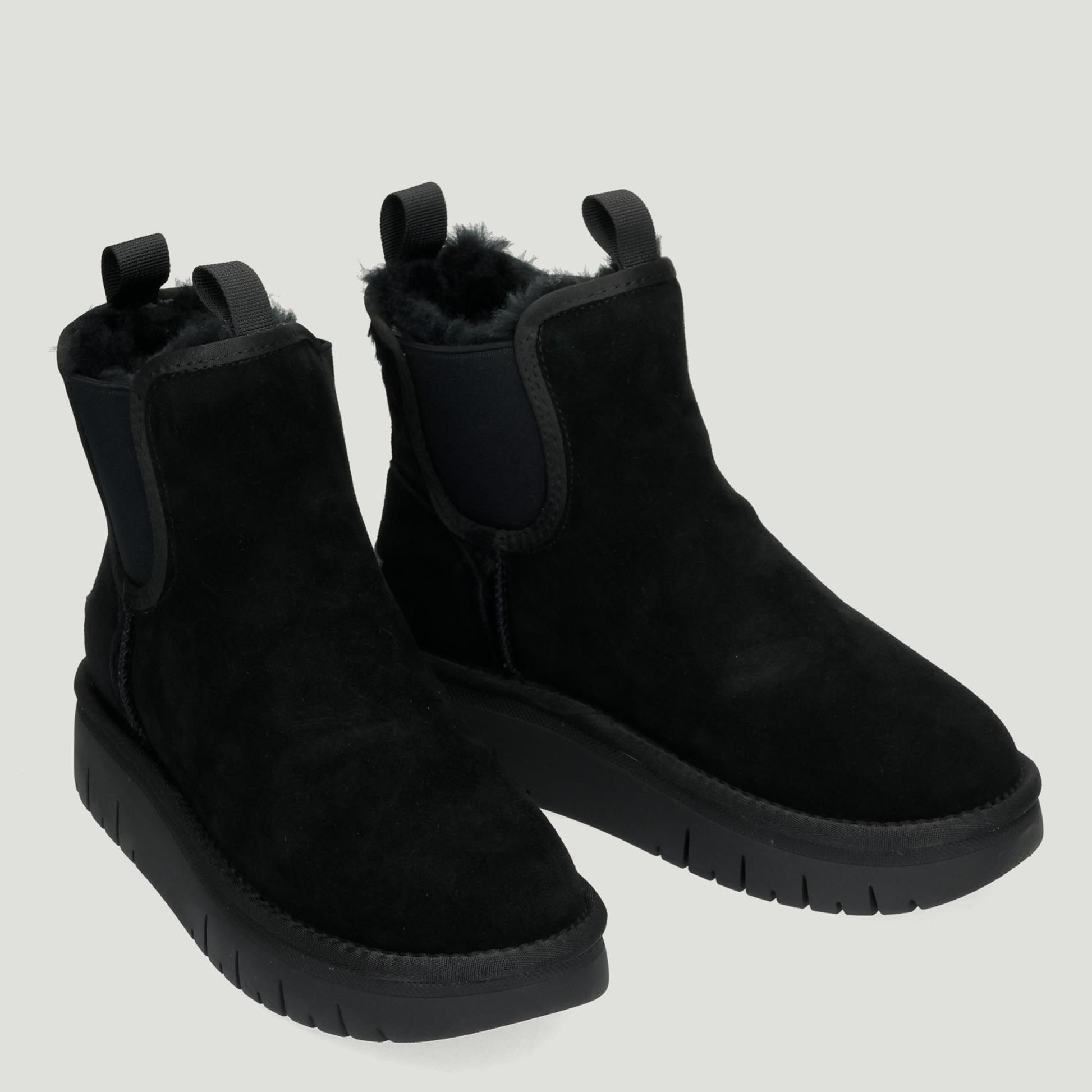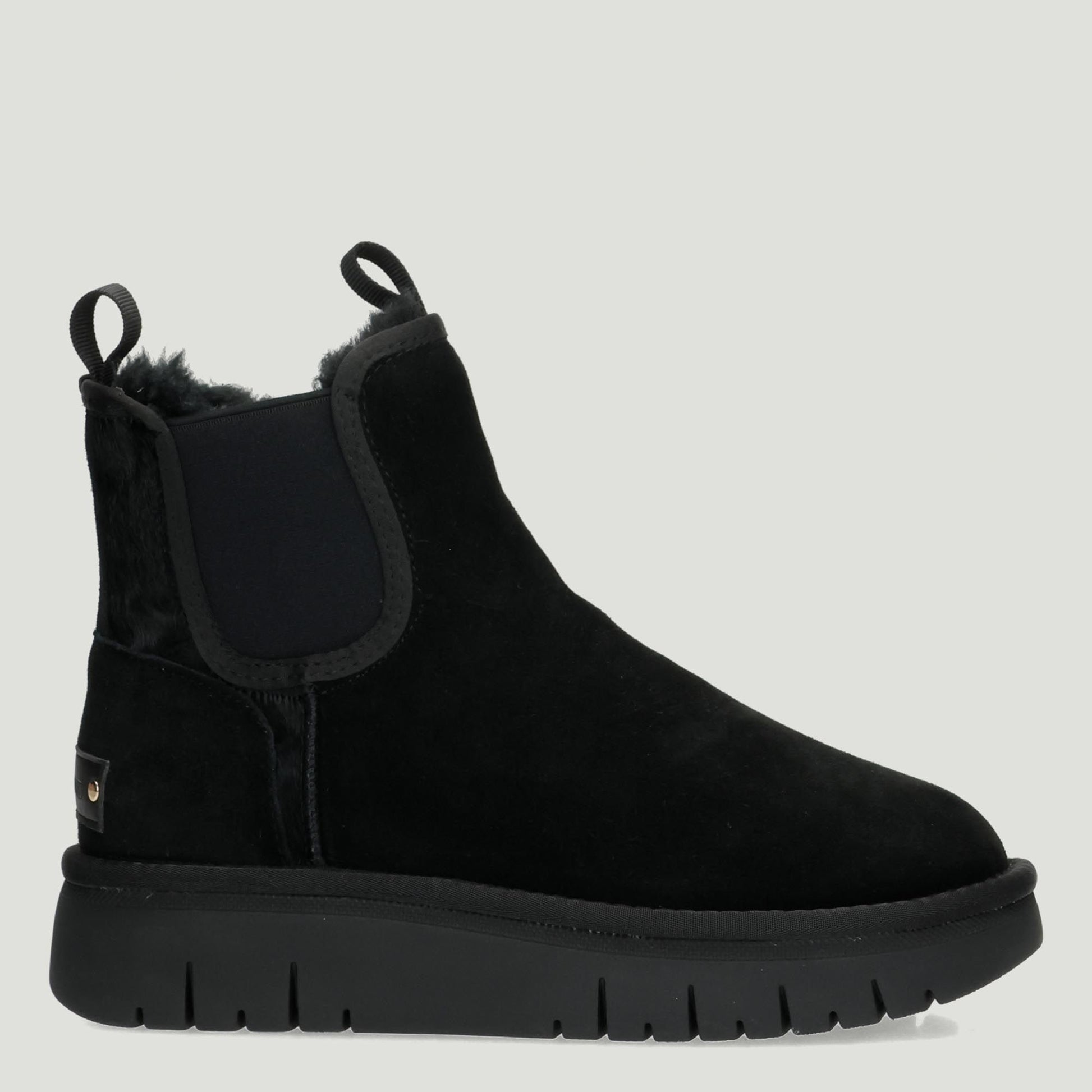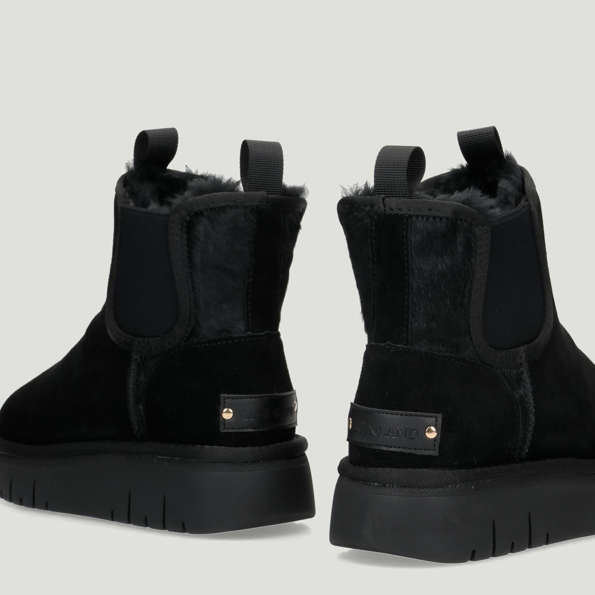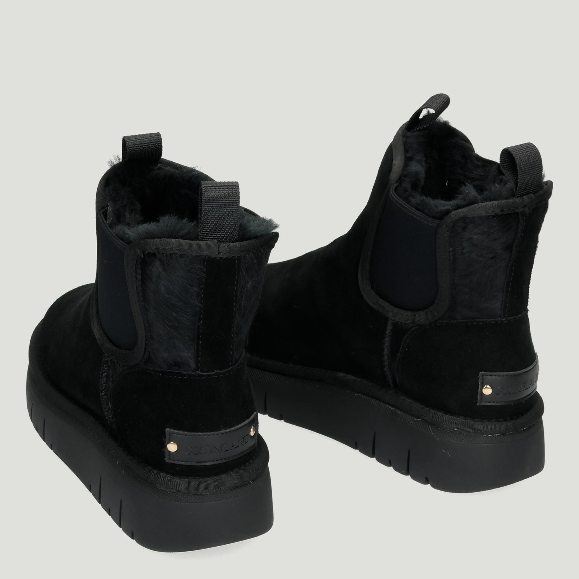 Stivaletto in pelle scamosciata nera con tallone in cavallino nero. Elastici laterali con profilo in tinta. Logo in pelle nel tallone. Interno in ecopelo. Suola in gomma platform di 4 cm. Collezione Grunland donna Autunno/Inverno.