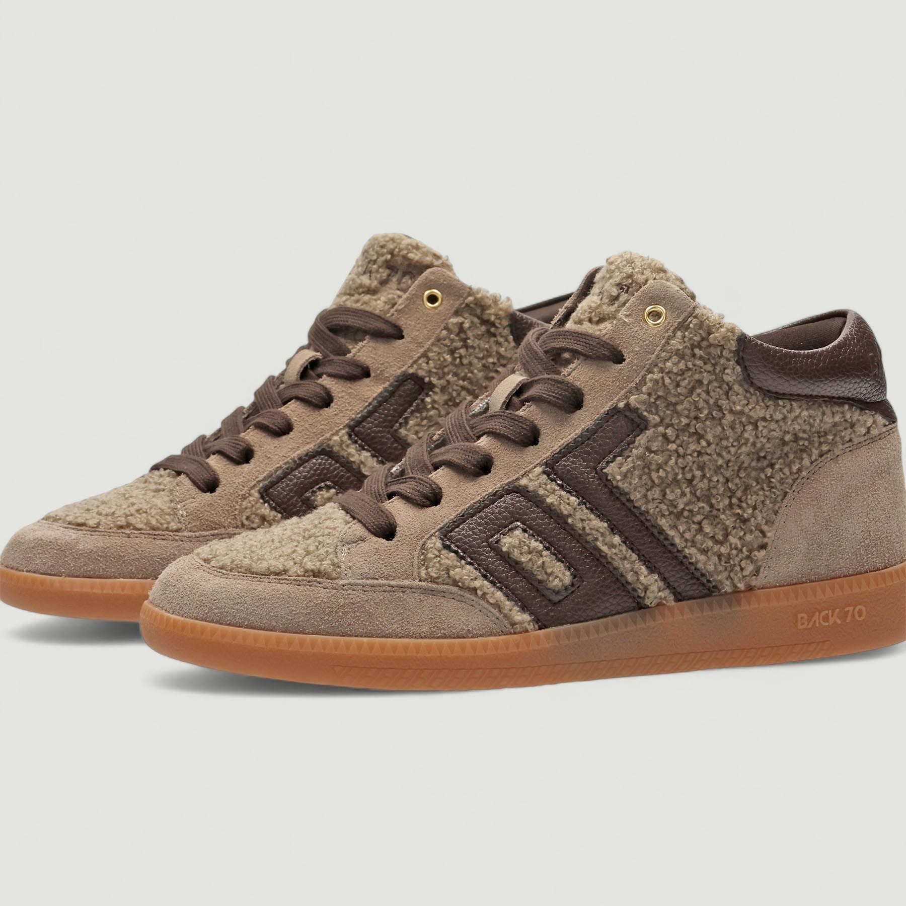 Snealkers alta in pelle e tessuto effetto lana riccia in colore taupe. Logo laterale in pelle testa di moro. Interno in tessuto con sottopiede estraibile. Suola in gomma color mastice. Collezione Back 70 donna autunno/inverno.