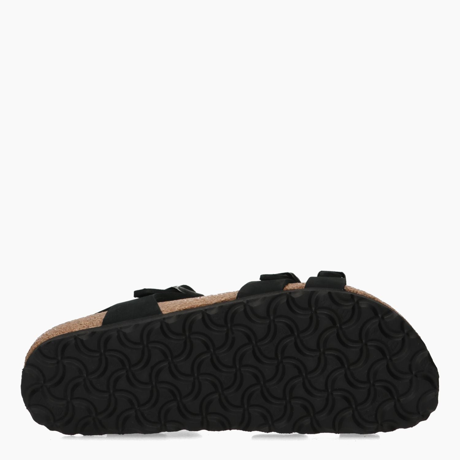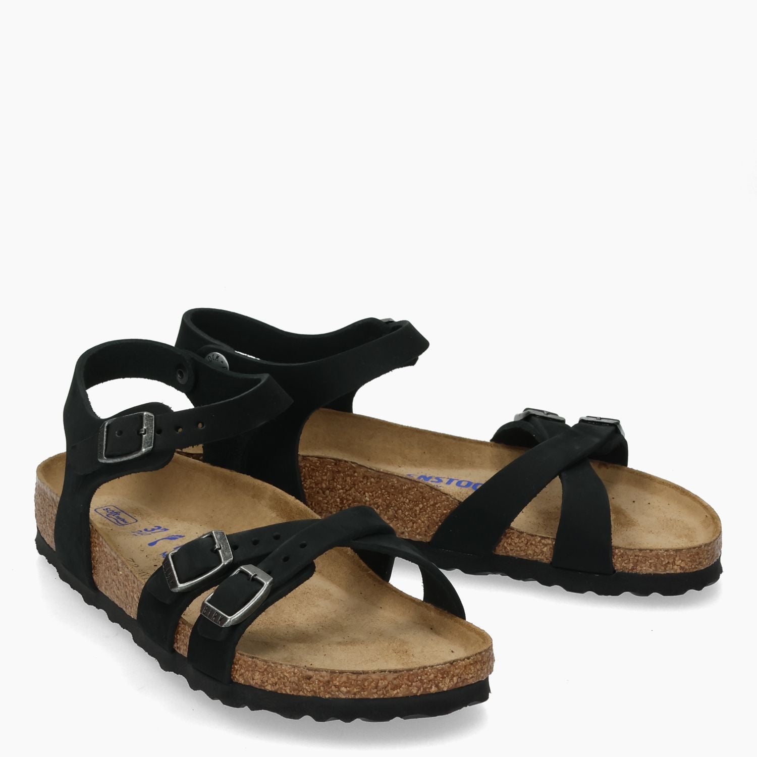 Sandalo modello Kumba SFB. Tomaia in nabuk in colore nero (black). Chiusura con fibbia logata in colore grigio. Sottopiede in pelle imbottito. Suola in gomma e sughero di 2 cm. Calzata stretta. Collezione Birkenstock donna.