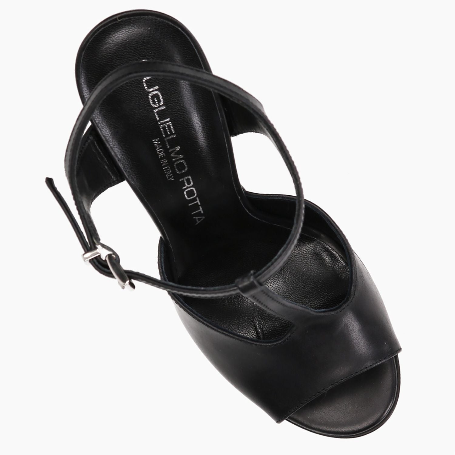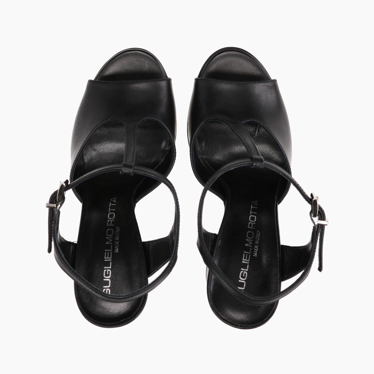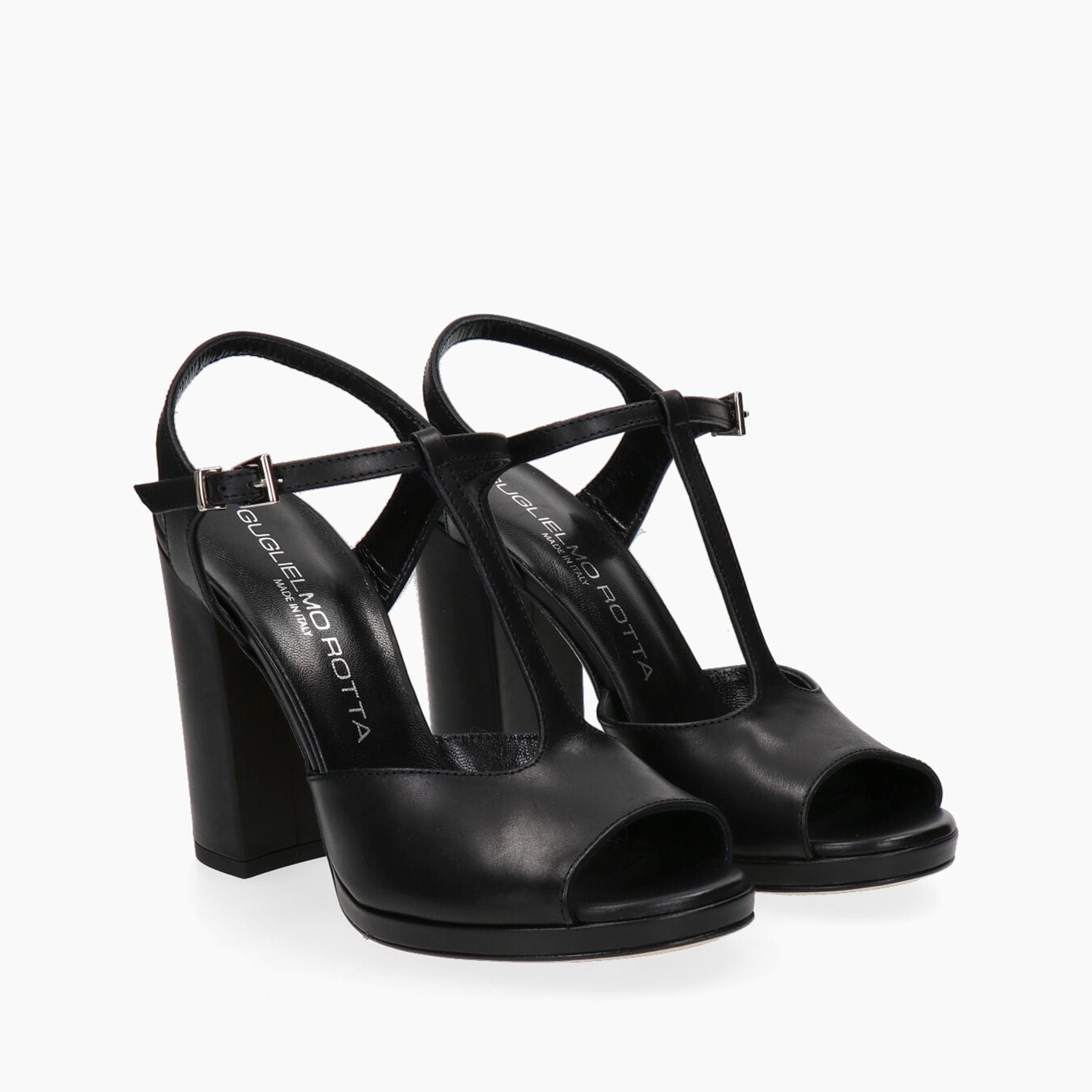 Sandali in pelle nera con cinturino a T, tacco 100 plateau 10, fondo cuoio.