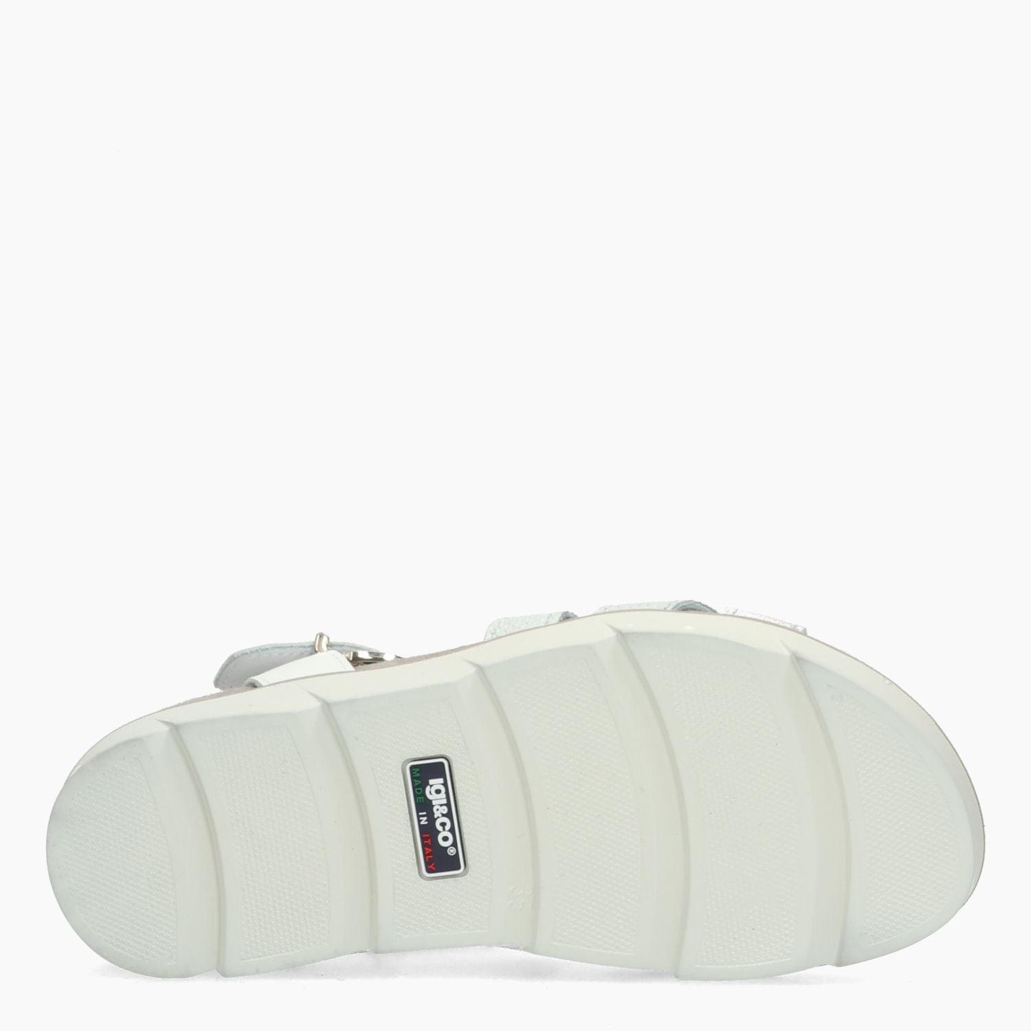 Sandalo in pelle stampata rettile argento e bianca. Interno in pelle con sottopiede conformato in microfibra. Suola in gomma con zeppa di 3 cm. Collezione Igi&Co donna Primavera/Estate.