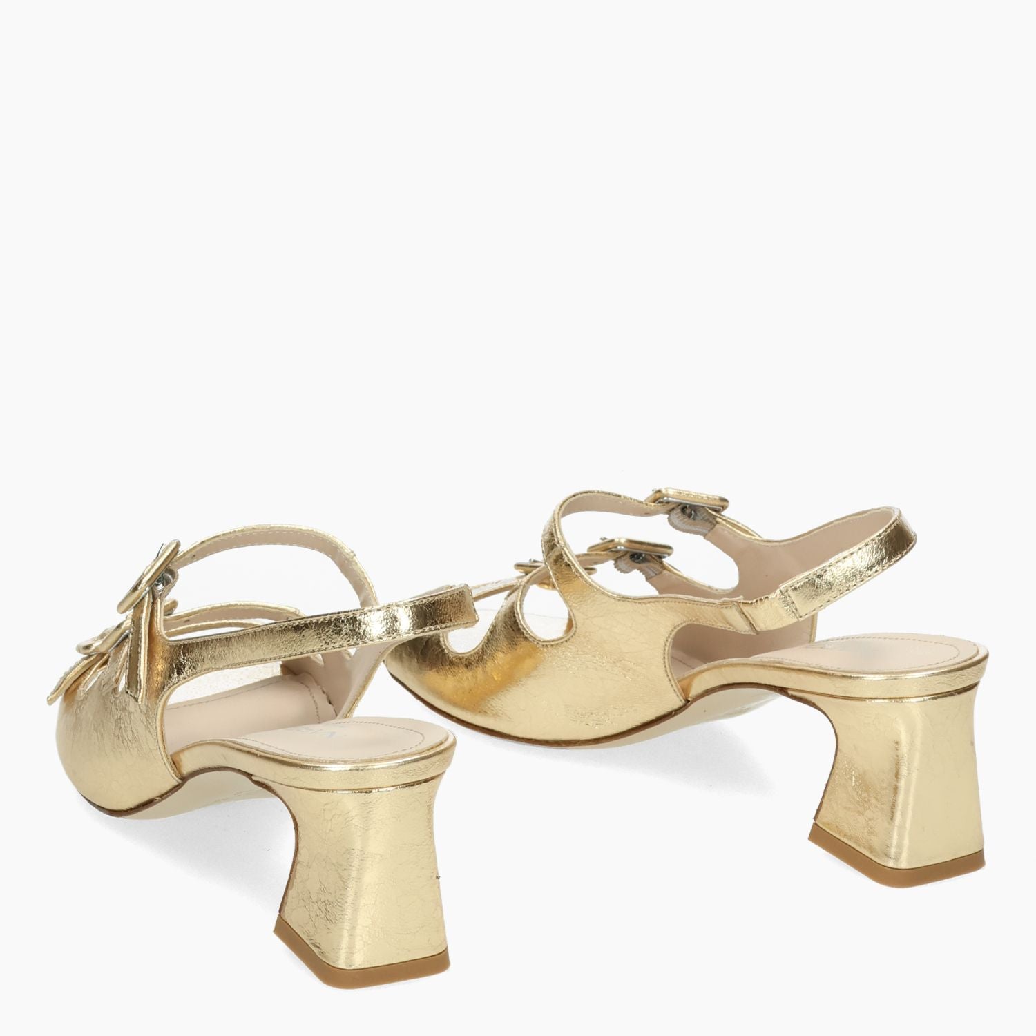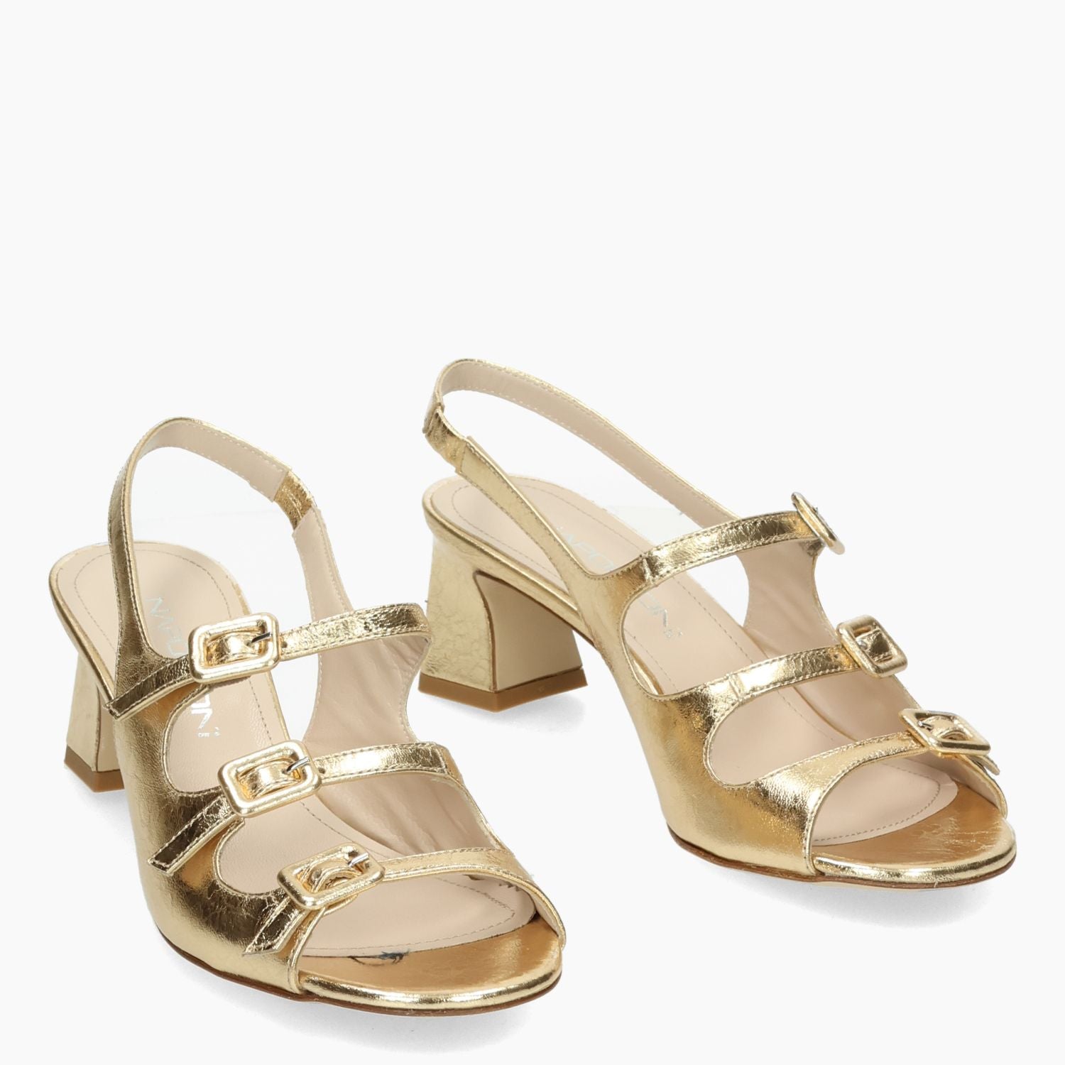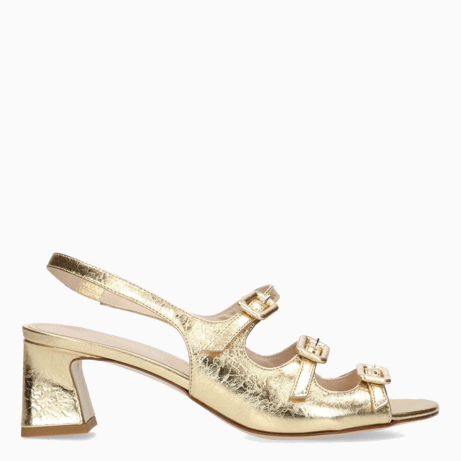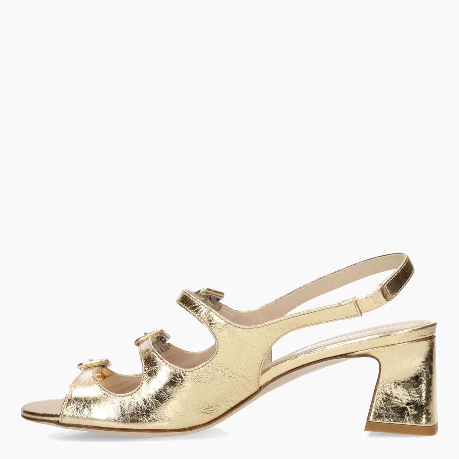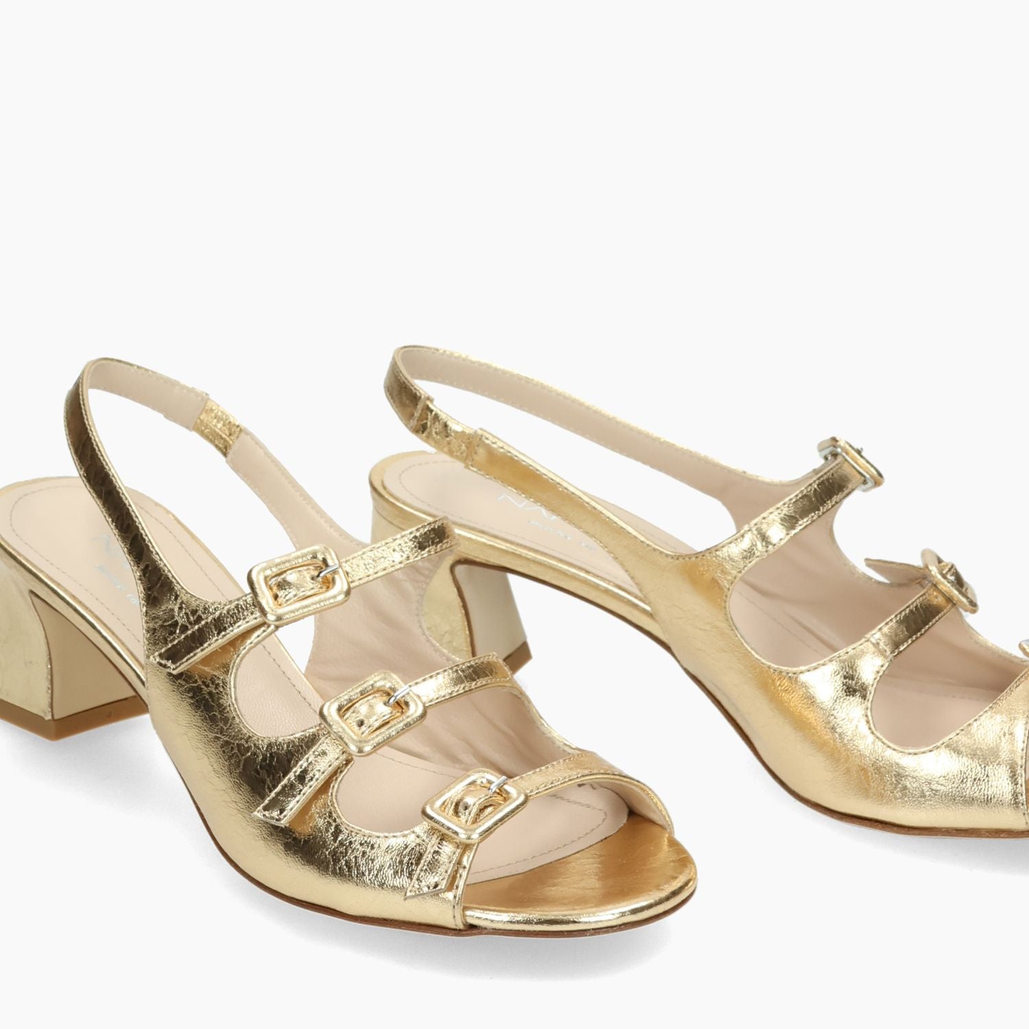Sandalo in pelle laminata oro con tre fibbie regolabili. Interno in pelle. Cinturino posteriore con elastico. Suola in cuoio con isola in gomma antiscivolo. Collezione Napoleoni donna primavera/estate.